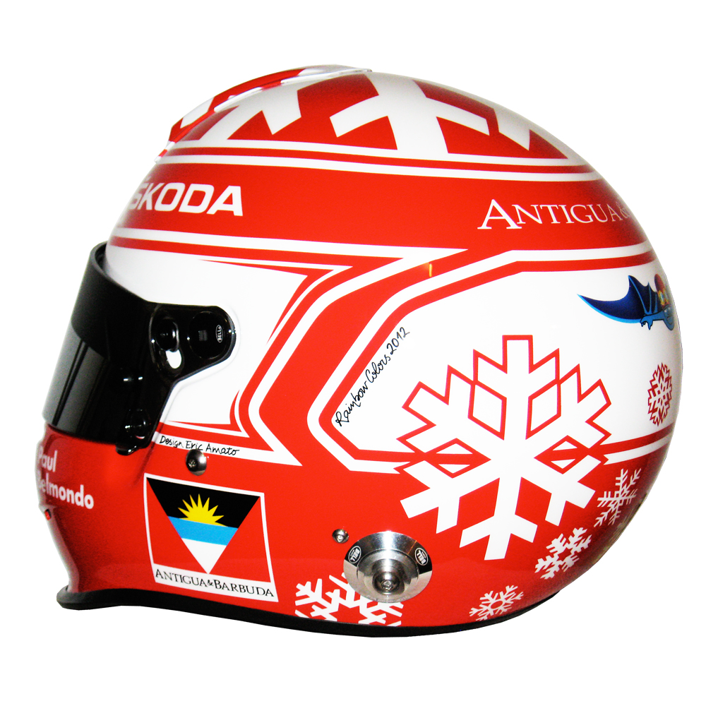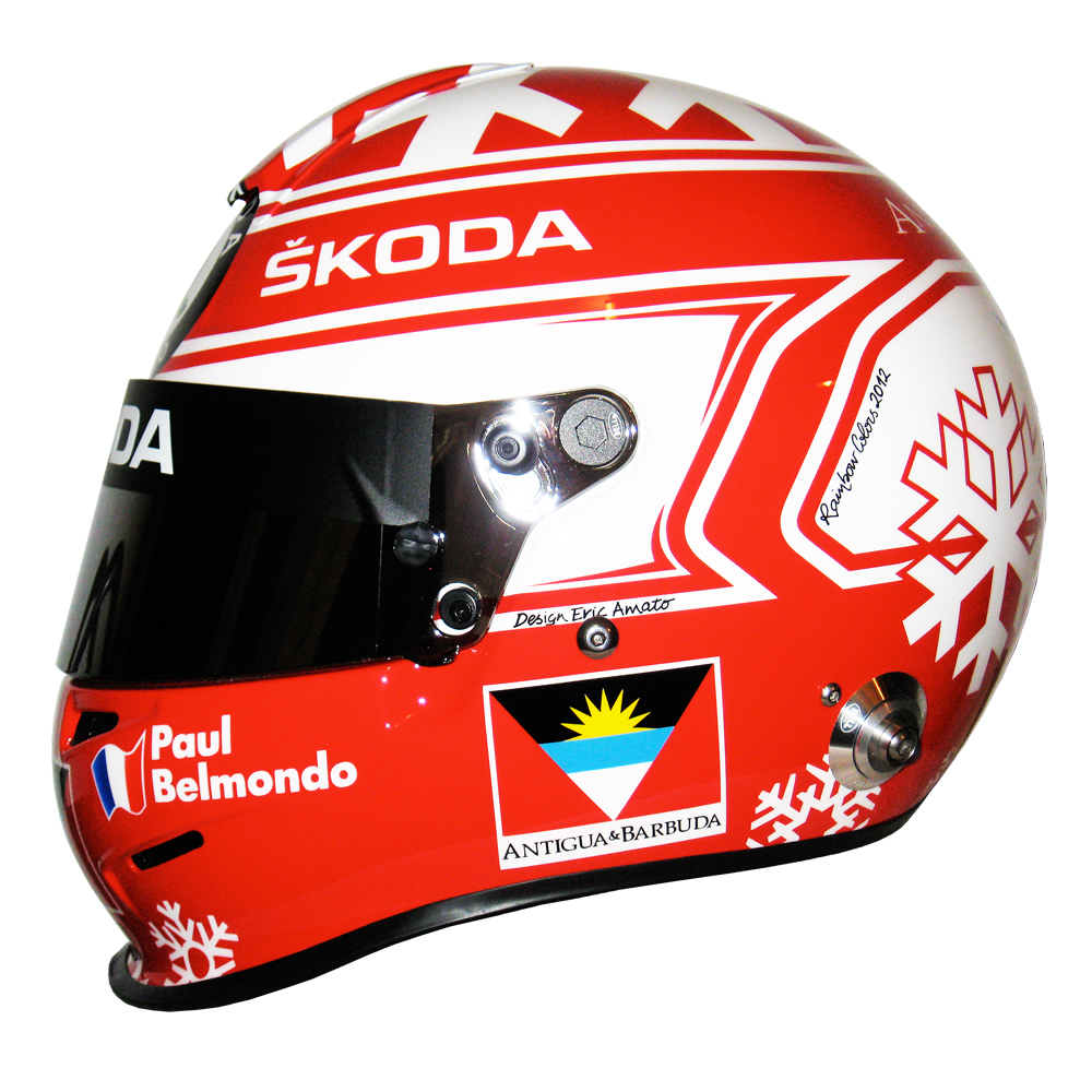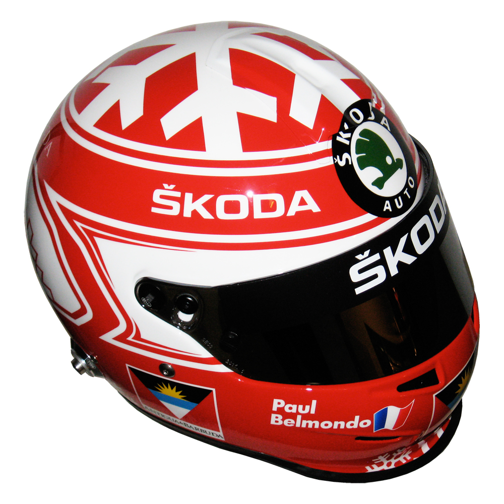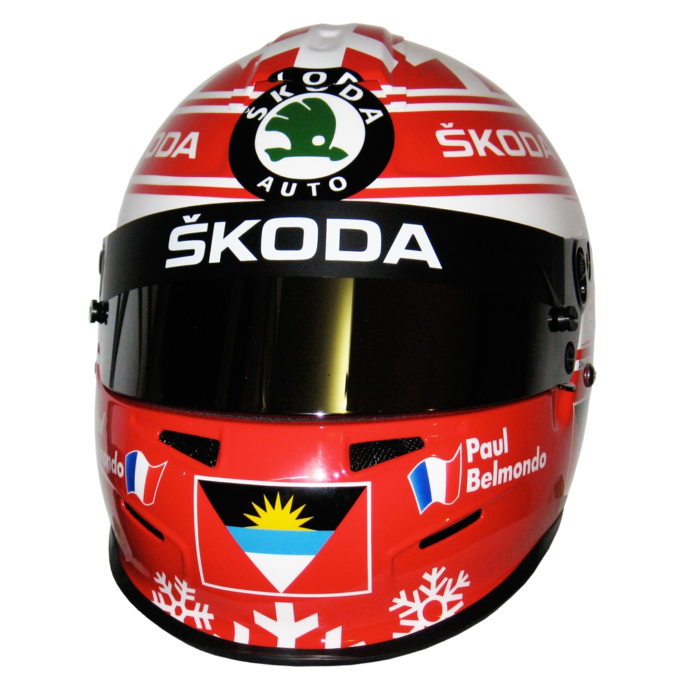 Formule 1 2012 Paul BELMONDO Casque Bell RS3, peint par Christian Roux / Rainbow Colors en 2012 pour Paul Belmondo, Team Skoda Trophée Andros. Précédent Suivant