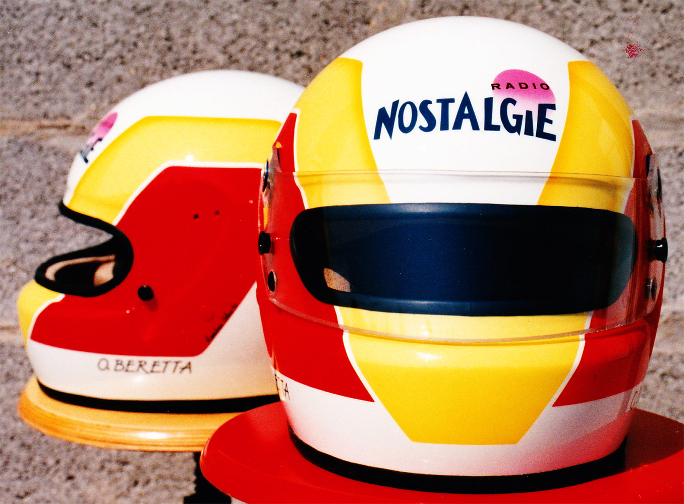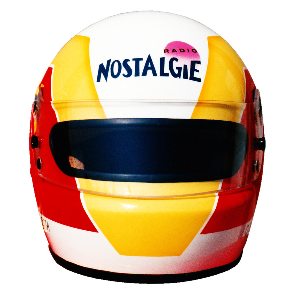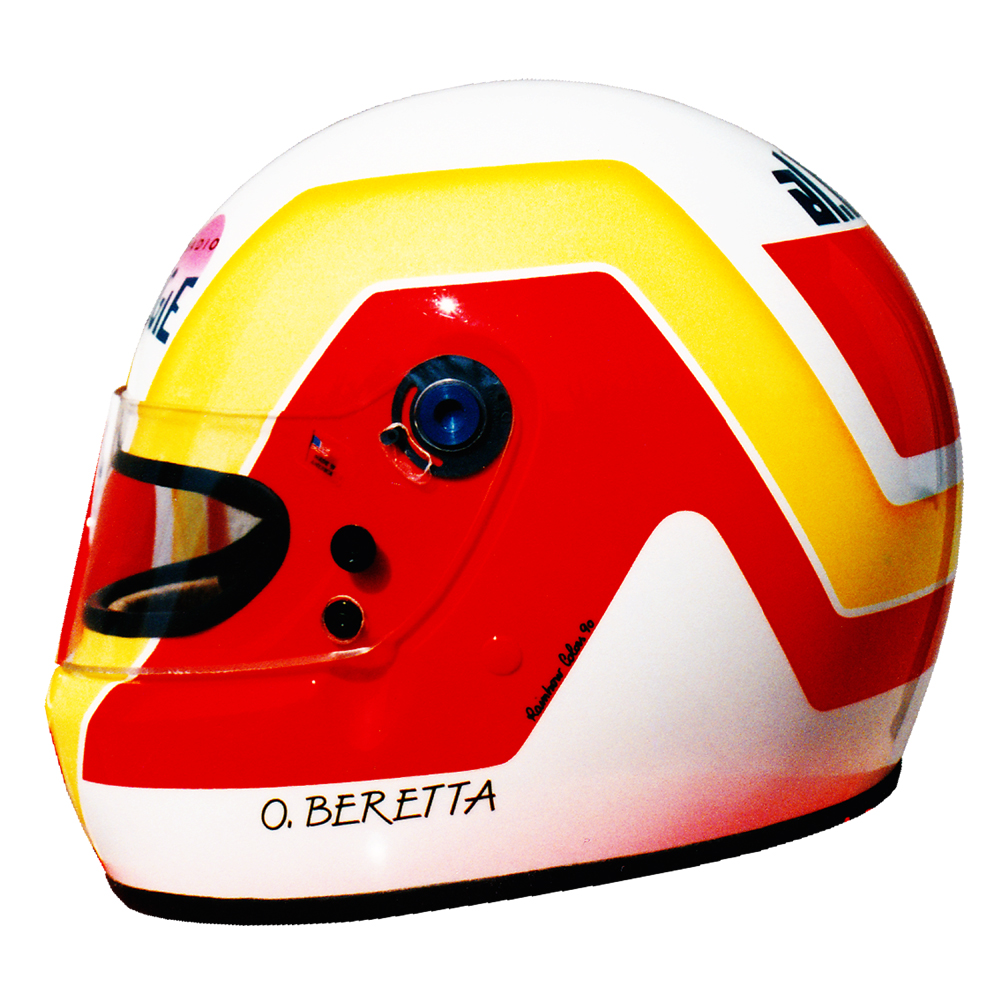 Formule 1 1990 Olivier BERETTA Casque Bell XFM-1, peint par Christian Roux / Rainbow Colors en 1990 pour Olivier Beretta, Formule 3 France et Italie, Ravarotto Racing Team. Précédent Suivant