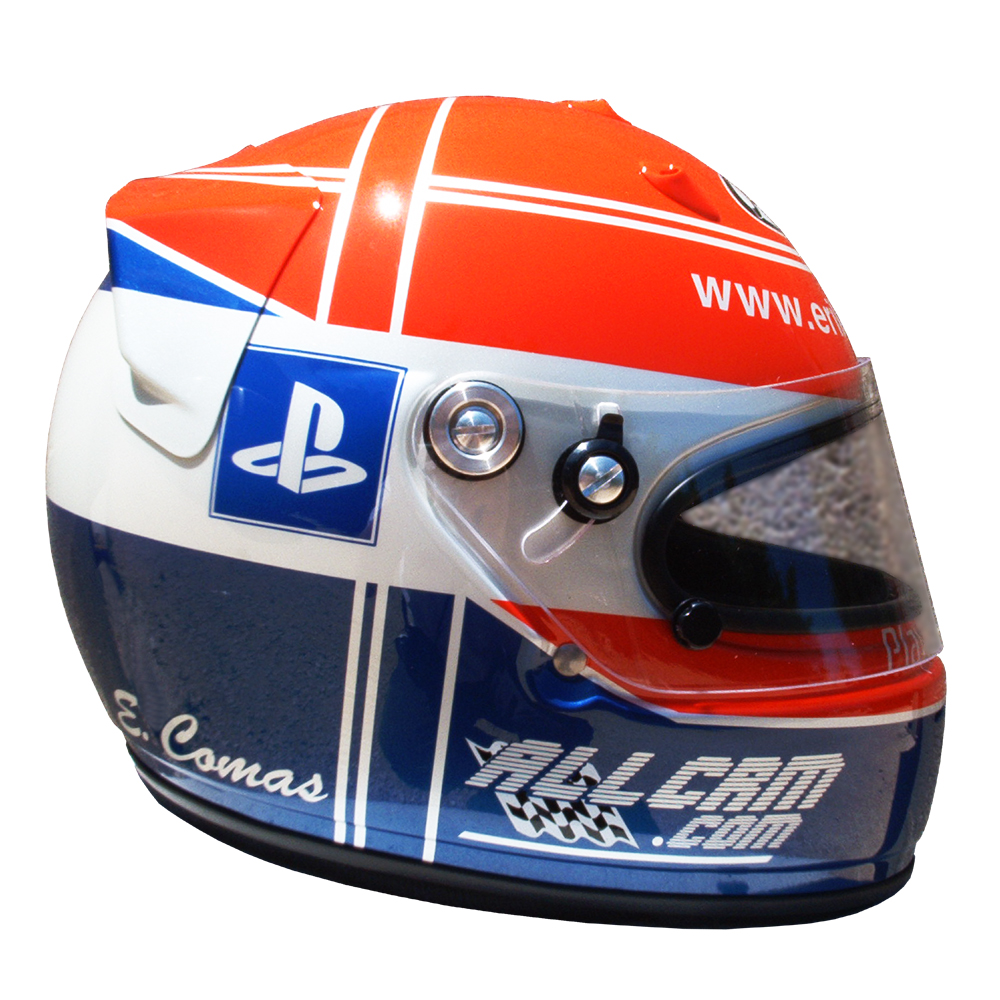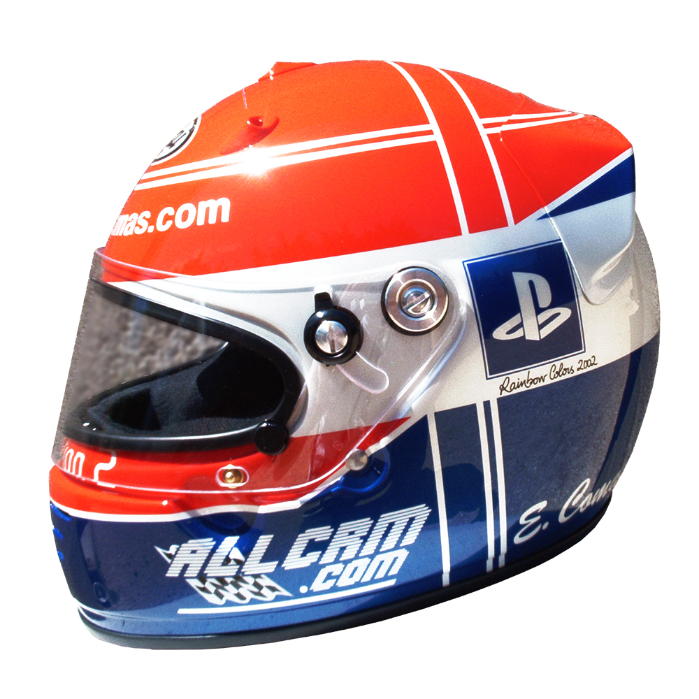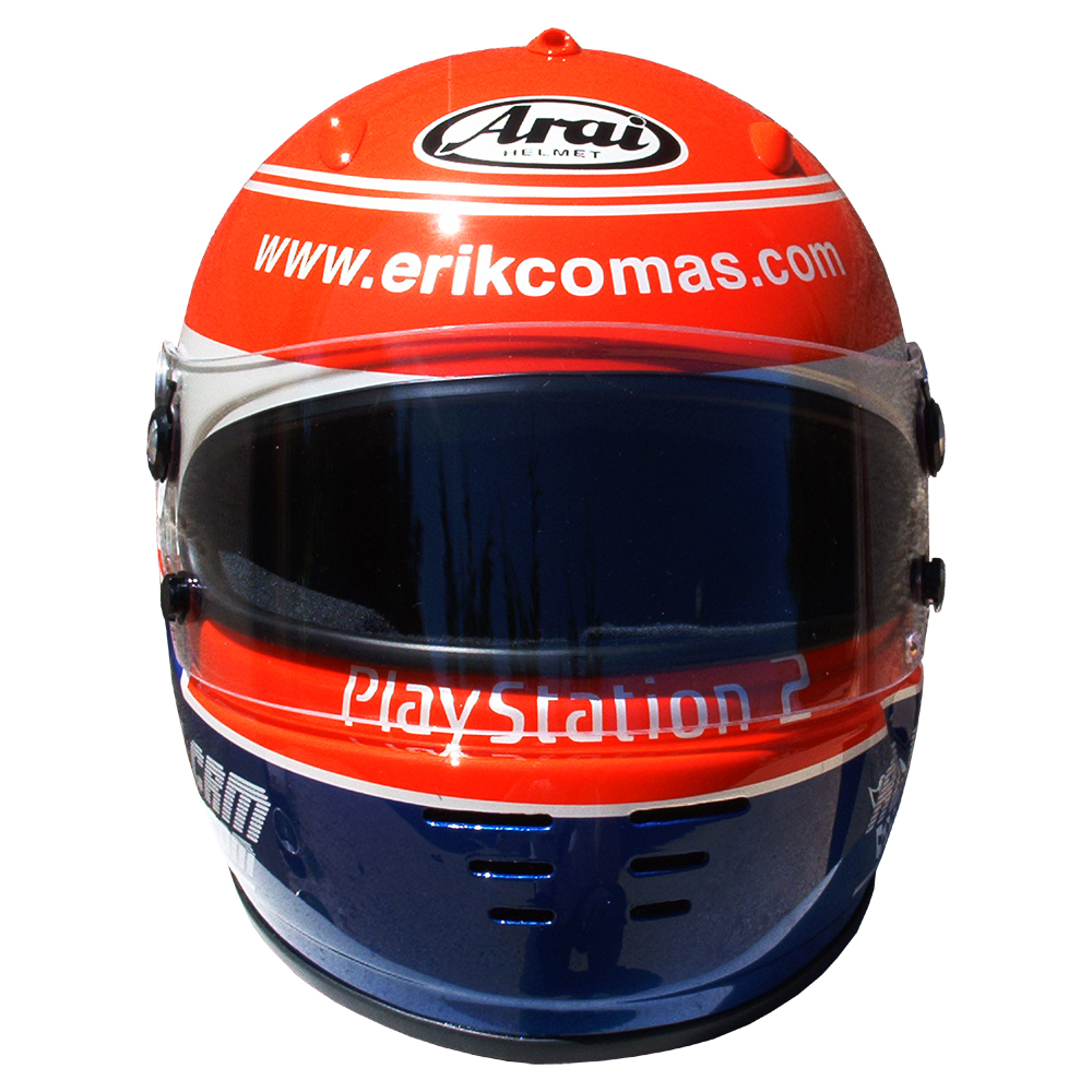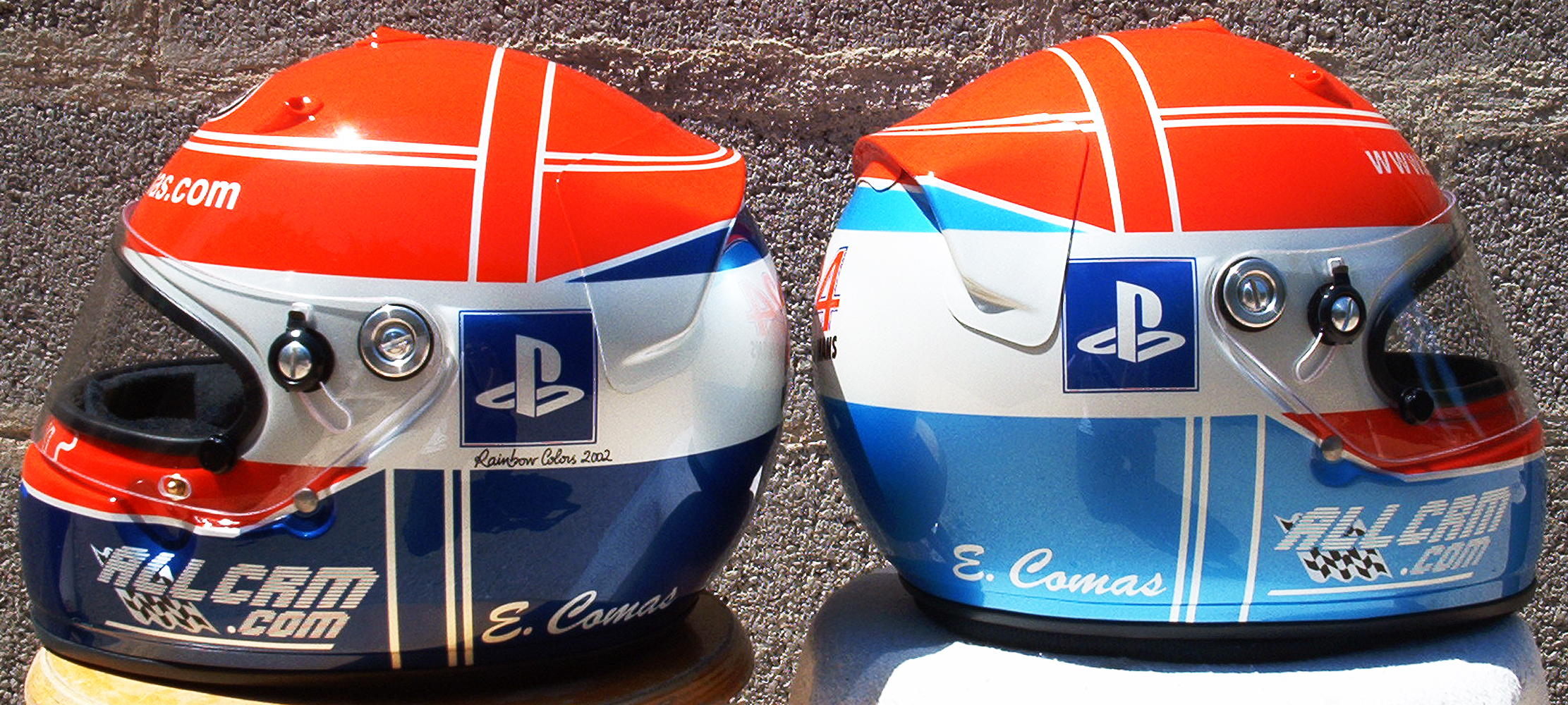 Formule 1 2002 Erik COMAS #2 Casque Arai GP 4 MK1, peint par Christian Roux / Rainbow Colors en 2002 pour Erik Comas, Playstation Team Oreca, 24 Heures du Mans. Précédent Suivant