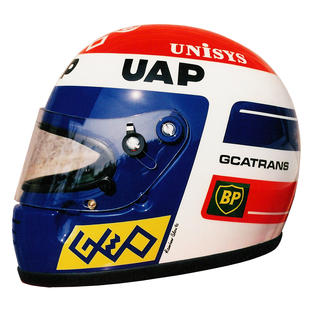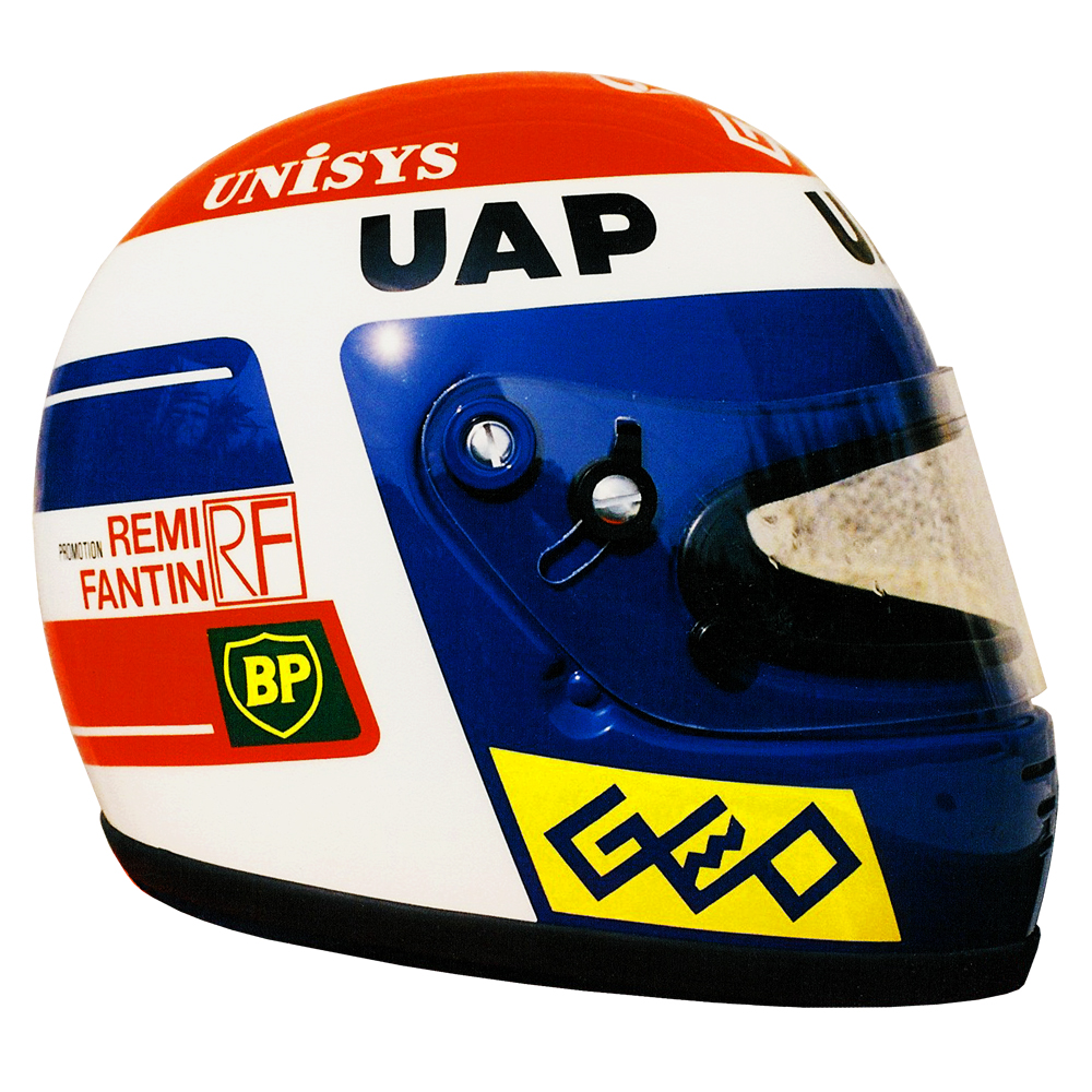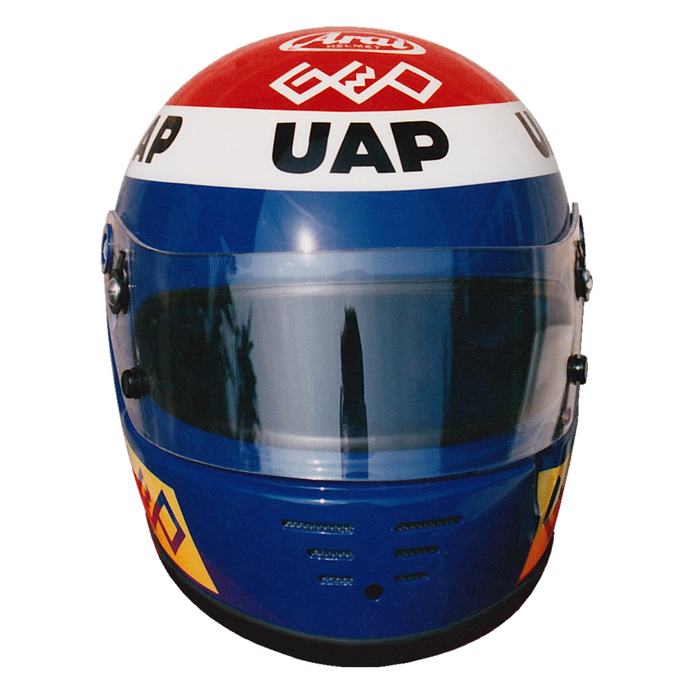 Formule 1 1990 Eric BERNARD #2 Casque Arai GP2, peint par Christian Roux / Rainbow Colors en 1990 pour Eric Bernard, Écurie ESPO Larrousse Lola-Lamborghini, Championnat du Monde de Formule 1. Précédent Suivant