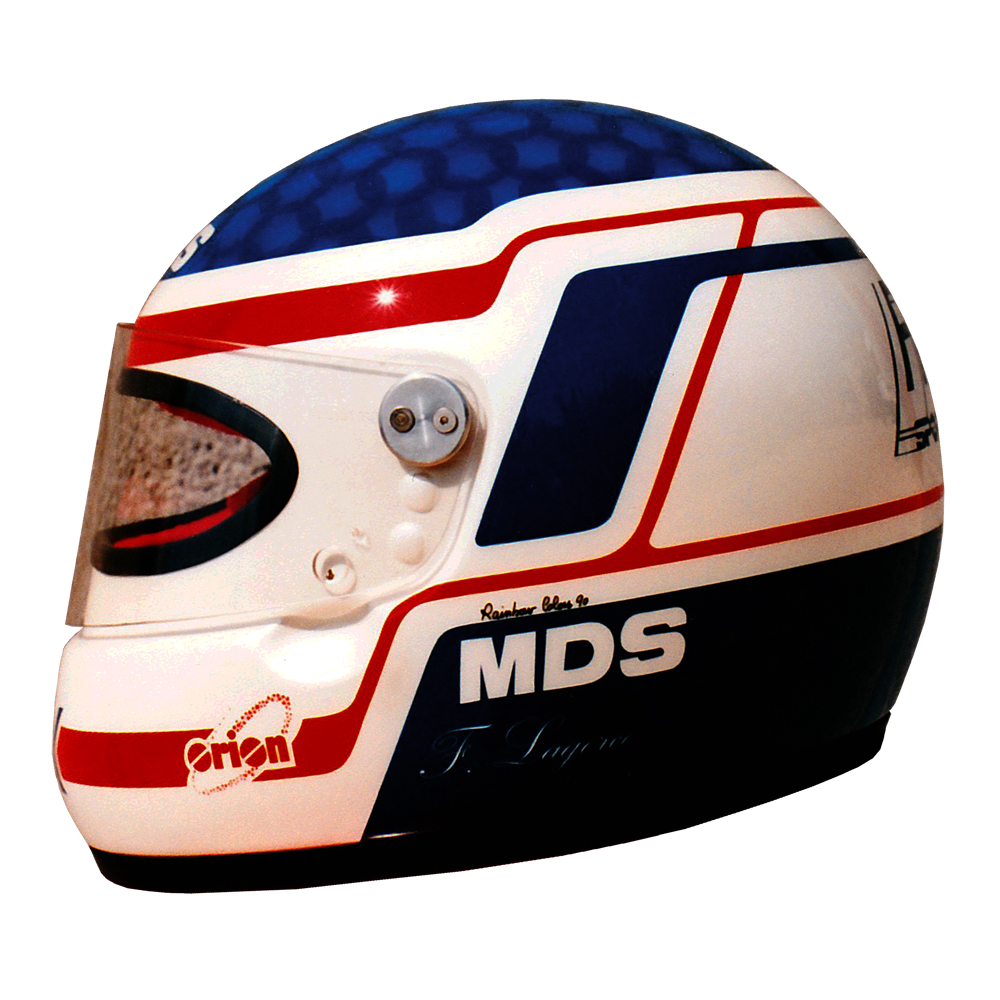Formule 1 1990 Franck LAGORCE #1 Casque MDS F1, peint par Christian Roux / Rainbow Colors en 1990 pour Franck Lagorce, Écurie Motul Nogaro, 2ème du Championnat de France de Formule Renault. Précédent Suivant
