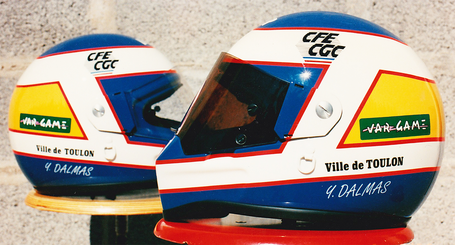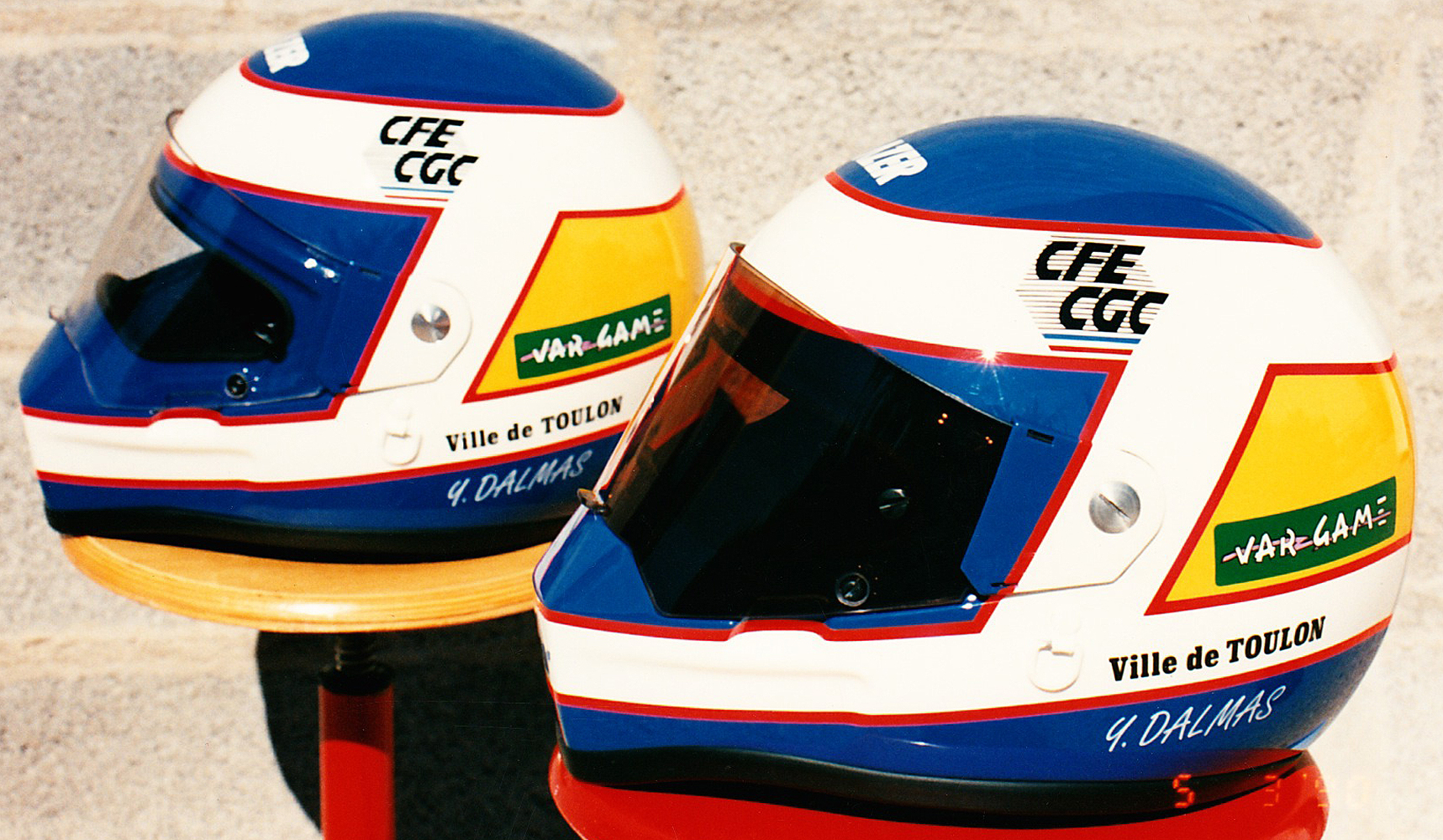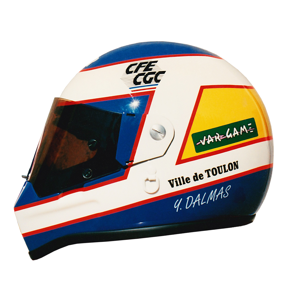 Formule 1 1990 Yannick DALMAS #2 & #3 Casques Lazer F1, peint par Christian Roux / Rainbow Colors en 1990 pour Yannick Dalmas, Écurie AGS, Championnat du Monde de Formule 1. Précédent Suivant