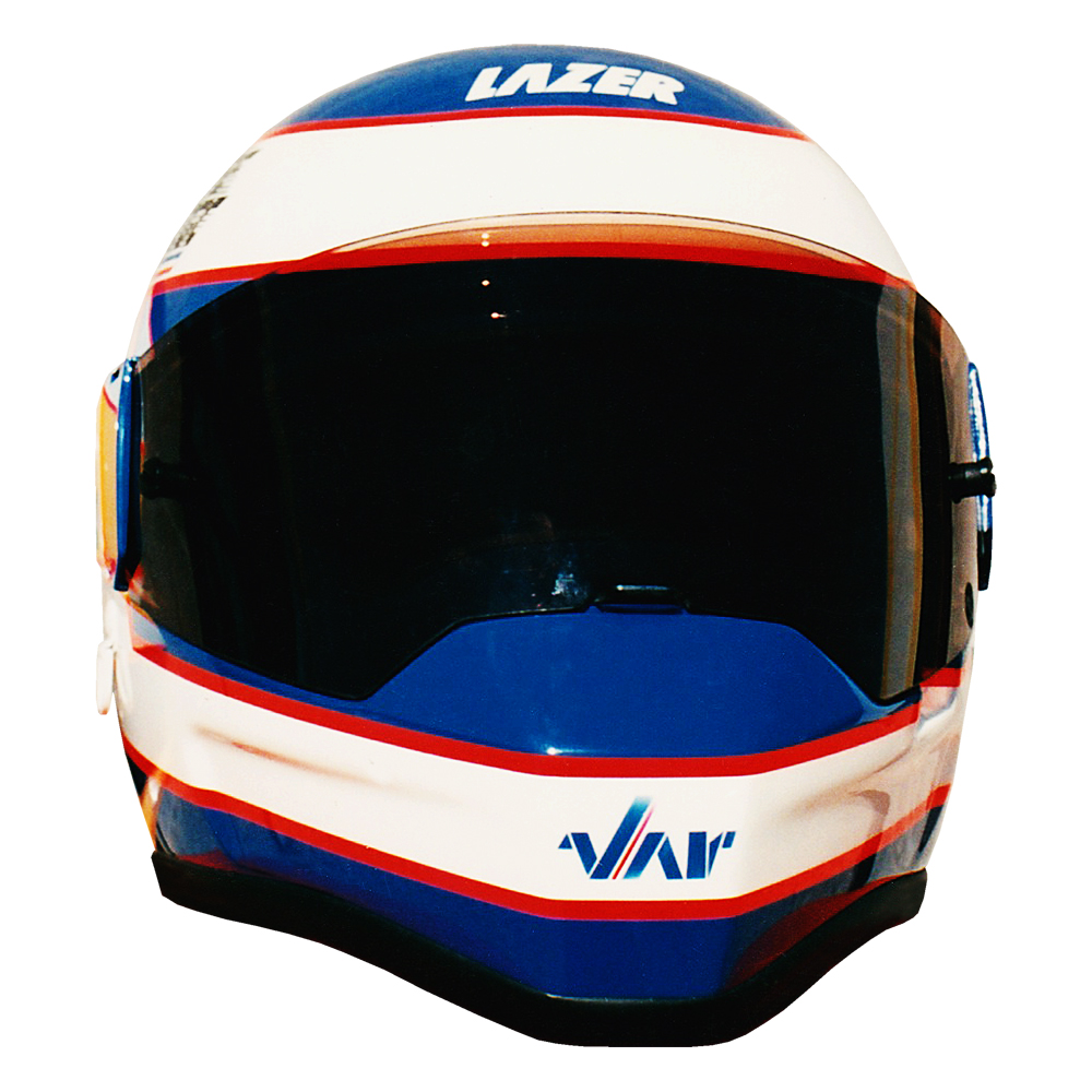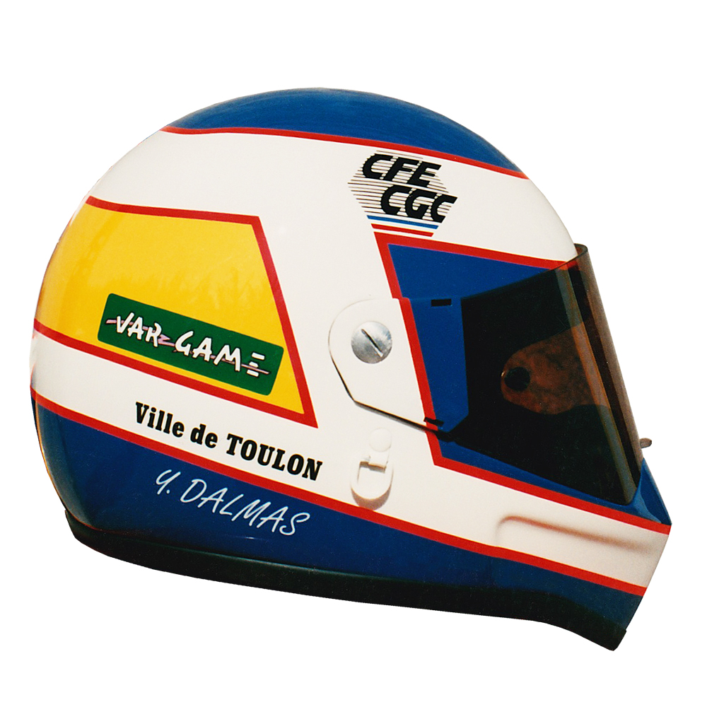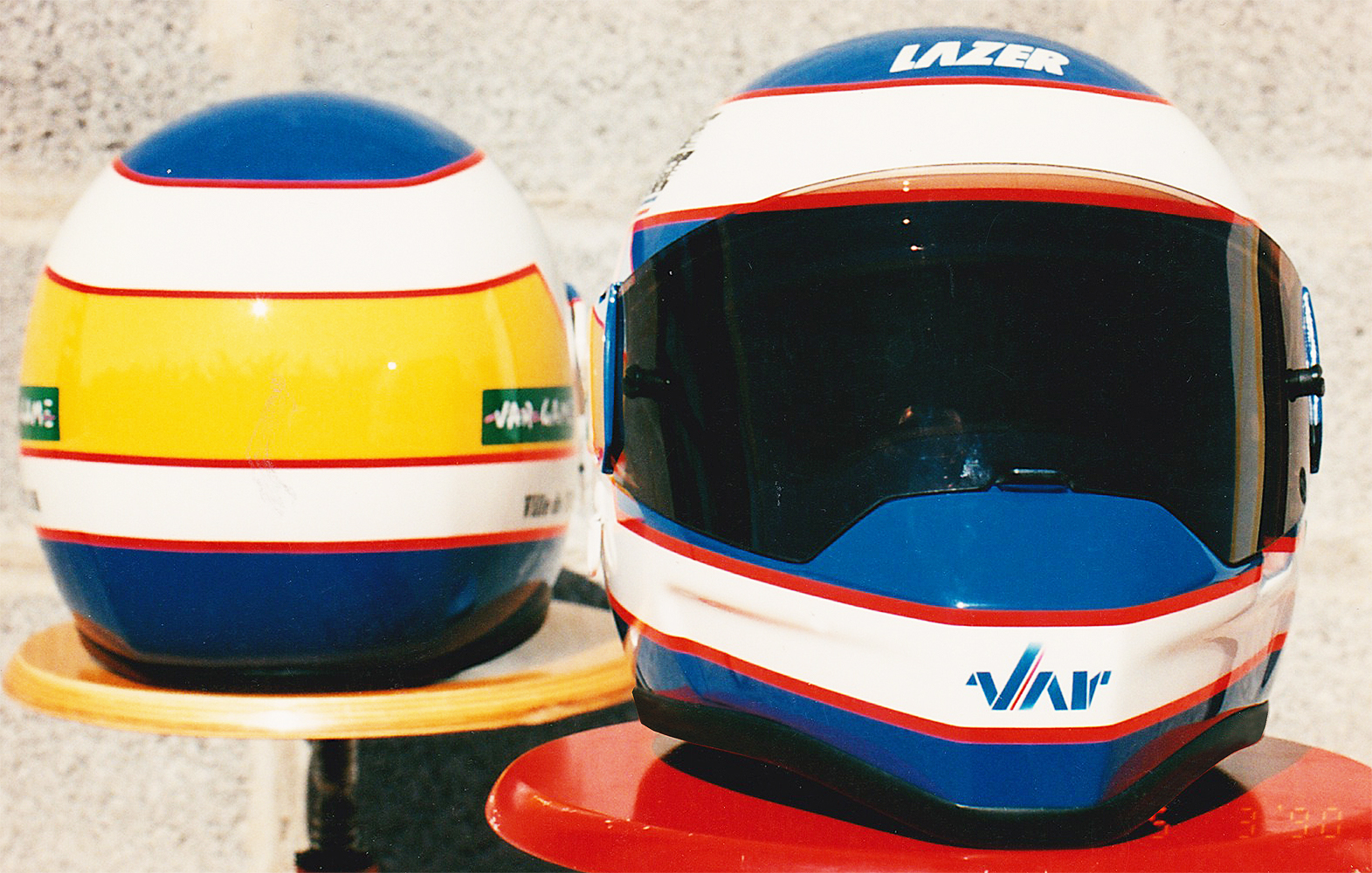 Formule 1 1990 Yannick DALMAS #2 & #3 Casques Lazer F1, peint par Christian Roux / Rainbow Colors en 1990 pour Yannick Dalmas, Écurie AGS, Championnat du Monde de Formule 1. Précédent Suivant