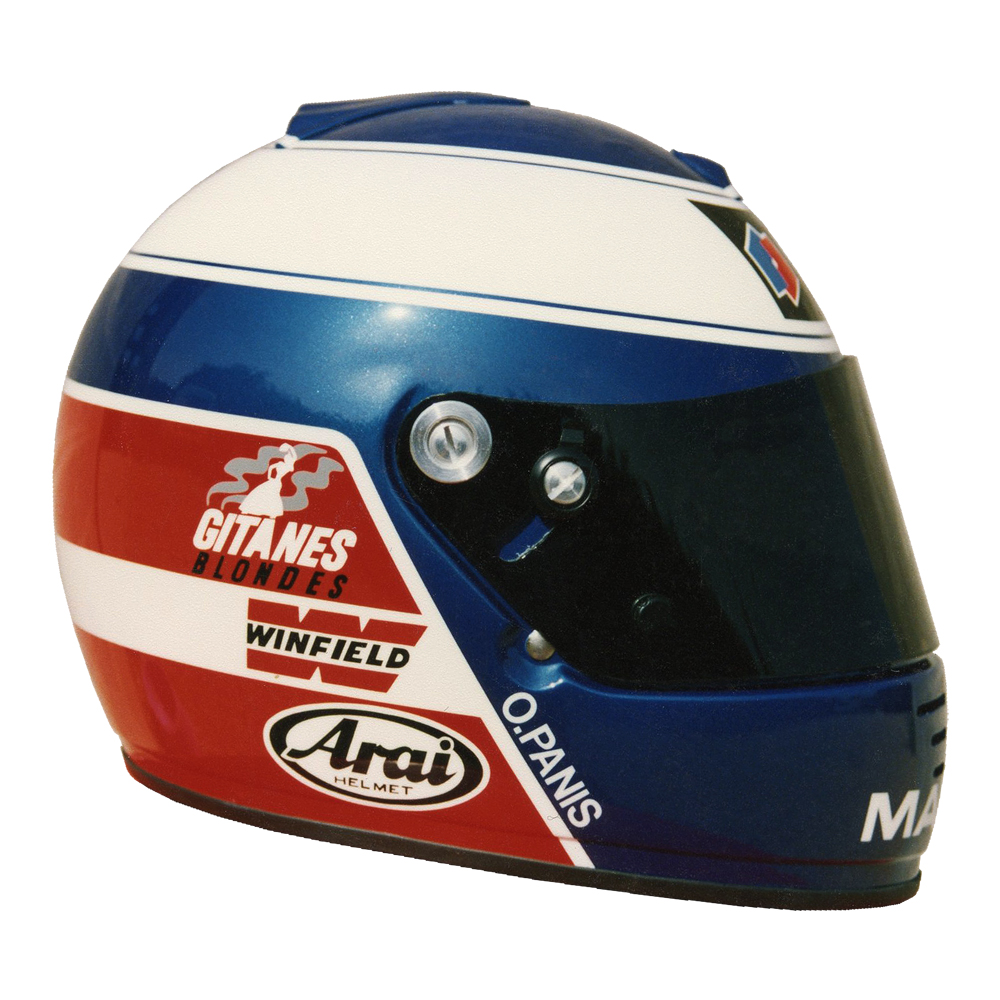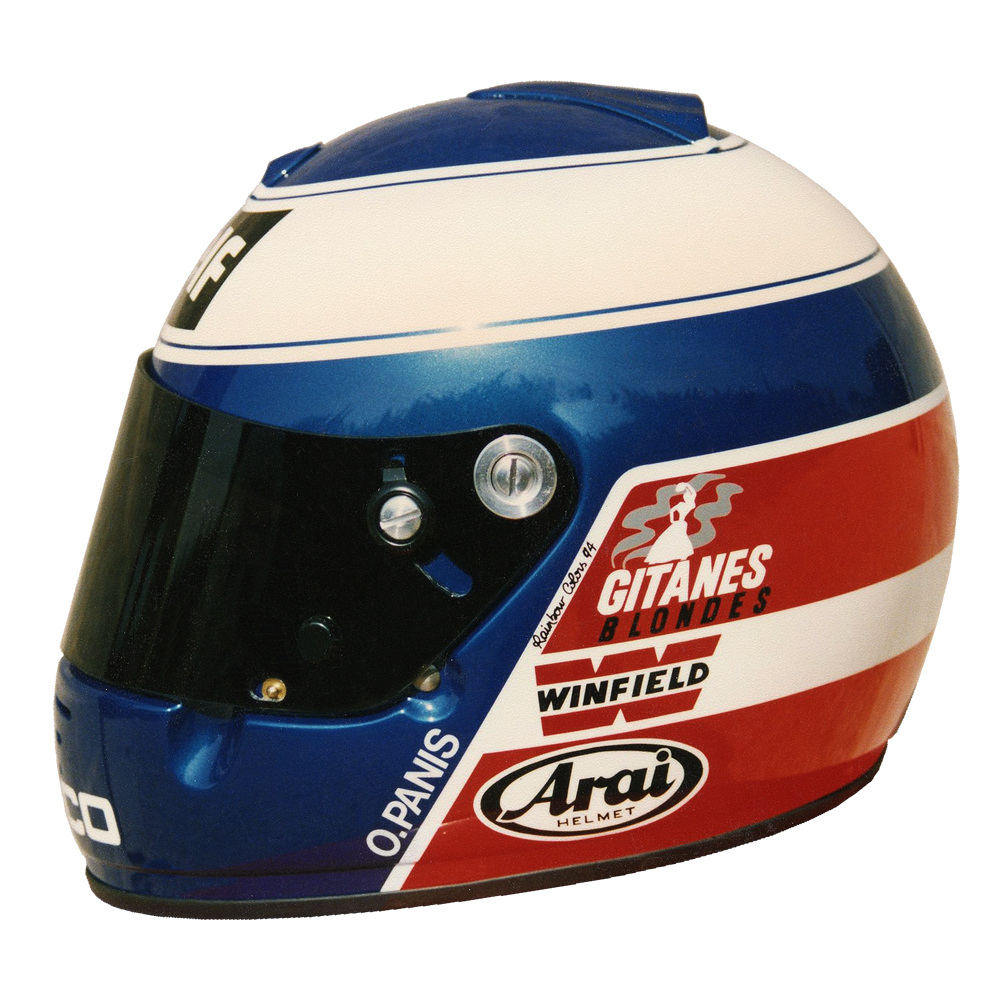 Formule 1 1994 Olivier PANIS #3 Casque Arai GP 4, peint par Christian Roux / Rainbow Colors en 1994 pour Olivier Panis, Team Ligier Gitanes Blondes, Championnat du Monde de Formule 1. Précédent Suivant