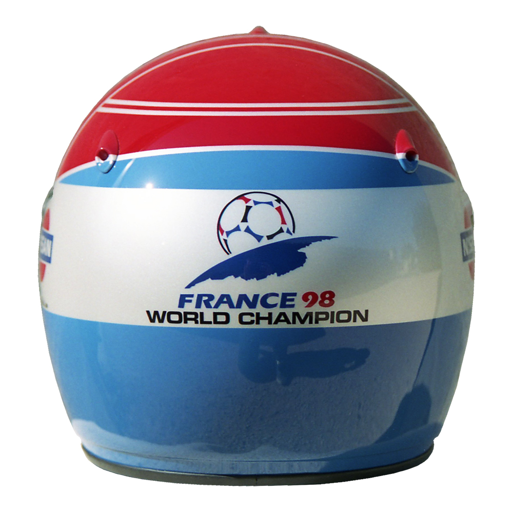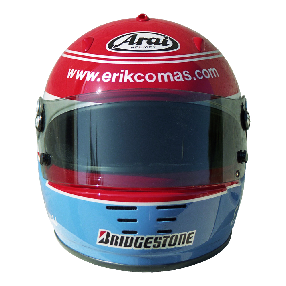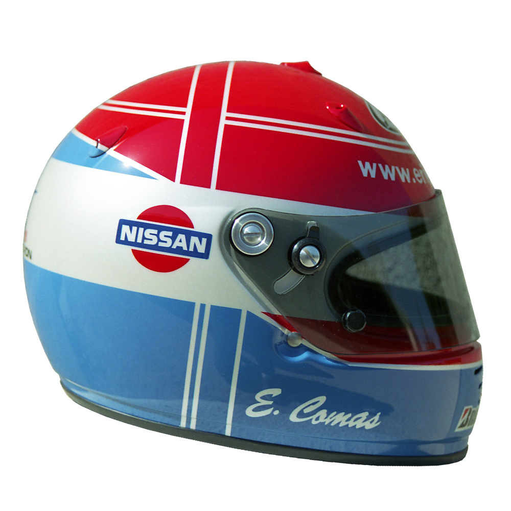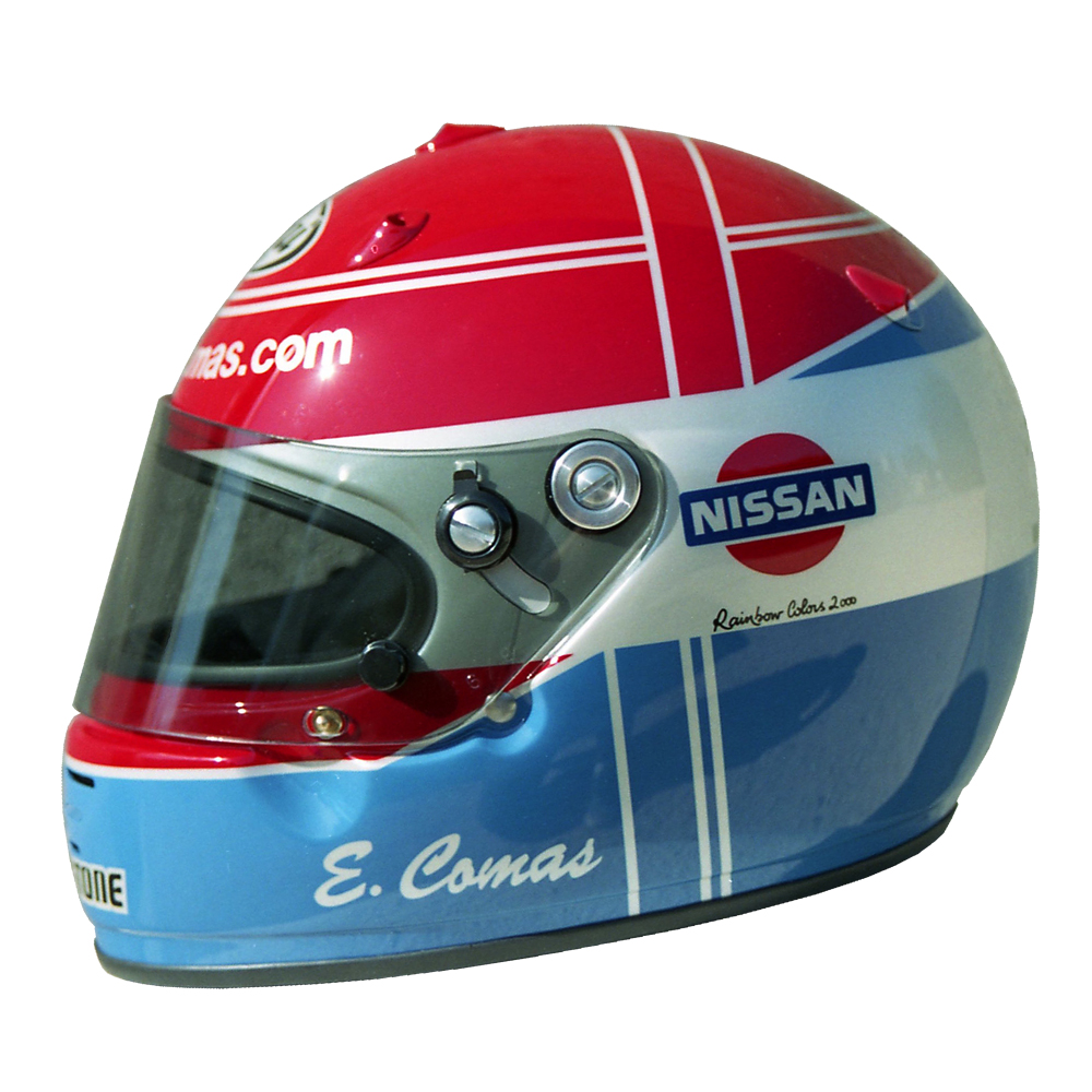Formule 1 2000 Erik COMAS #1 Casque Arai GP 4, peint par Christian Roux / Rainbow Colors en 2000 pour Erik Comas, Team Nismo, Vice Champion du Championnat du Japon GT 500. Précédent Suivant