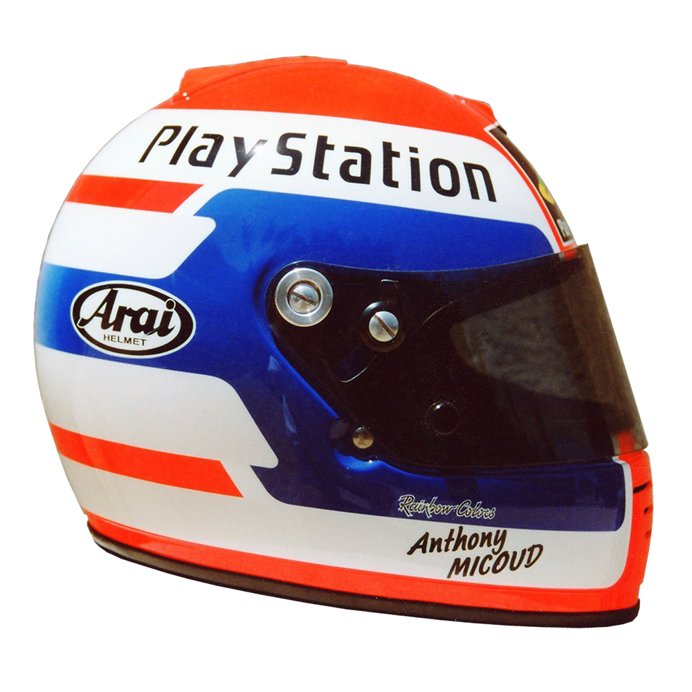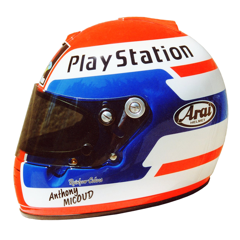Karting 2002 Anthony MICOUD Casque Arai GP 3, peint par Christian Roux / Rainbow Colors en 2002 pour Anthony Micoud, Minikart. Précédent Suivant