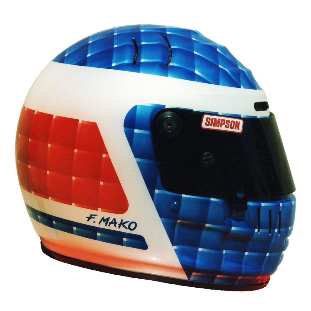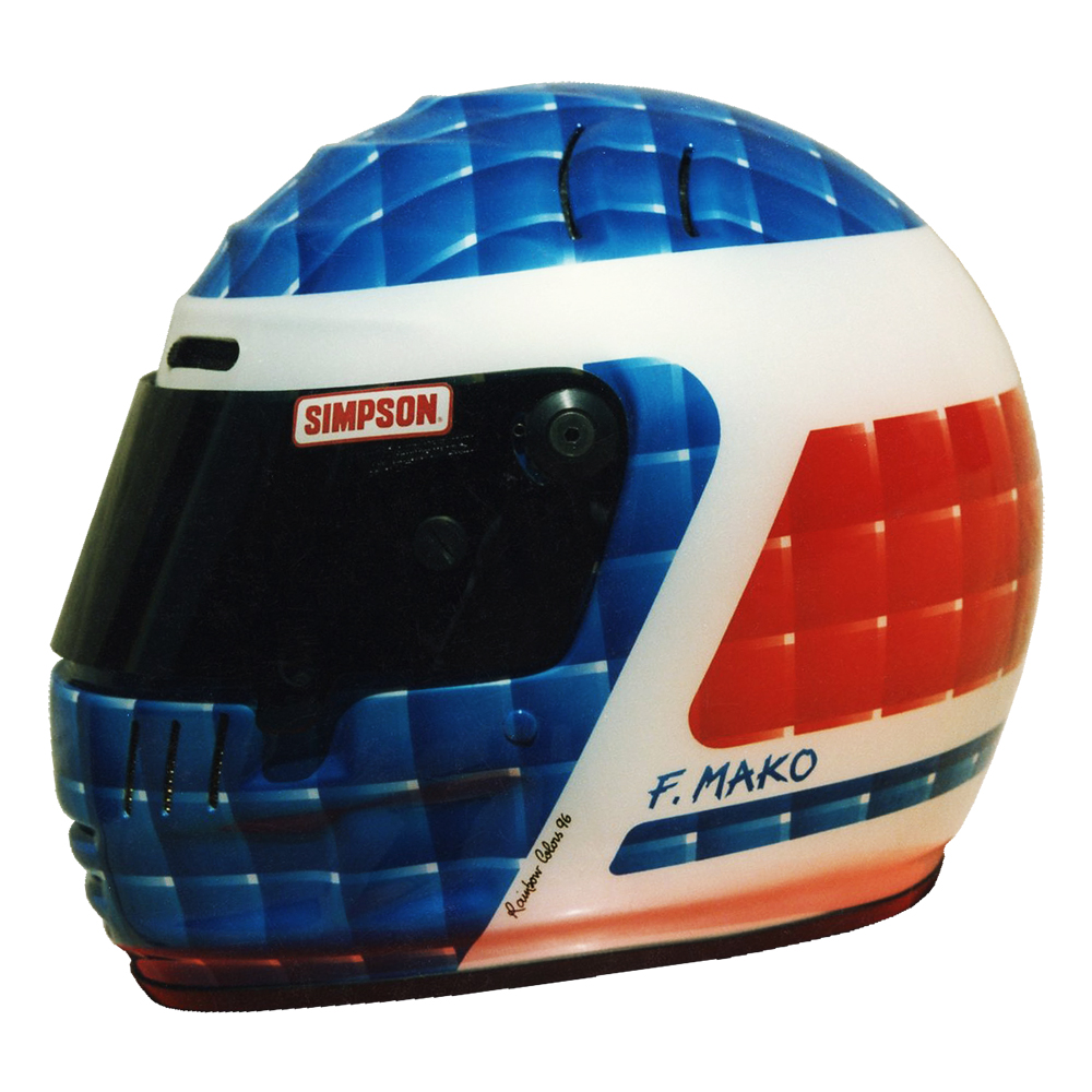 Karting 1996 Frédéric MAKOWIECKI Casque Simpson Super Shark, crée et peint par Christian Roux / Rainbow Colors en 1996 pour Frédéric Makowiecki. Précédent Suivant