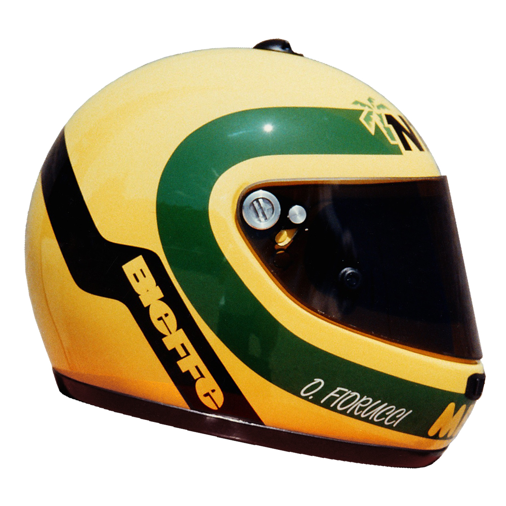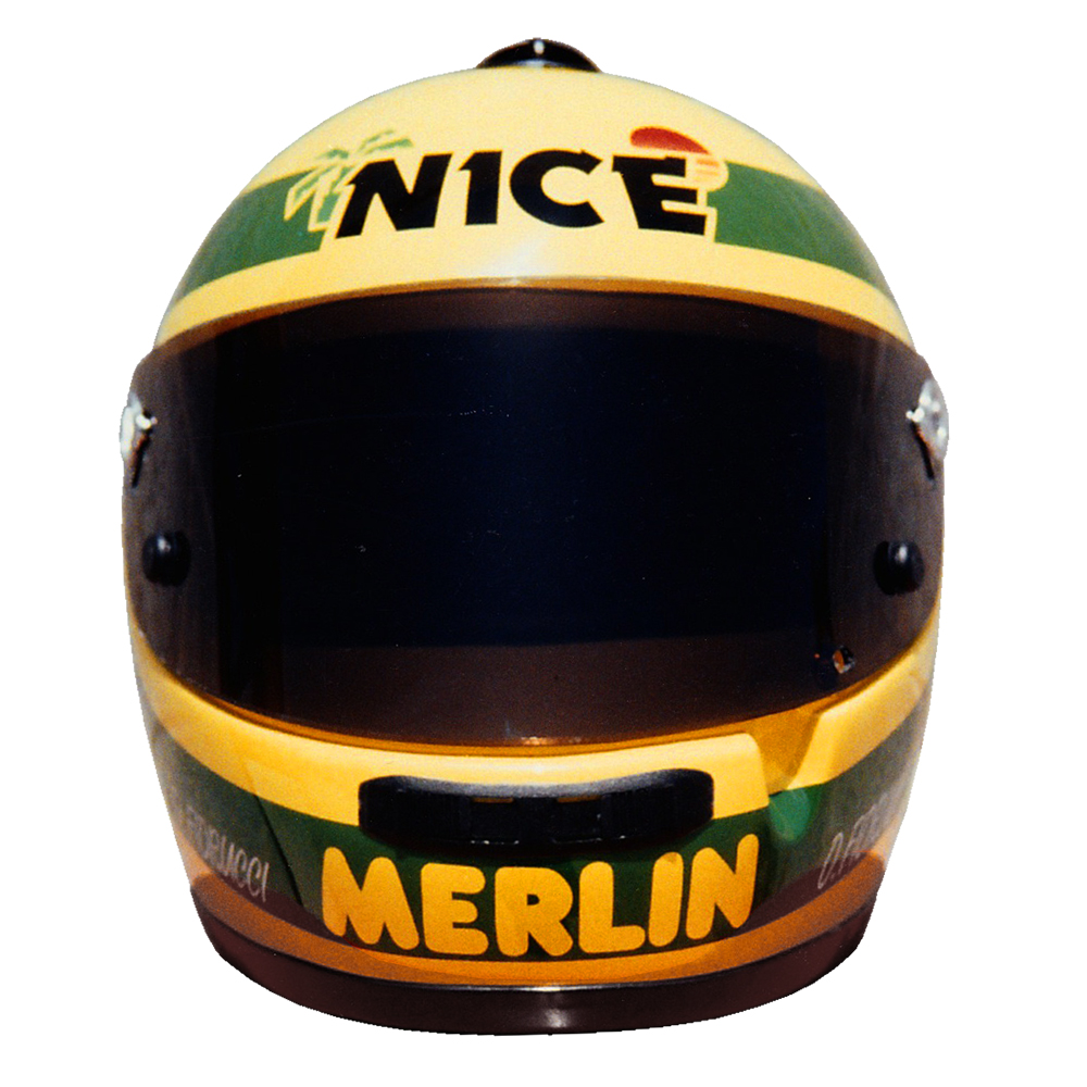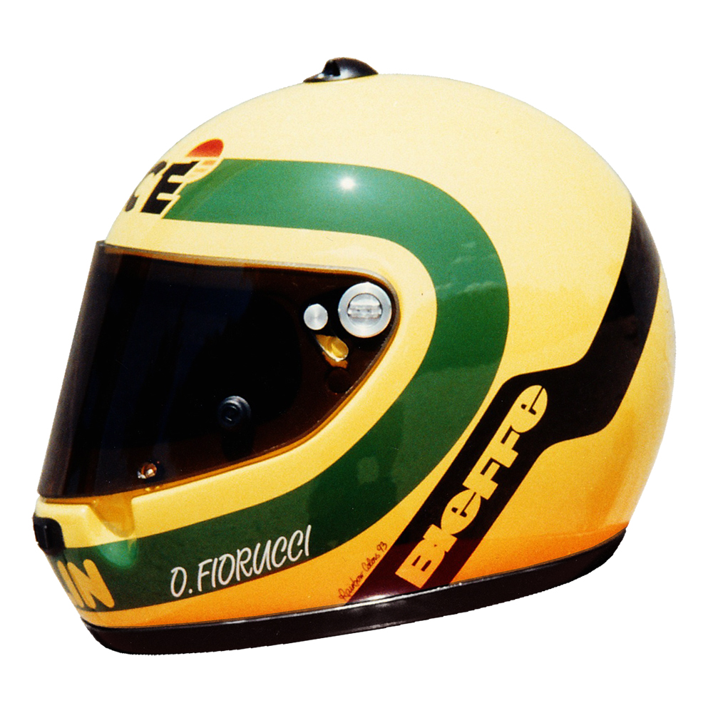 Karting 1993 Olivier Fiorucci Casque Bieffe F1, peint par Christian Roux / Rainbow Colors en 1993 pour Olivier Fiorucci, Team Merlin, Championnat du Monde Formule A Karting. Précédent Suivant