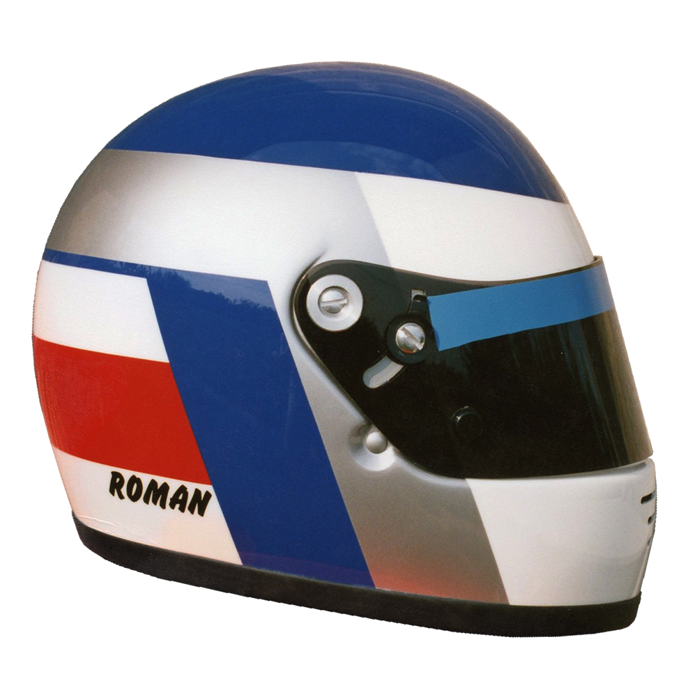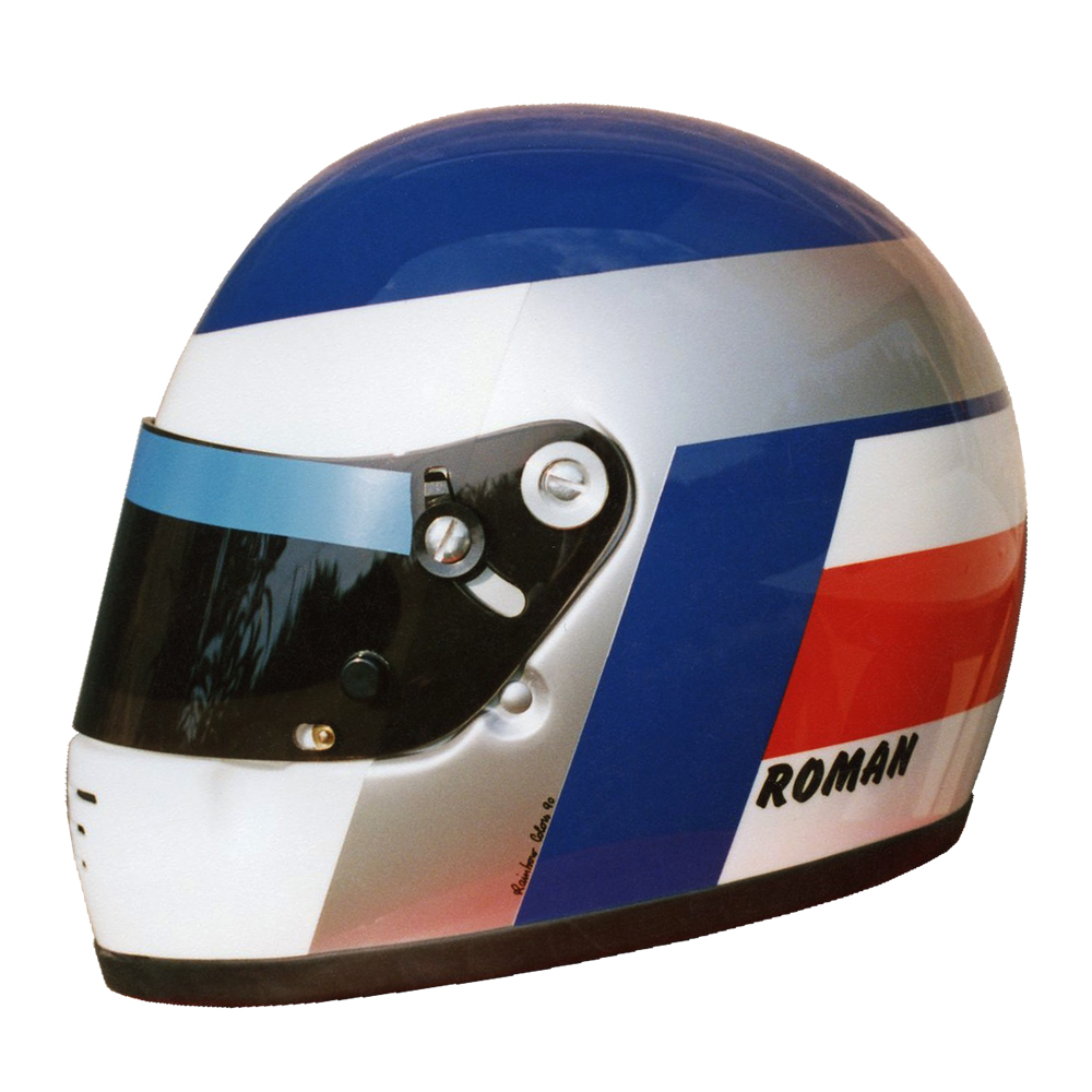 Karting 1990 Pierre ROMAN Casque Arai GP 2, peint par Christian Roux / Rainbow Colors en 1990 pour Pierre Roman. Précédent Suivant