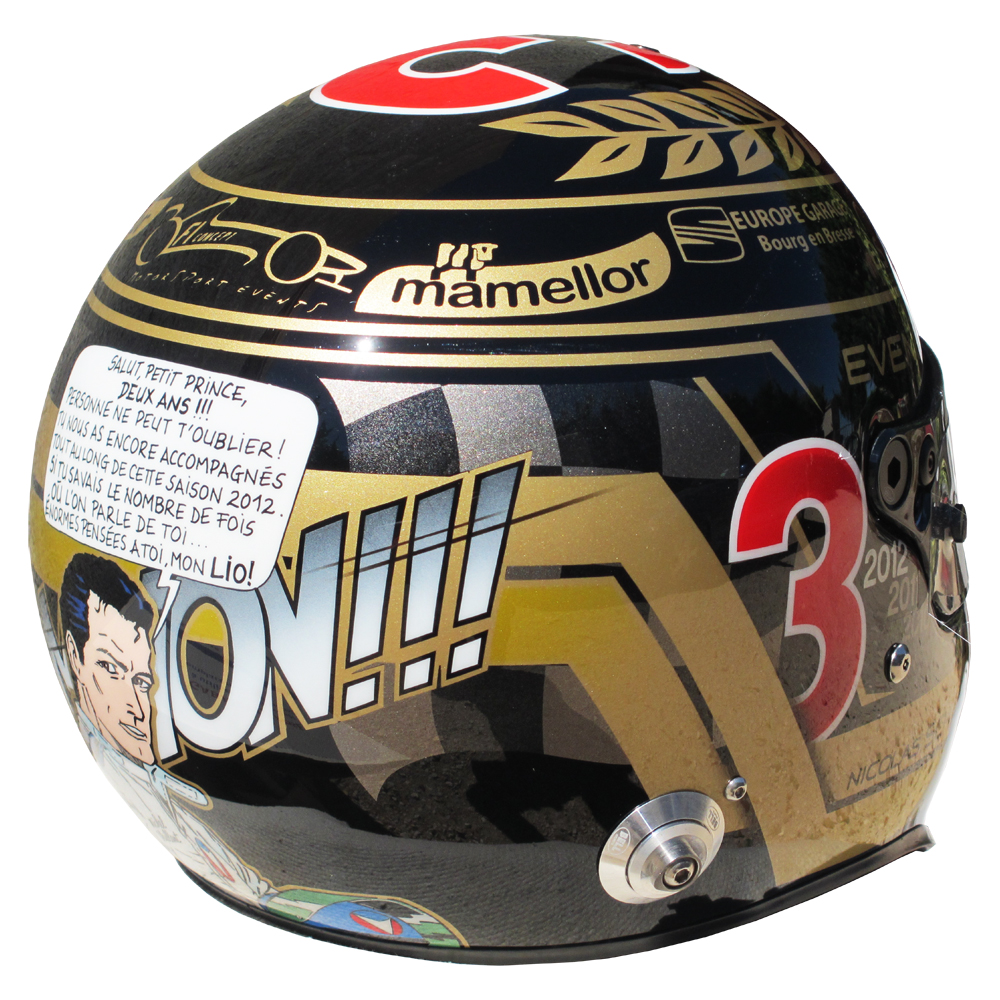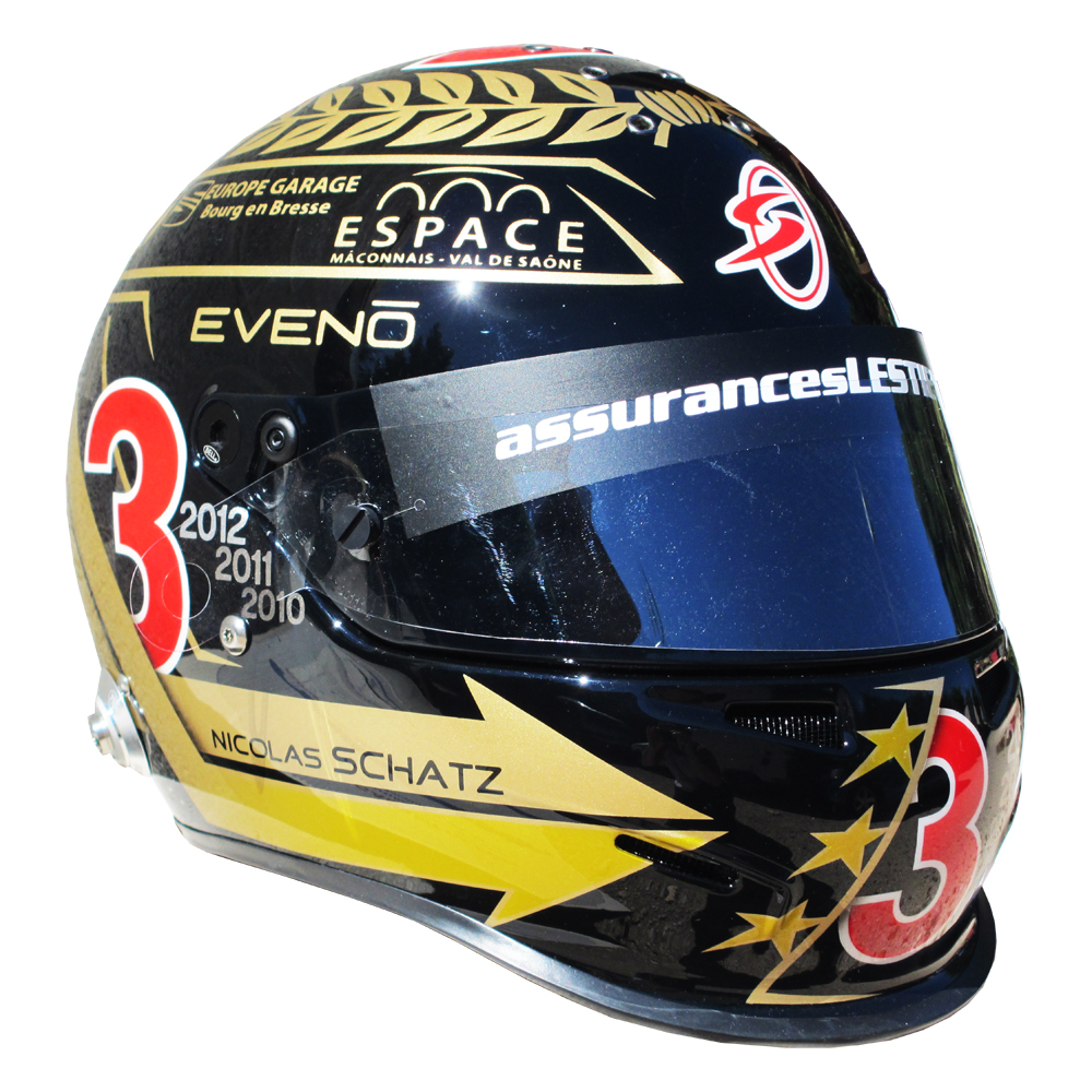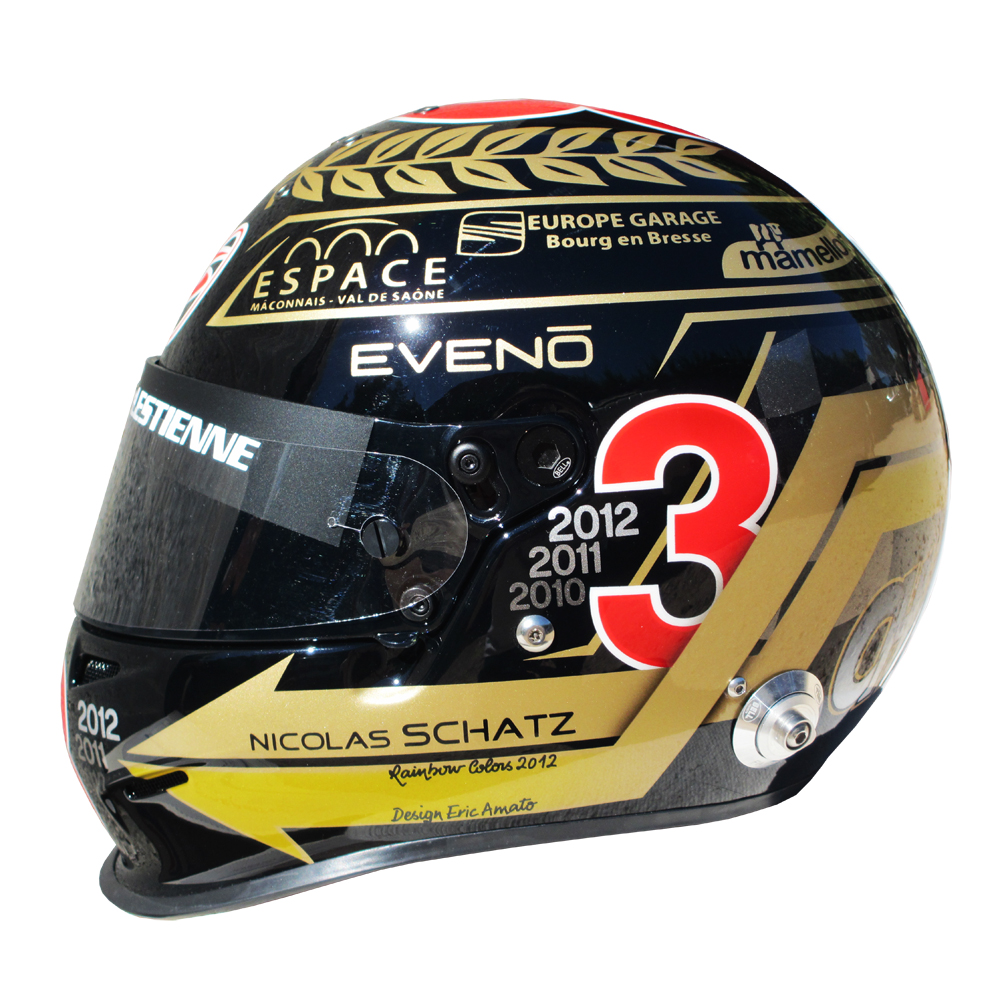 Rallye 2012 Nicolas SCHATZ Casque Bell RS 3, peint par Christian Roux / Rainbow Colors en 2012 pour Nicolas Schatz, Champion de France de la Montagne. Précédent Suivant