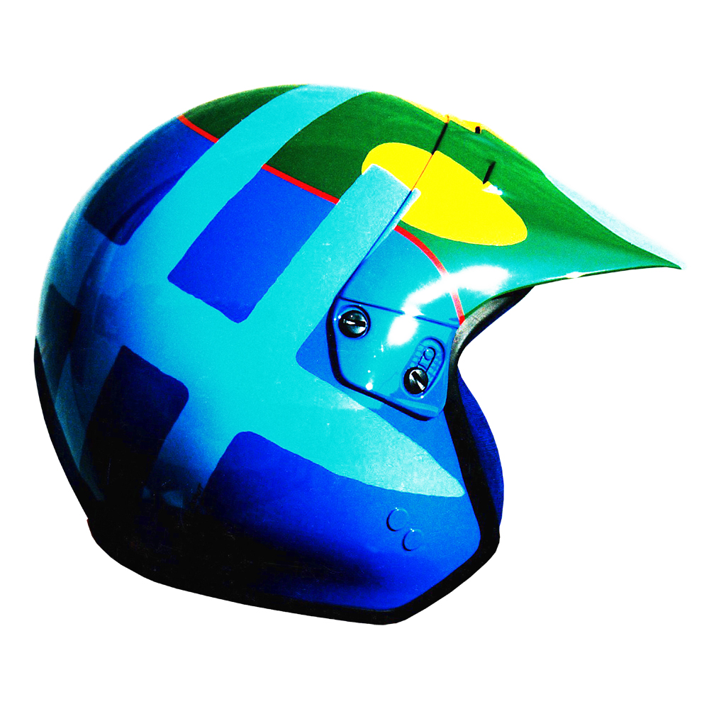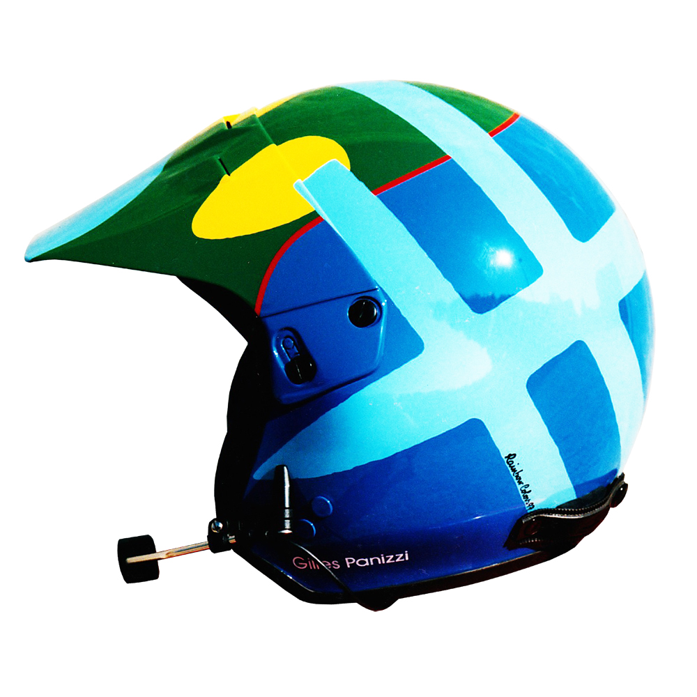 Rallye 1997 Gilles PANIZZI Casque Peltor Rally Pro, peint par Christian Roux / Rainbow Colors en 1997 pour Gilles Panizzi, Champion de France des Rallyes, Peugeot 306 Maxi Team Peugeot Sport. Précédent Suivant