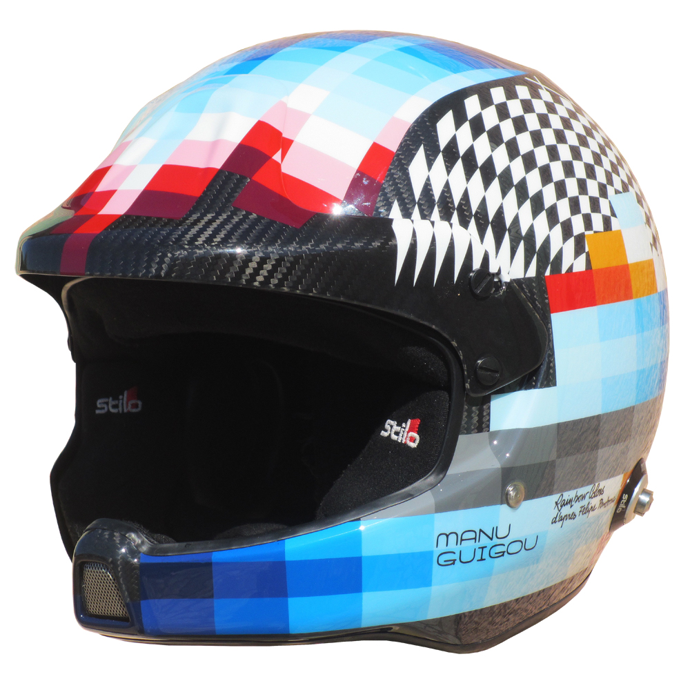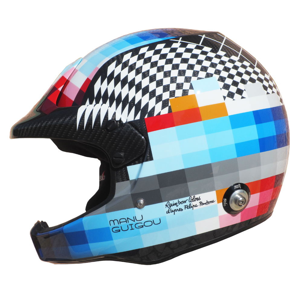 Rallye 2021 Manu GUIGOU Casque Stilo WRC DES Carbone, peint par Christian Roux / Rainbow Colors en 2021 pour Manu Guigou, pilote Alpine Renault, d'après Alpine A 110 Felipe Pantone. Suivant