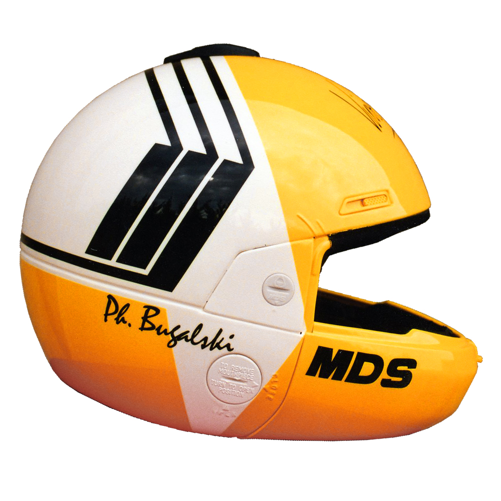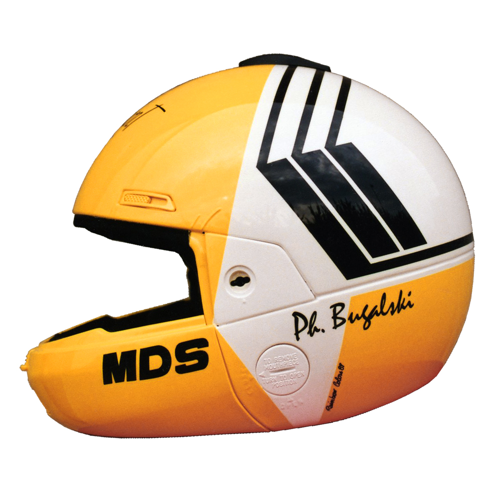 Rallye 1989 Philippe BUGALSKI #2 Casque MDS M 91 Pro Look Integral, crée et peint par Christian Roux / Rainbow Colors en 1989 pour Philippe Bugalski, Team Renault Sport, Championnat du Monde des Rallyes. Précédent Suivant