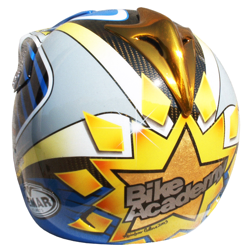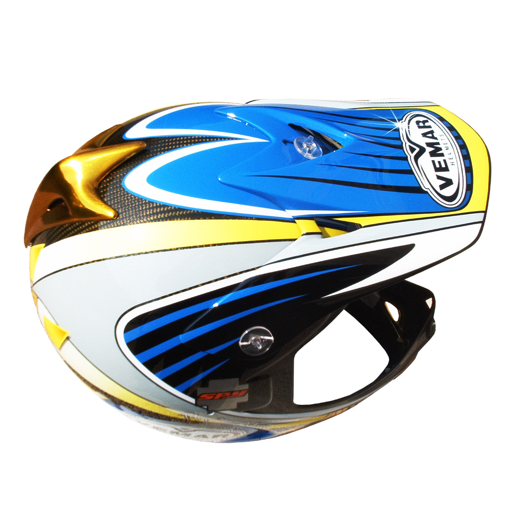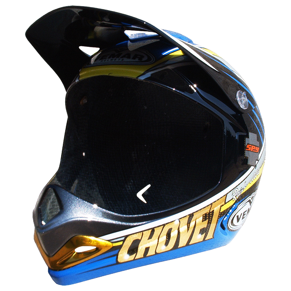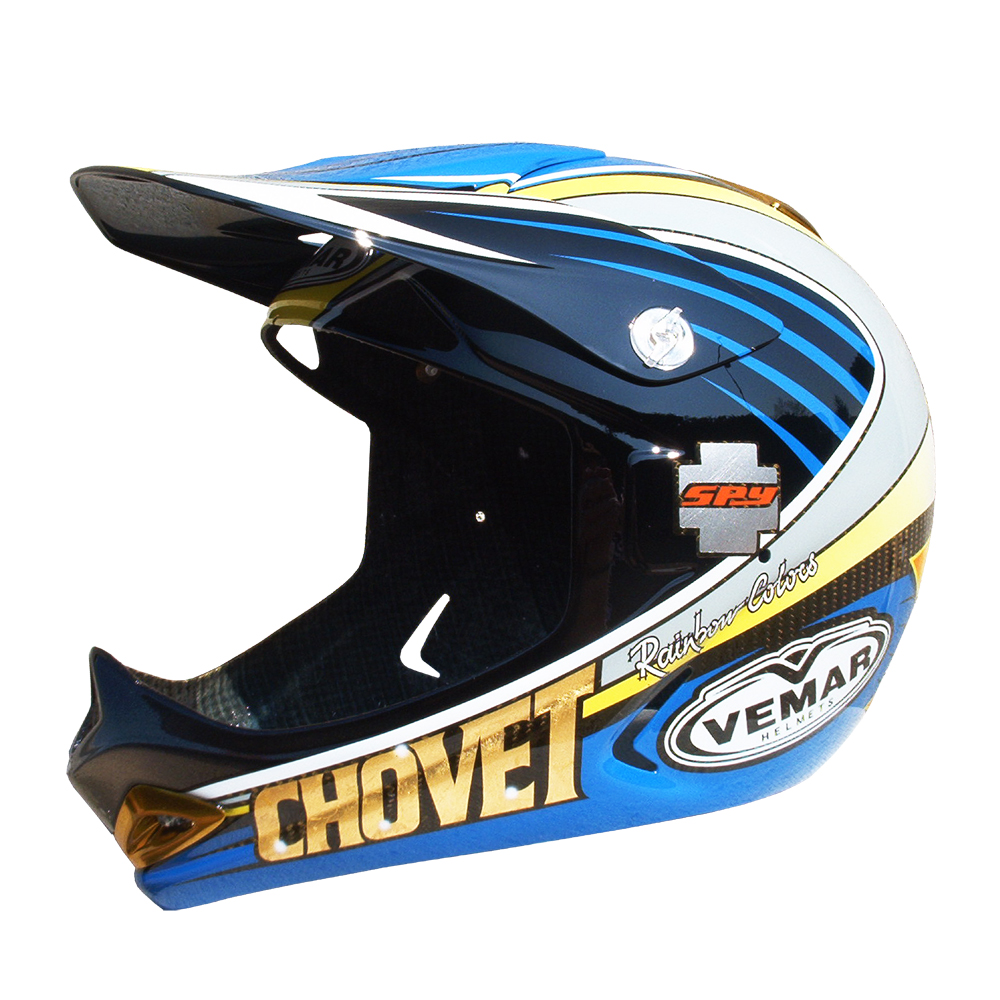 Descente VTT 2003 Sébastien CHOVET Casque de moto cross Vemar, crée et peint par Christian Roux / Rainbow Colors en 2003 pour Sébastien Chovet Team Ayton Giant. Précédent Suivant