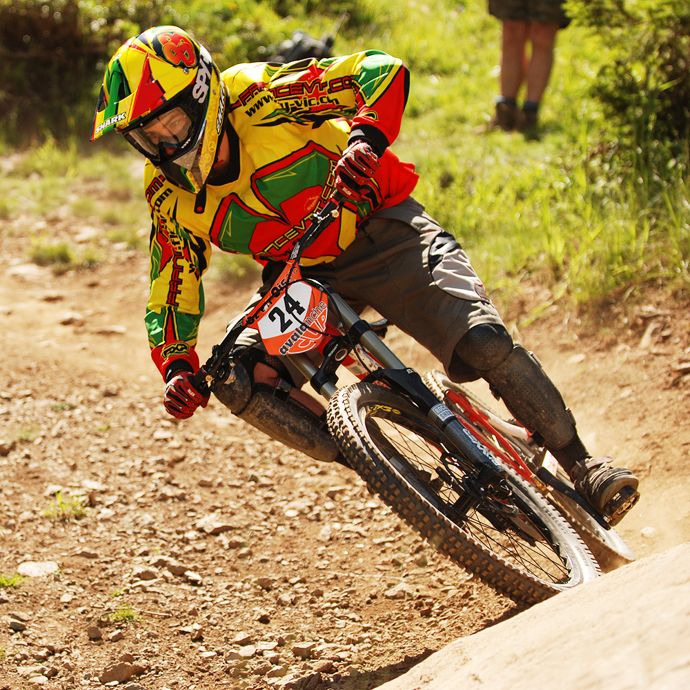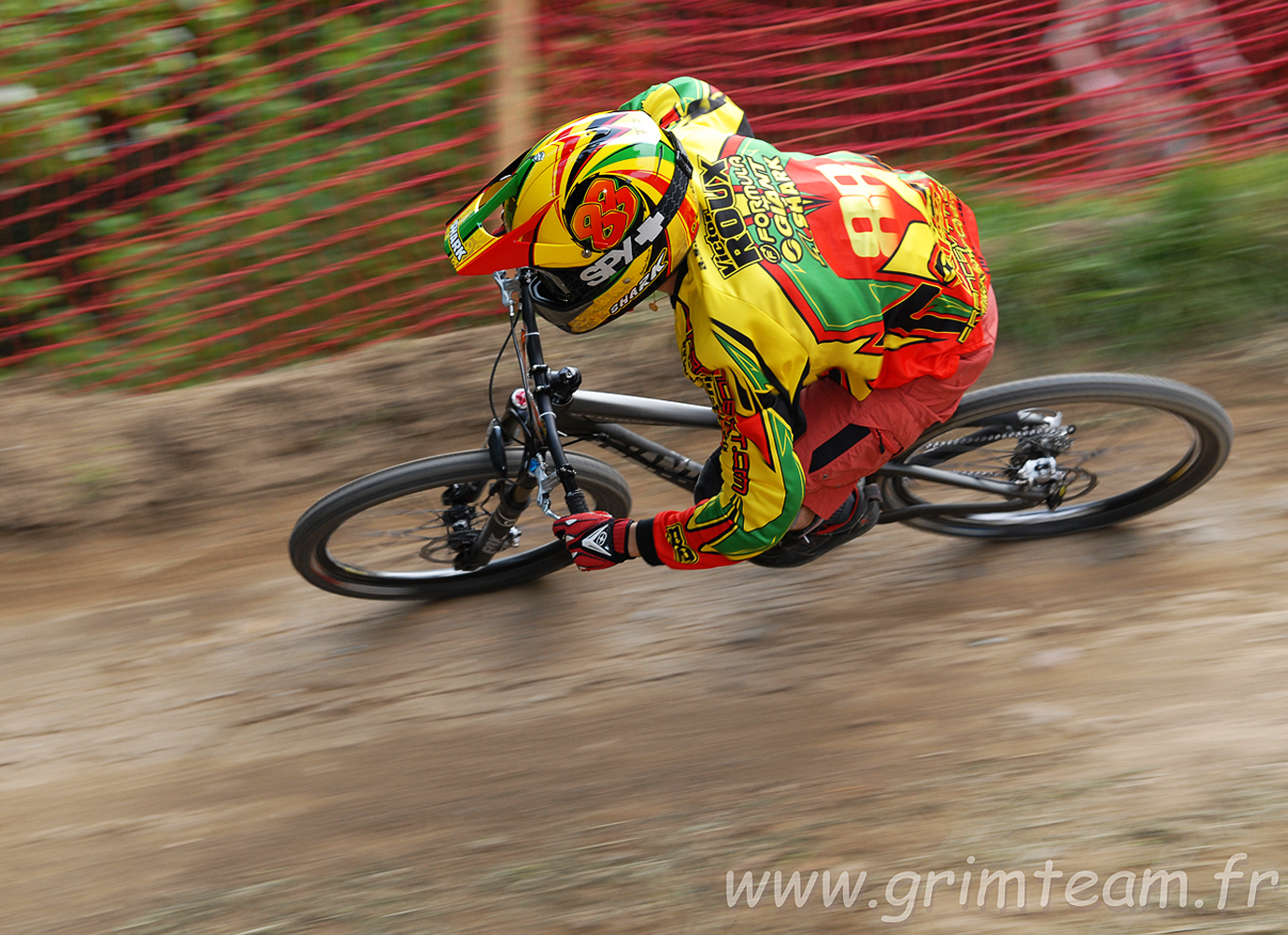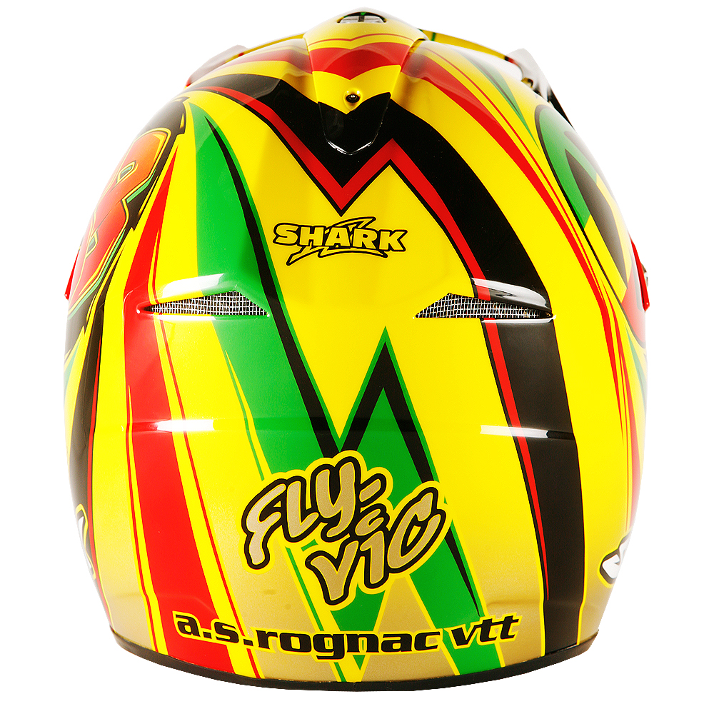 Descente VTT 2009 Victor ROUX Casque de moto cross Shark SXR, crée et peint par Christian Roux / Rainbow Colors en 2009 pour Victor Roux / Fly-vic. Précédent Suivant