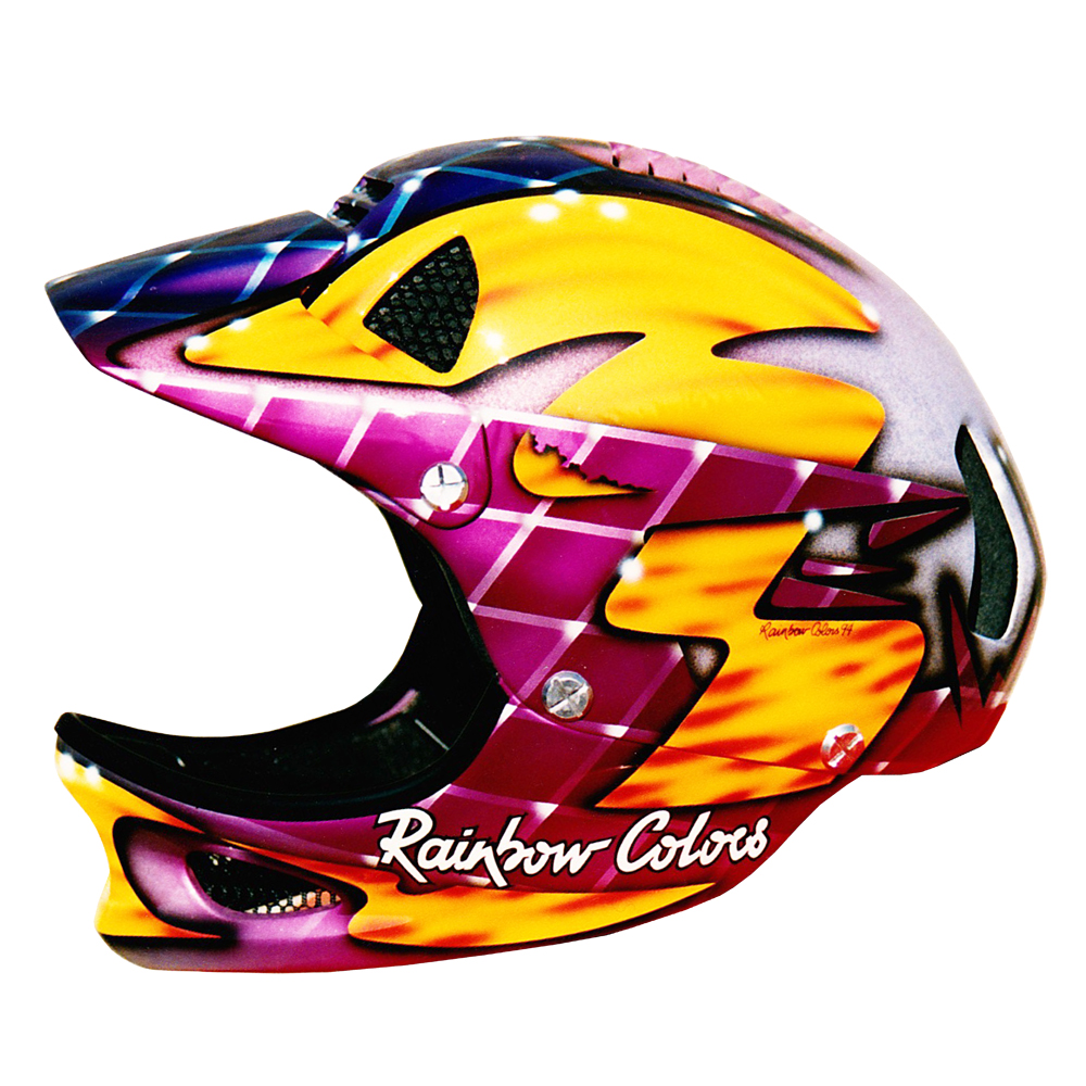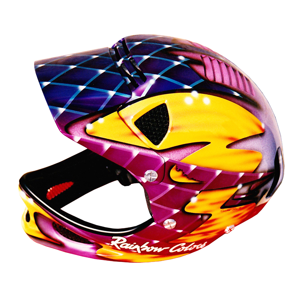 Descente VTT 1994 RC2 RC3 ATB Casque de descente VTT Shoei RC3 ATB, mentonnière Troy Lee designs, crée et peint pour Christian Roux / Rainbow Colors en 1994. Précédent