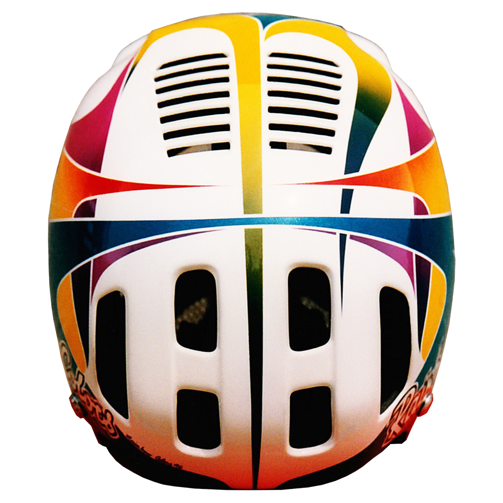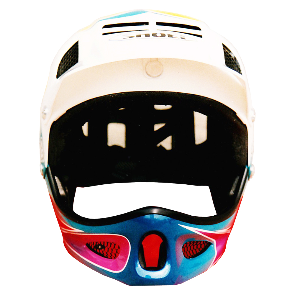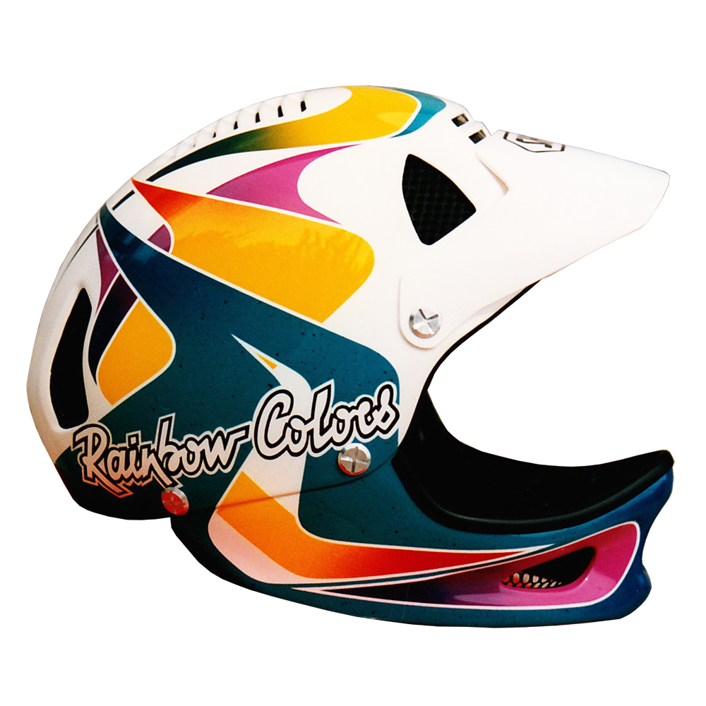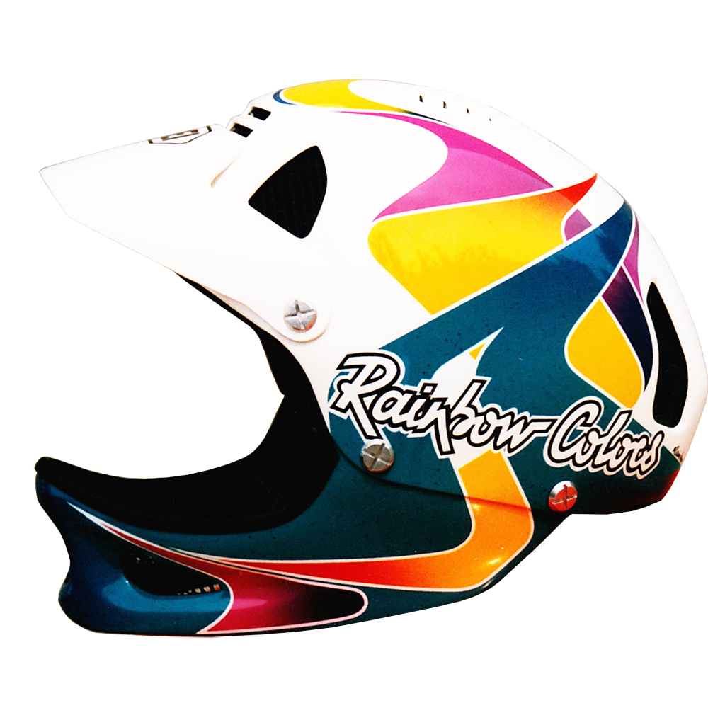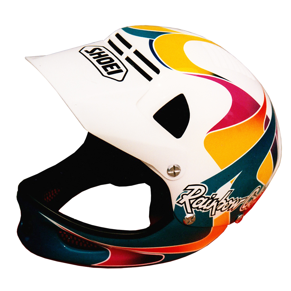 Descente VTT 1996 Erick AUVÉ Casque de descente VTT Shoei RC3 ATB, mentonnière Troy Lee designs, crée et peint par Christian Roux / Rainbow Colors en 1996 pour Erick Auvé. Précédent Suivant