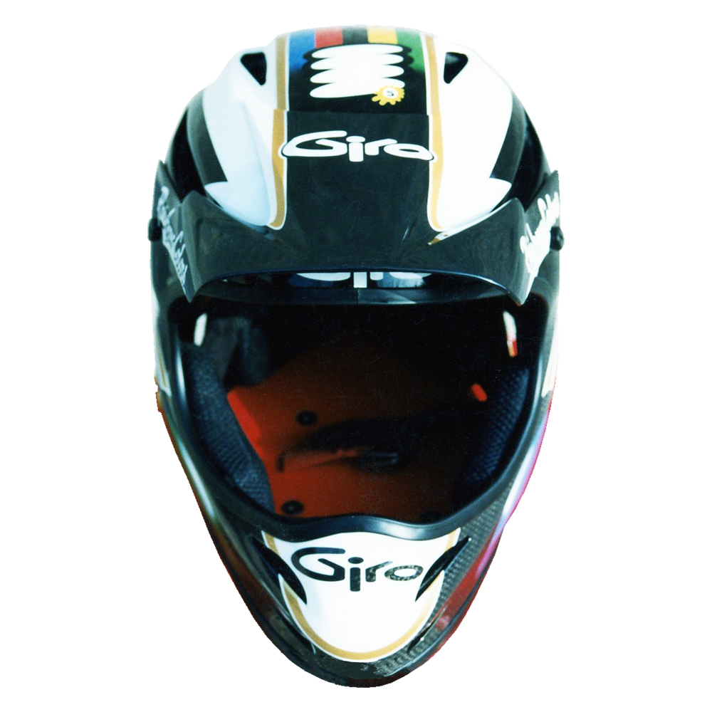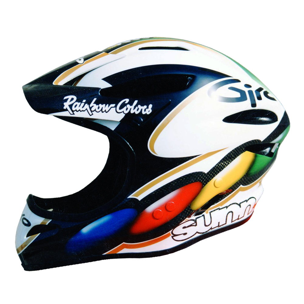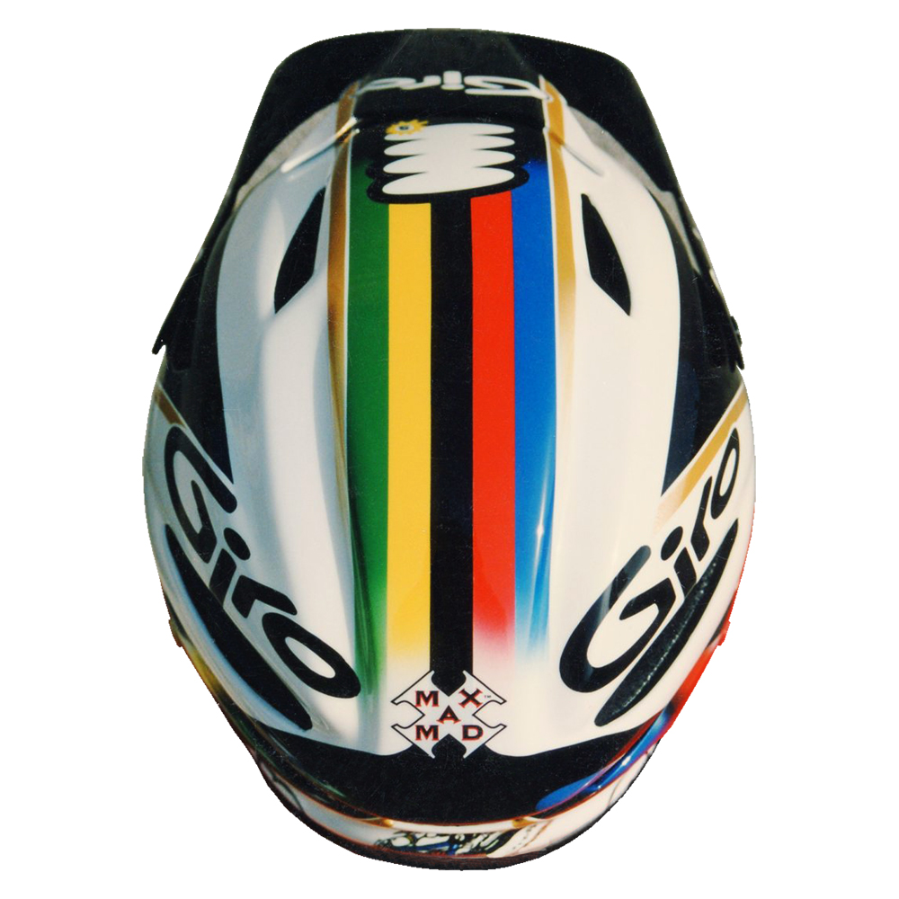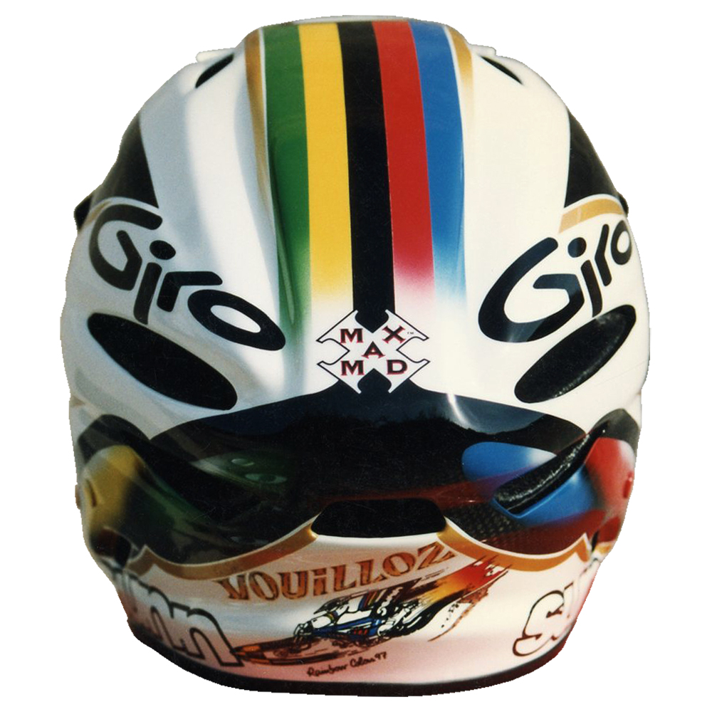Descente VTT 1997 Nicolas VOUILLOZ #2 Casque de descente VTT Giro Mad Max, crée et peint par Christian Roux / Rainbow Colors en 1997 pour Nicolas Vouilloz, Team Sunn, Champion du Monde DH. Précédent Suivant