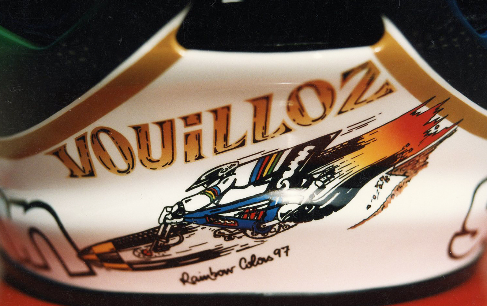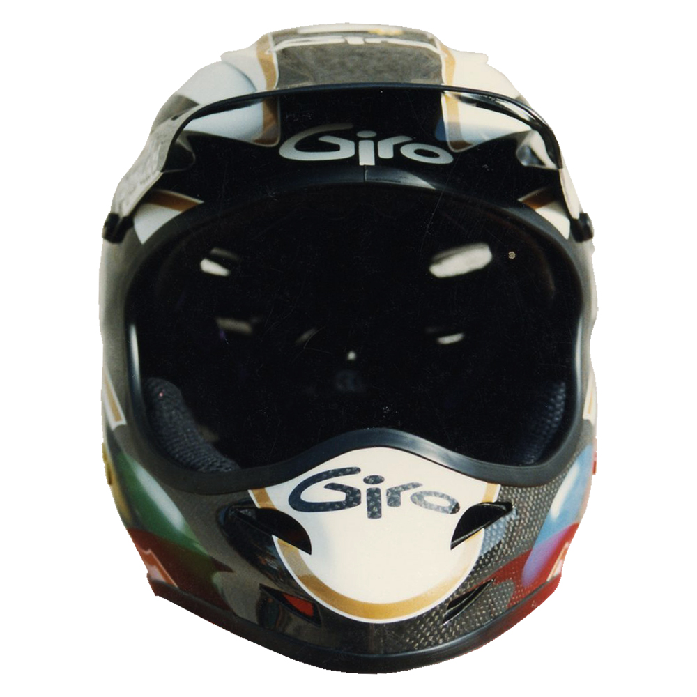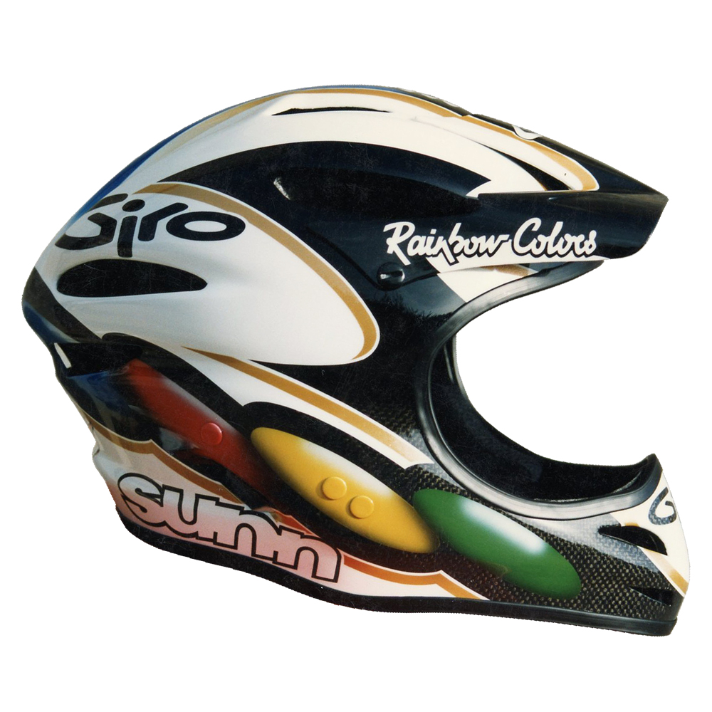 Descente VTT 1997 Nicolas VOUILLOZ #2 Casque de descente VTT Giro Mad Max, crée et peint par Christian Roux / Rainbow Colors en 1997 pour Nicolas Vouilloz, Team Sunn, Champion du Monde DH. Précédent Suivant