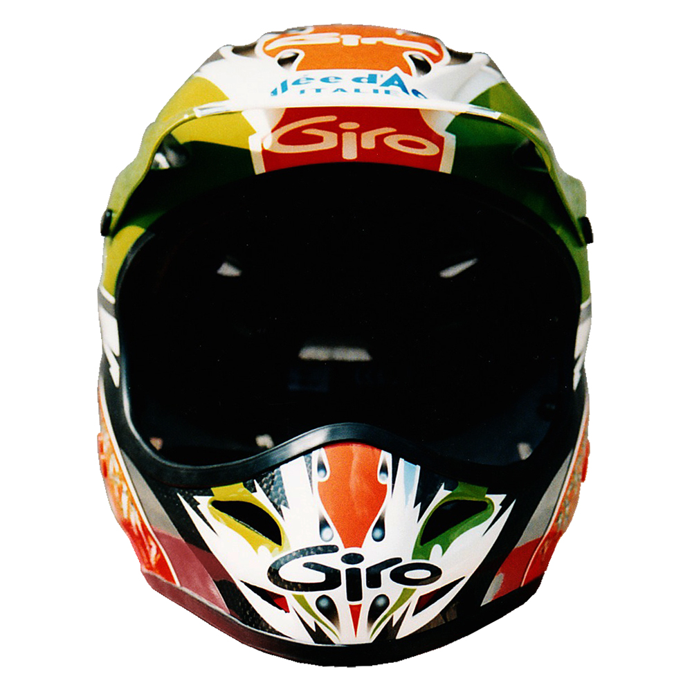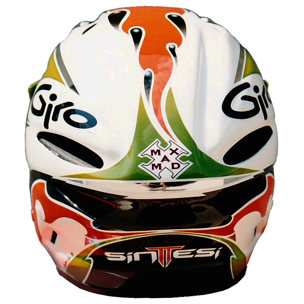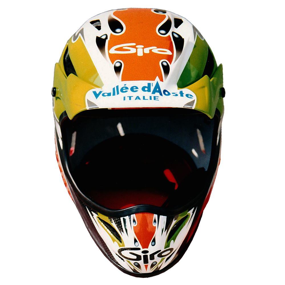 Descente VTT 1998 Corrado HERIN Casque de descente VTT Giro Mad Max, crée et peint par Christian Roux / Rainbow Colors en 1998 pour Corrado Herin Team Sintesi. Précédent Suivant