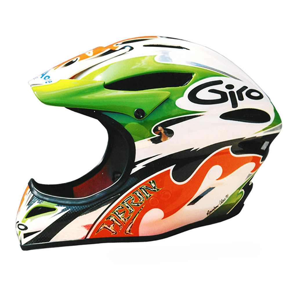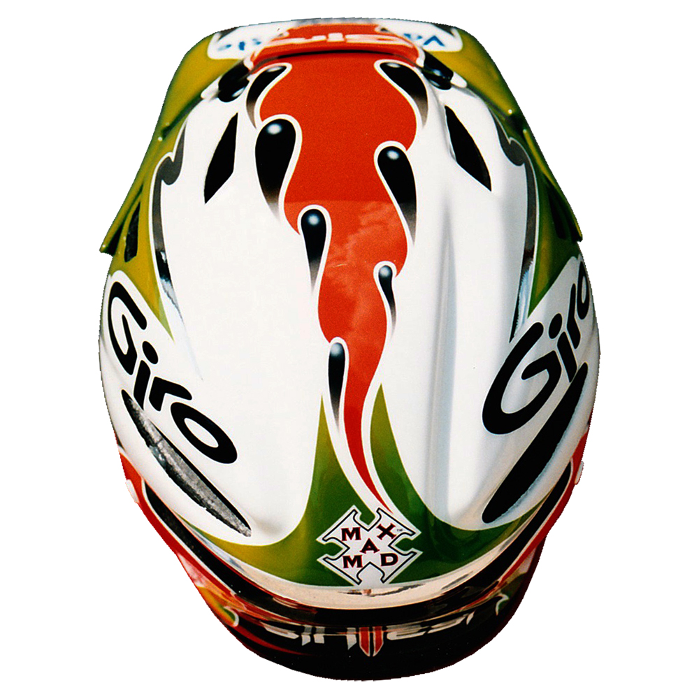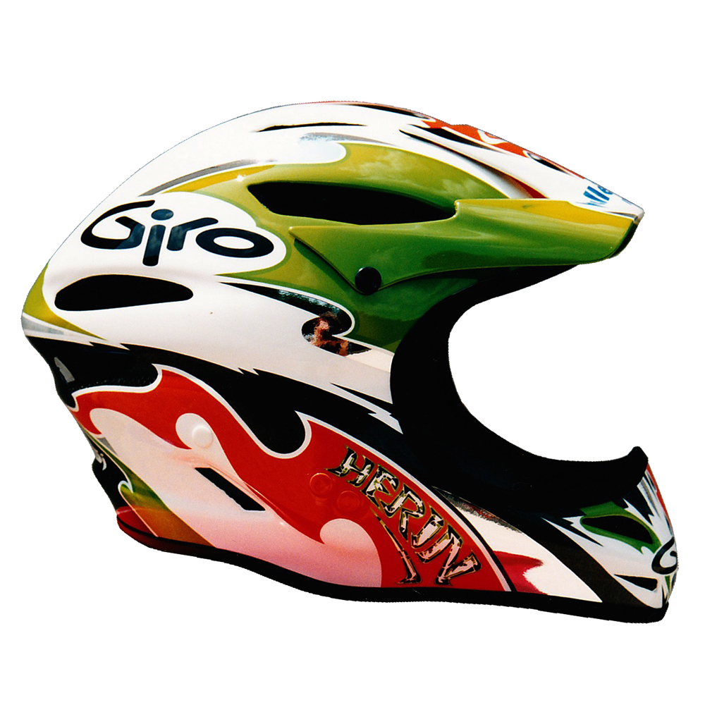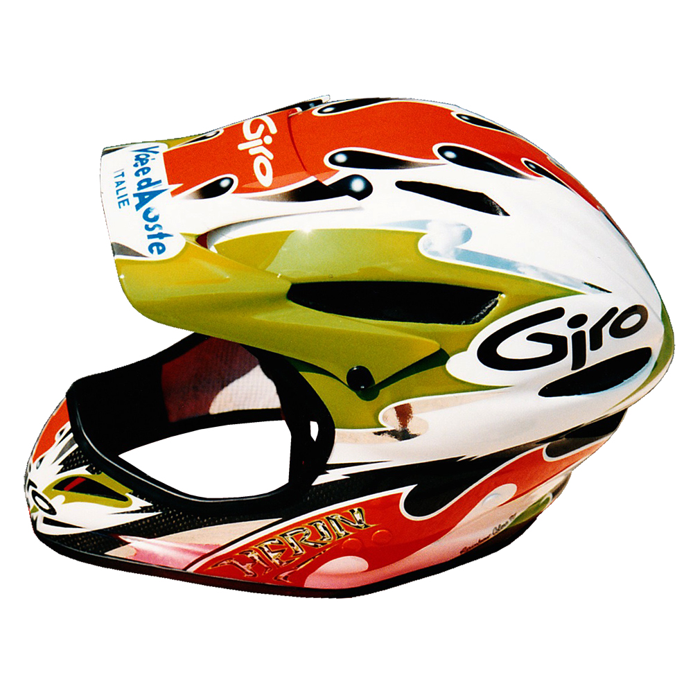 Descente VTT 1998 Corrado HERIN Casque de descente VTT Giro Mad Max, crée et peint par Christian Roux / Rainbow Colors en 1998 pour Corrado Herin Team Sintesi. Précédent Suivant