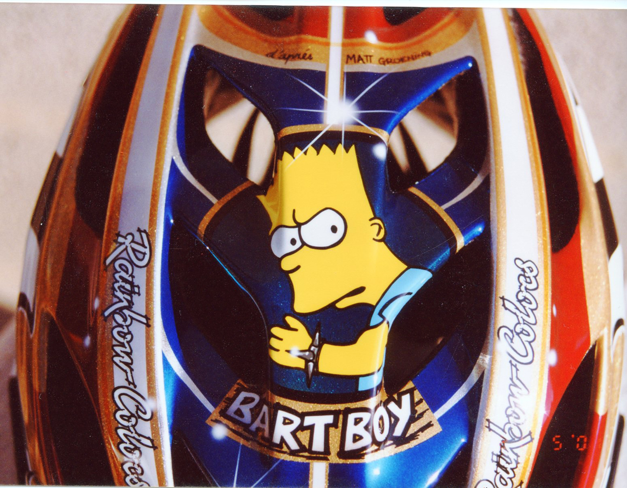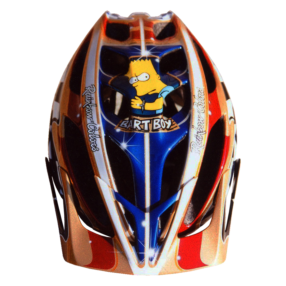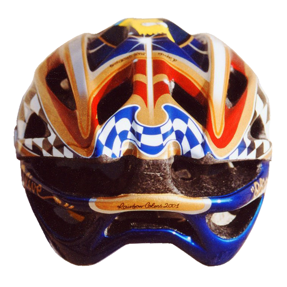 Route et X-Country 2001 Olivier SARRAZIN Casque Giro Exodus, crée et peint par Christian Roux / Rainbow Colors en 2001 pour Olivier Sarrazin, Vice Champion du Monde Junior 2005 VTT X-Country. Précédent Suivant