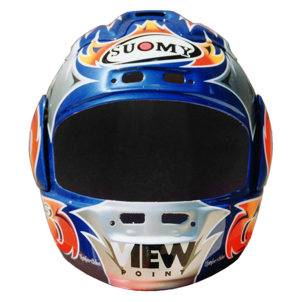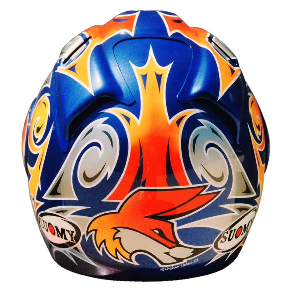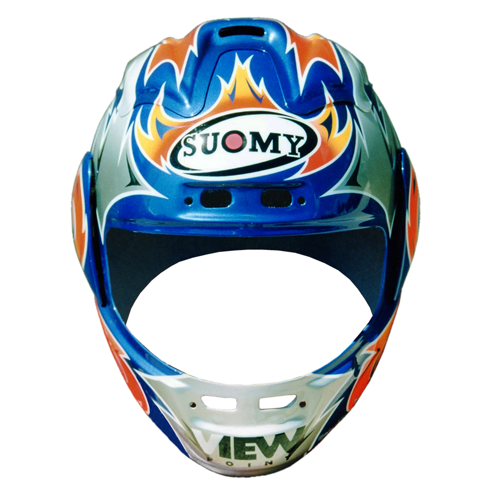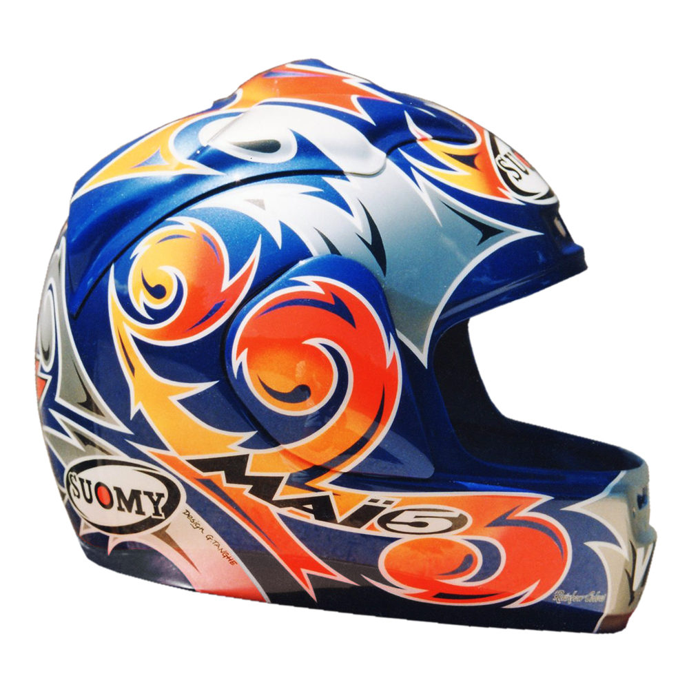 Circuit 1998 Massimo “Maio“ MEREGALLI #4 Casque Suomy, peint par Christian Roux / Rainbow Colors en 1998 pour Maio Meregalli, Team Belgarda Yamaha, 5ème Championnat du Monde Supersport. Précédent Suivant