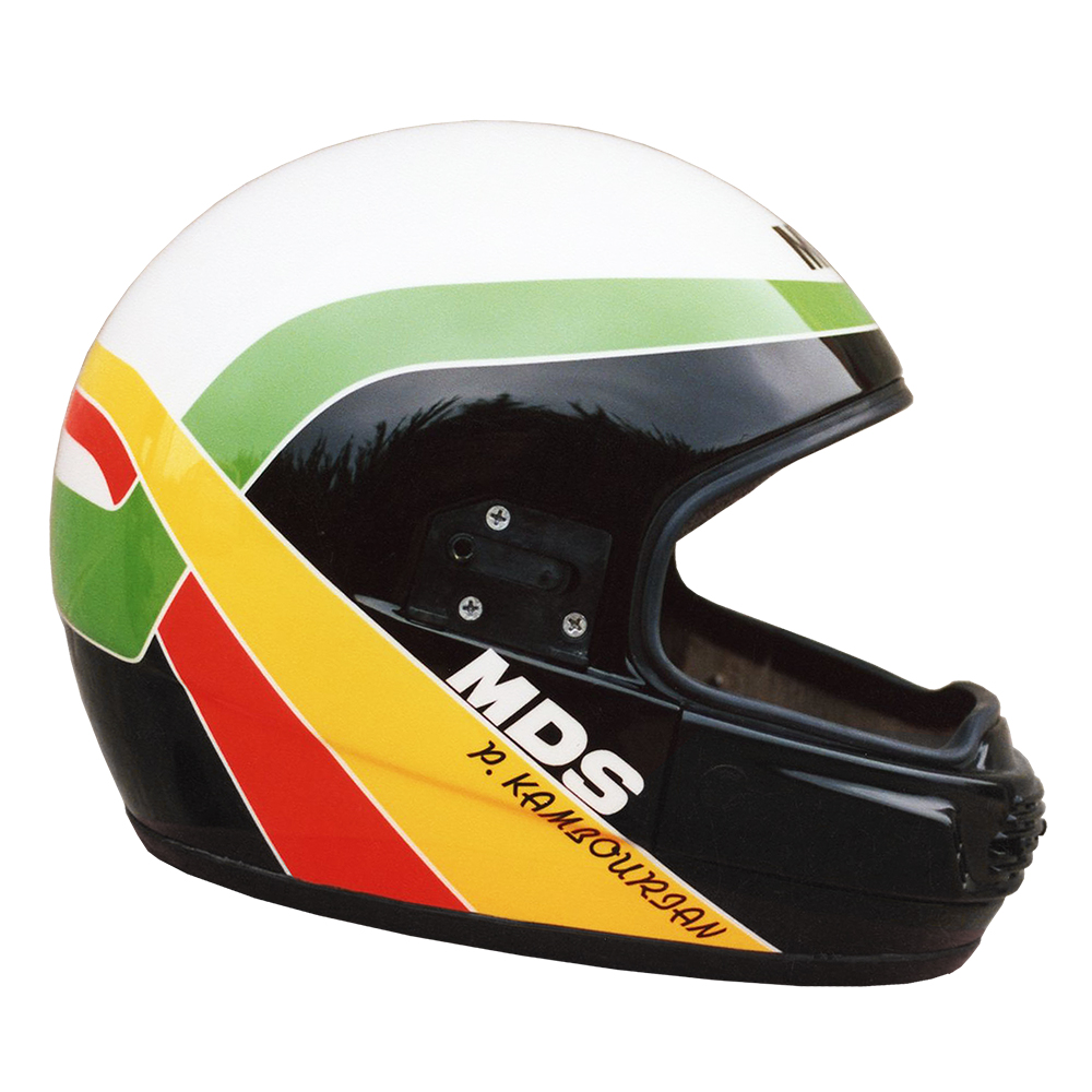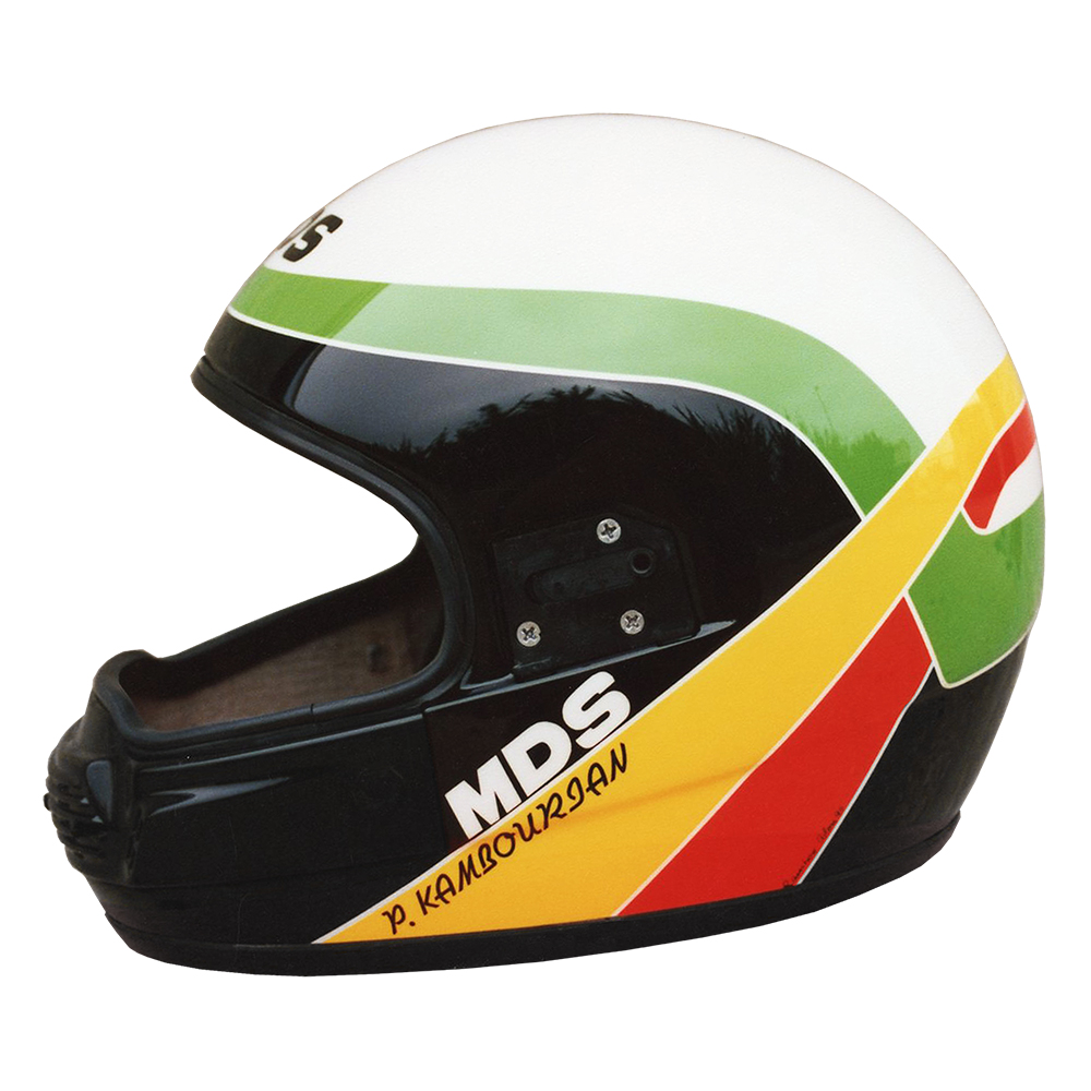 Circuit 1990 Pascal KAMBOURIAN Casque MDS M89, crée et peint par Christian Roux / Rainbow Colors en 1990 pour Pascal Kambourian, MC Courneuvien Team Loisir Plus, Championnat de France de vitesse cyclo. Précédent Suivant