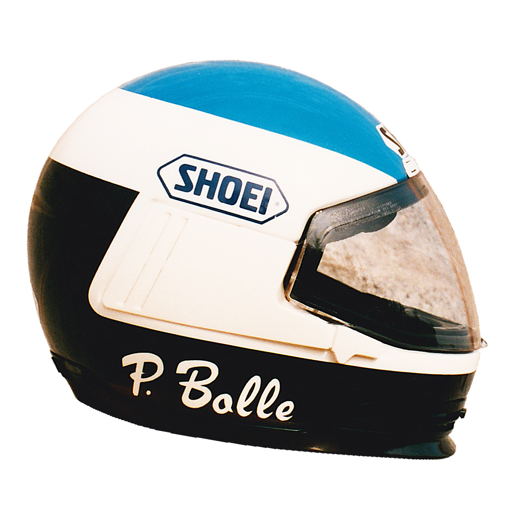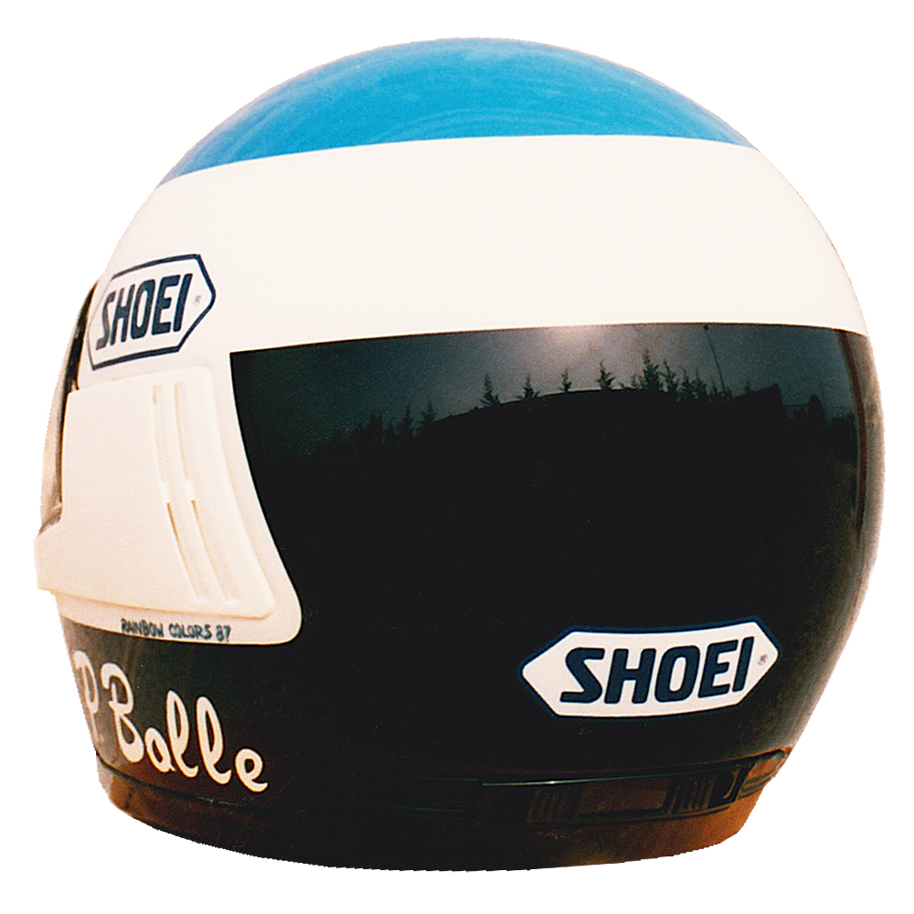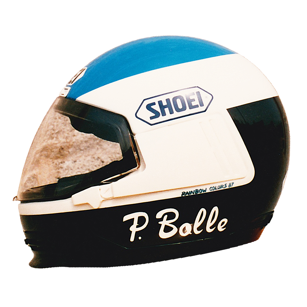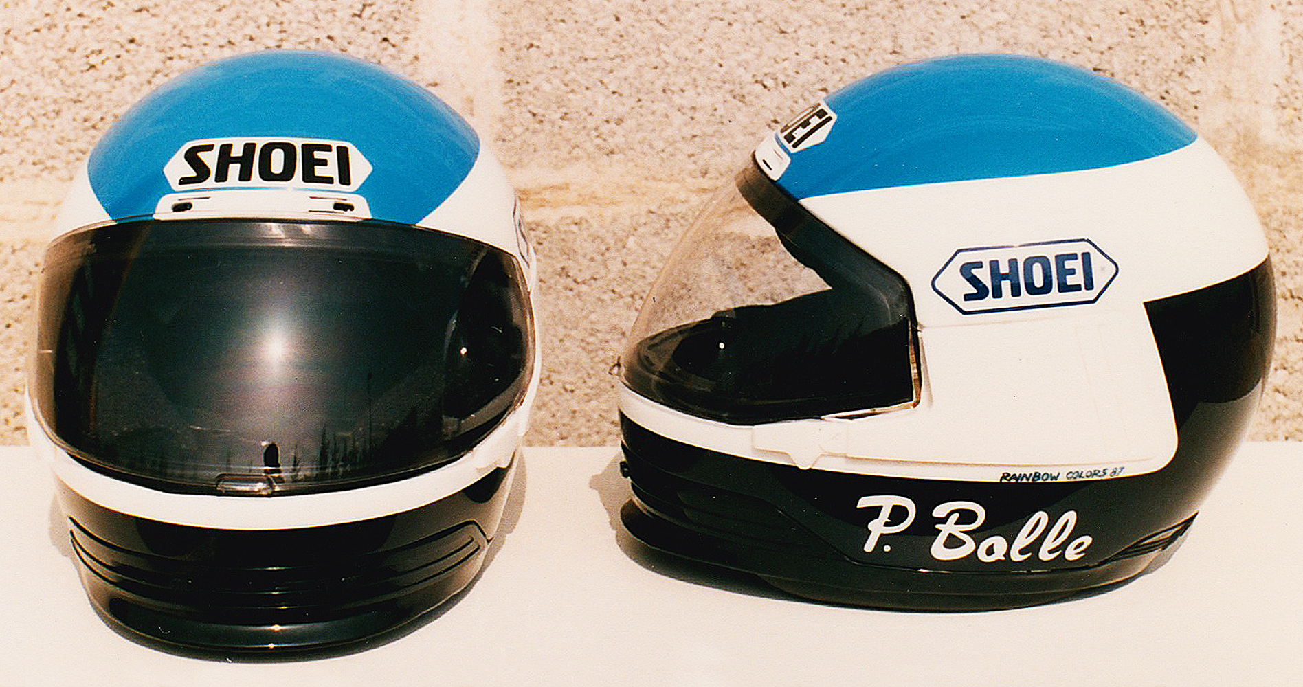 Circuit 1987 Pierre BOLLE Casques Shoei GX-1, peints par Christian Roux / Rainbow Colors en 1987 pour Pierre Bolle, pilote Superbike et Endurance. Précédent Suivant