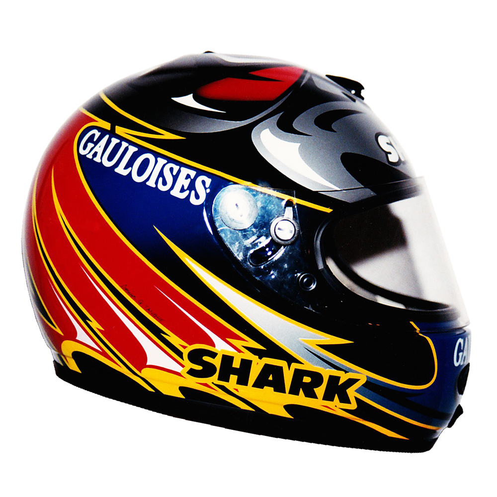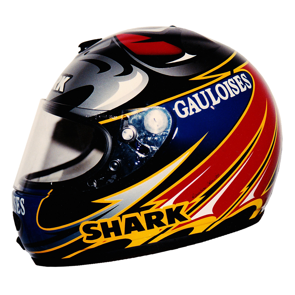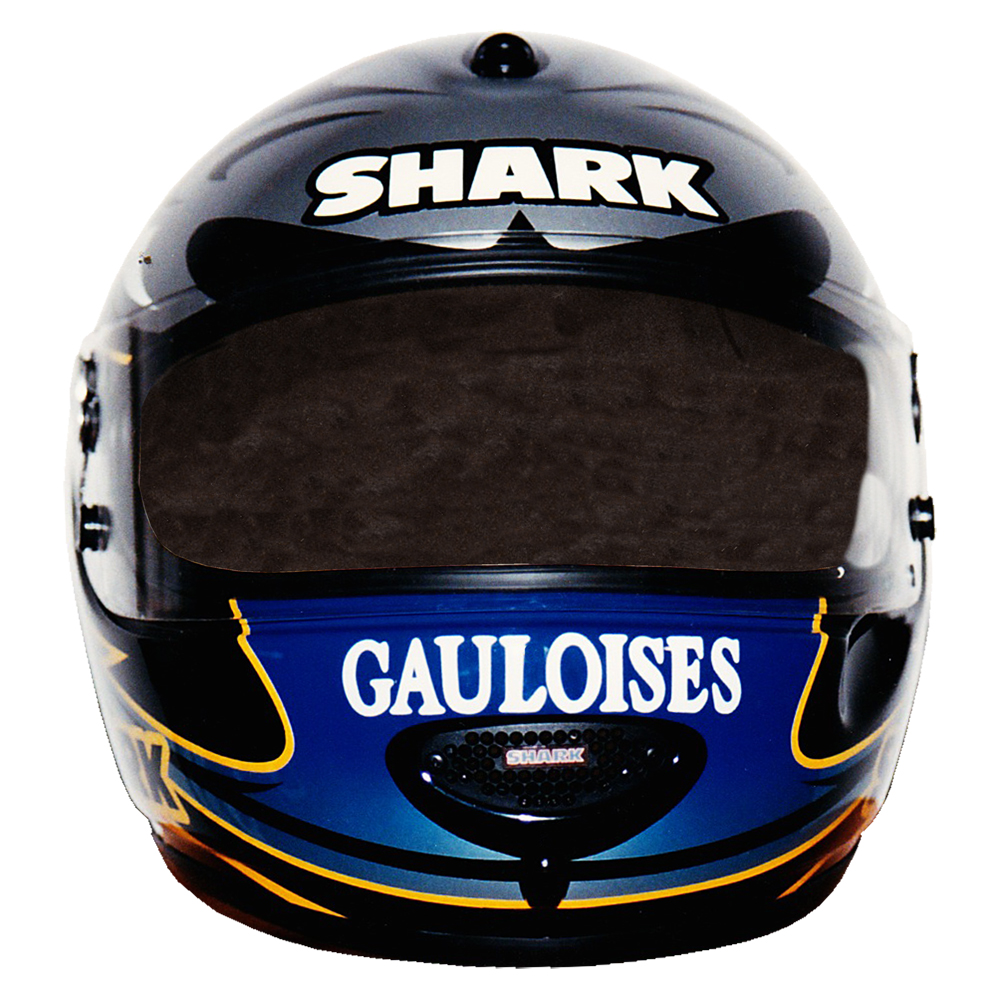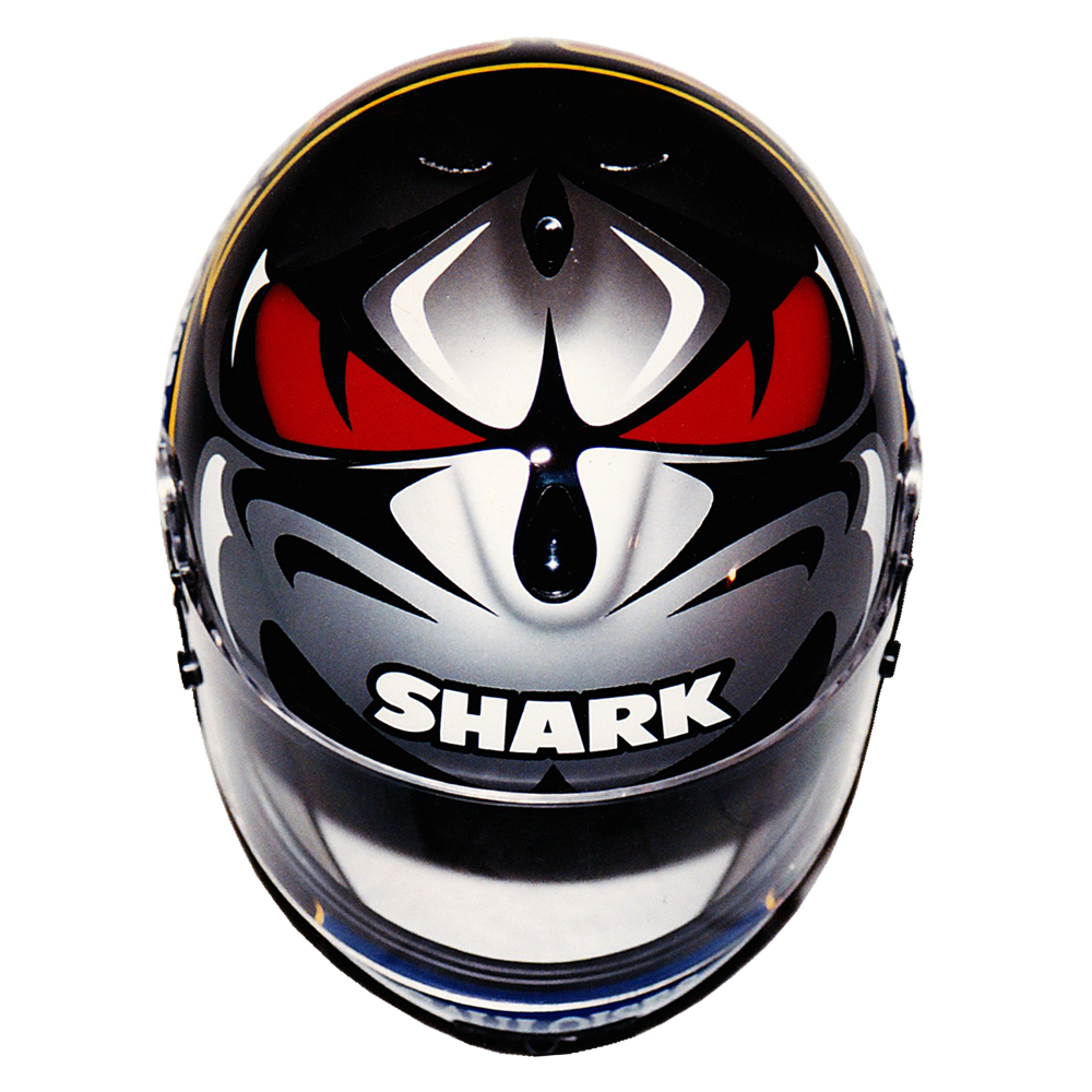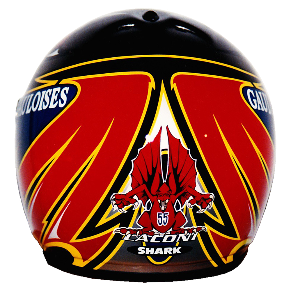 Circuit 1998 Régis LACONI Casque Shark RS, peint par Christian Roux / Rainbow Colors en 1998 pour Régis Laconi, Team Red Bull Yamaha, Championnat du Monde GP 500, projet de décoration Guillaume Tanghe Design. Précédent Suivant