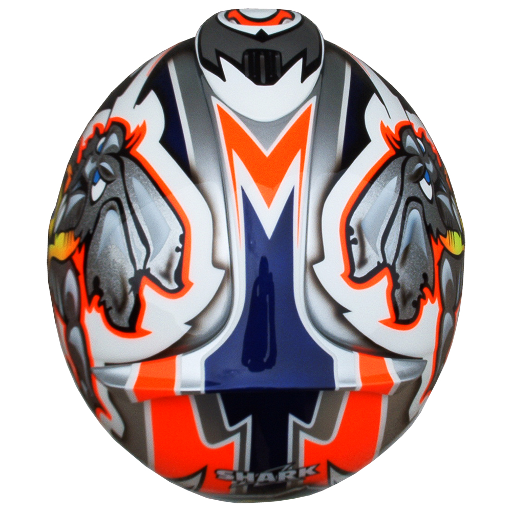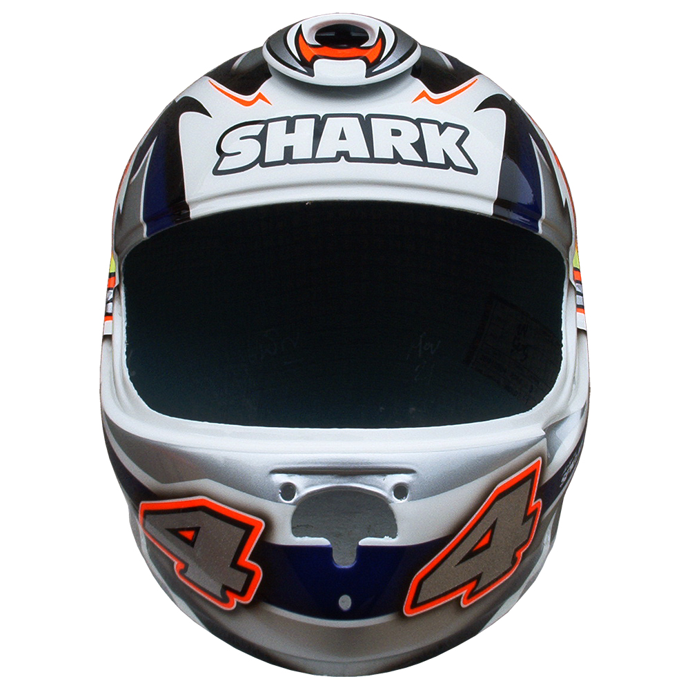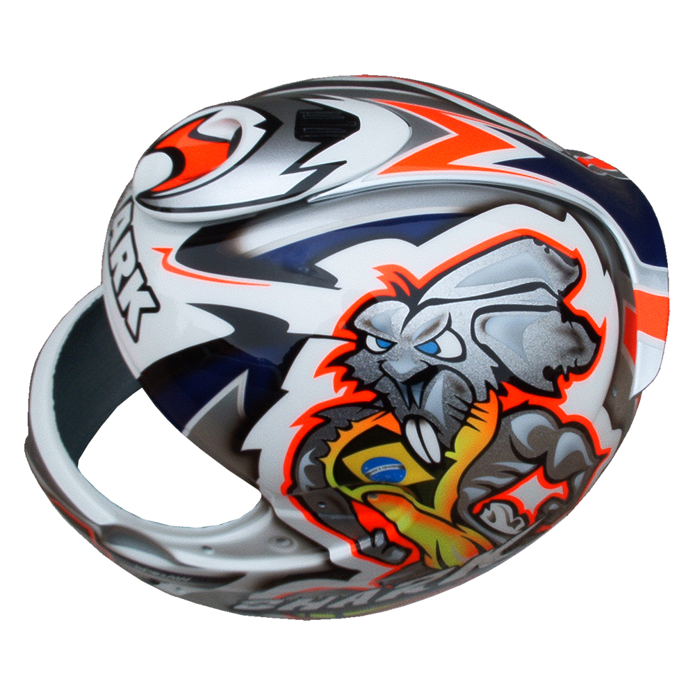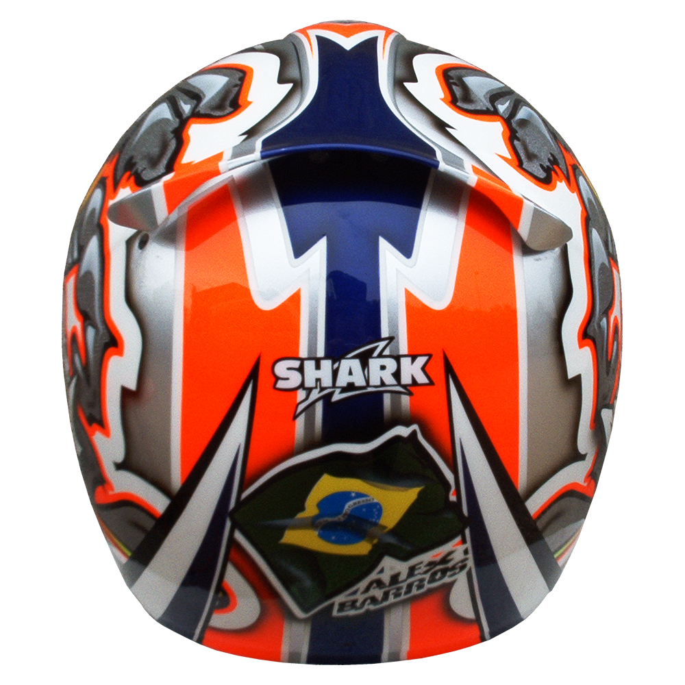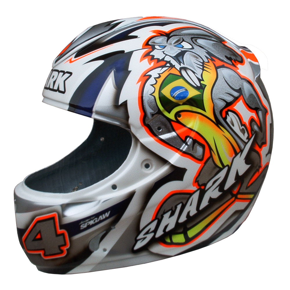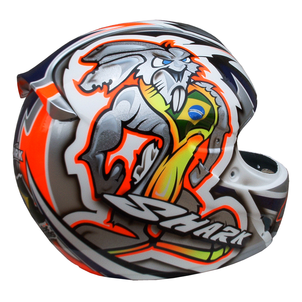 Circuit 2004 Alex BARROS #1 Casque Shark RSR 2, peint par Christian Roux / Rainbow Colors en 2004 pour Alex Barros, Team Honda Repsol, 4éme du Championnat du Monde de Moto GP. Précédent Suivant