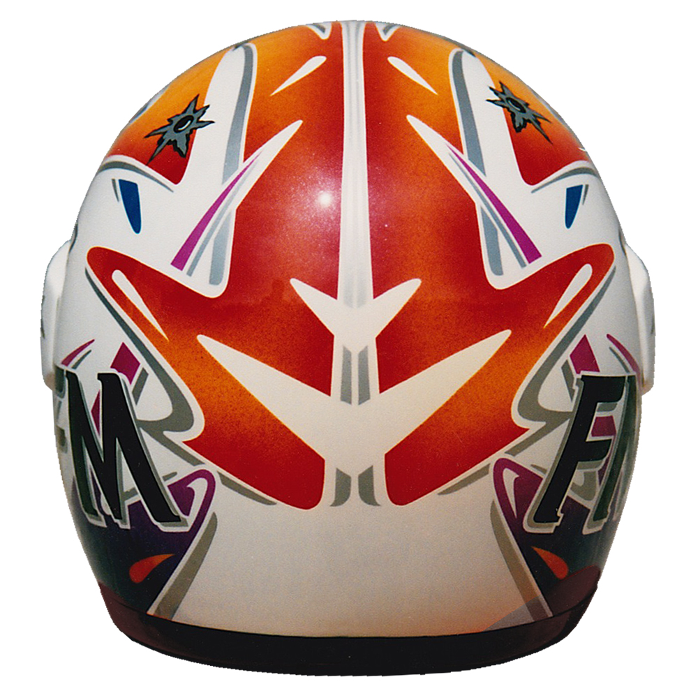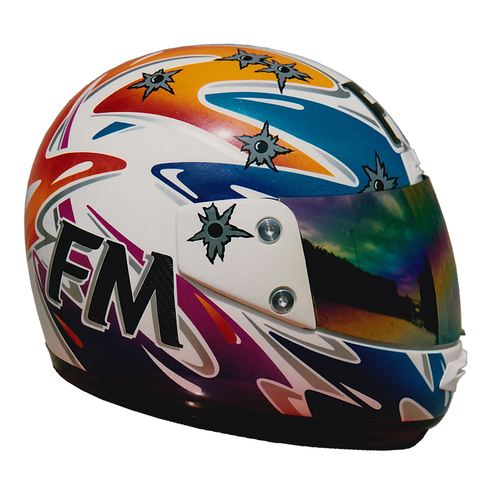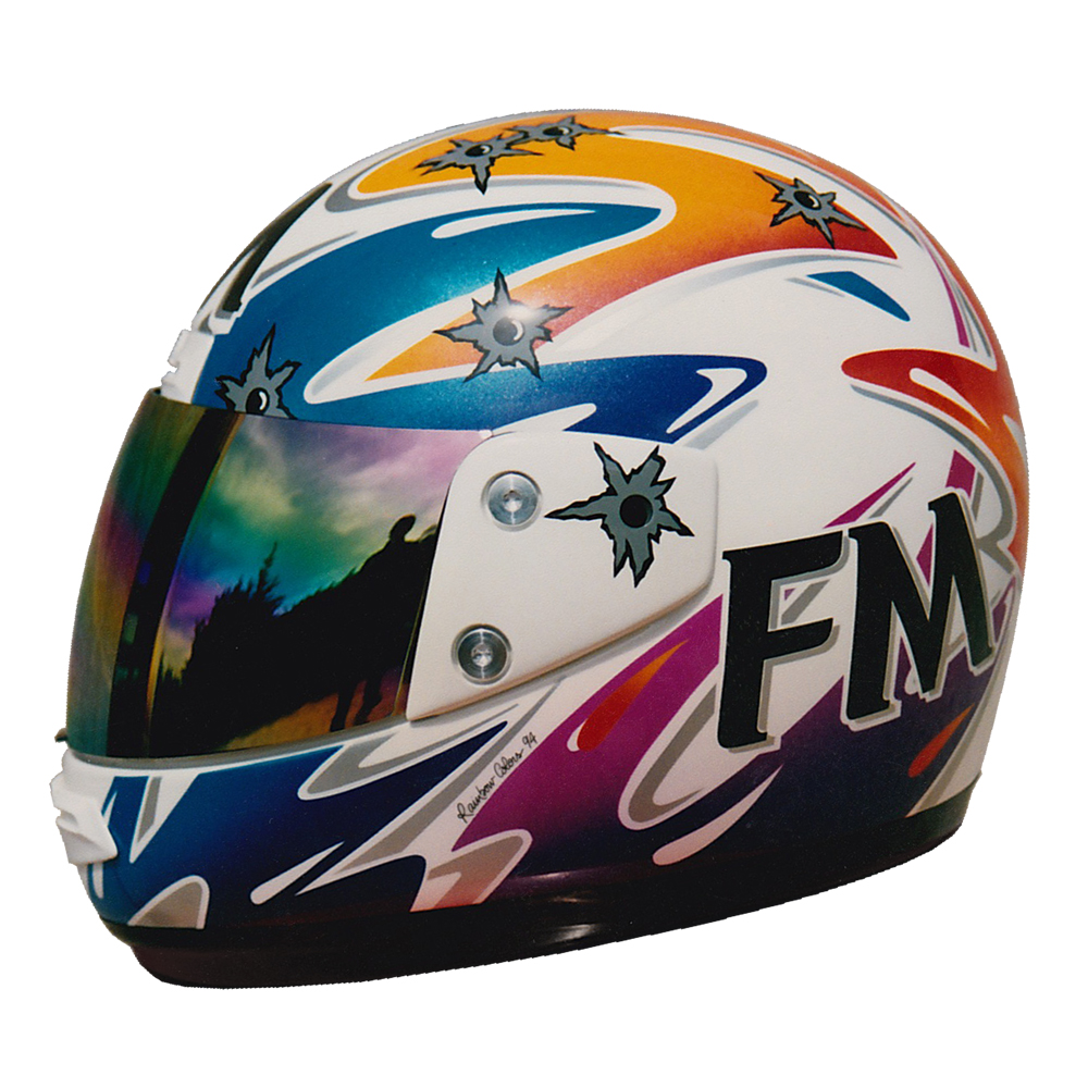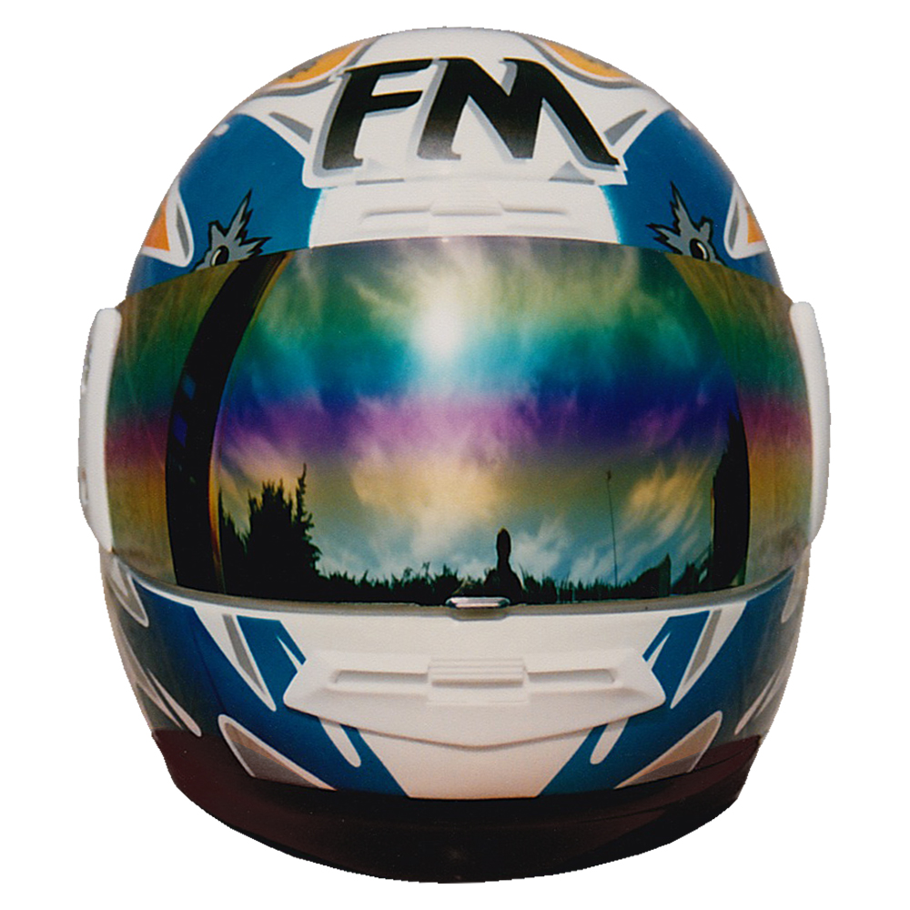 Circuit 1994 Stéphane CHAMBON Casque FM Force One Carbone, peint par Christian Roux / Rainbow Colors en 1994 pour Stéphane Chambon, Team SIMA, Champion de France de Supermotard, Team Ducati, Championnat du Monde d'Endurance. Précédent Suivant