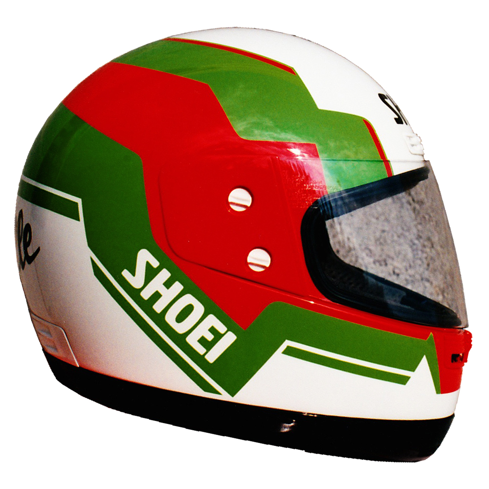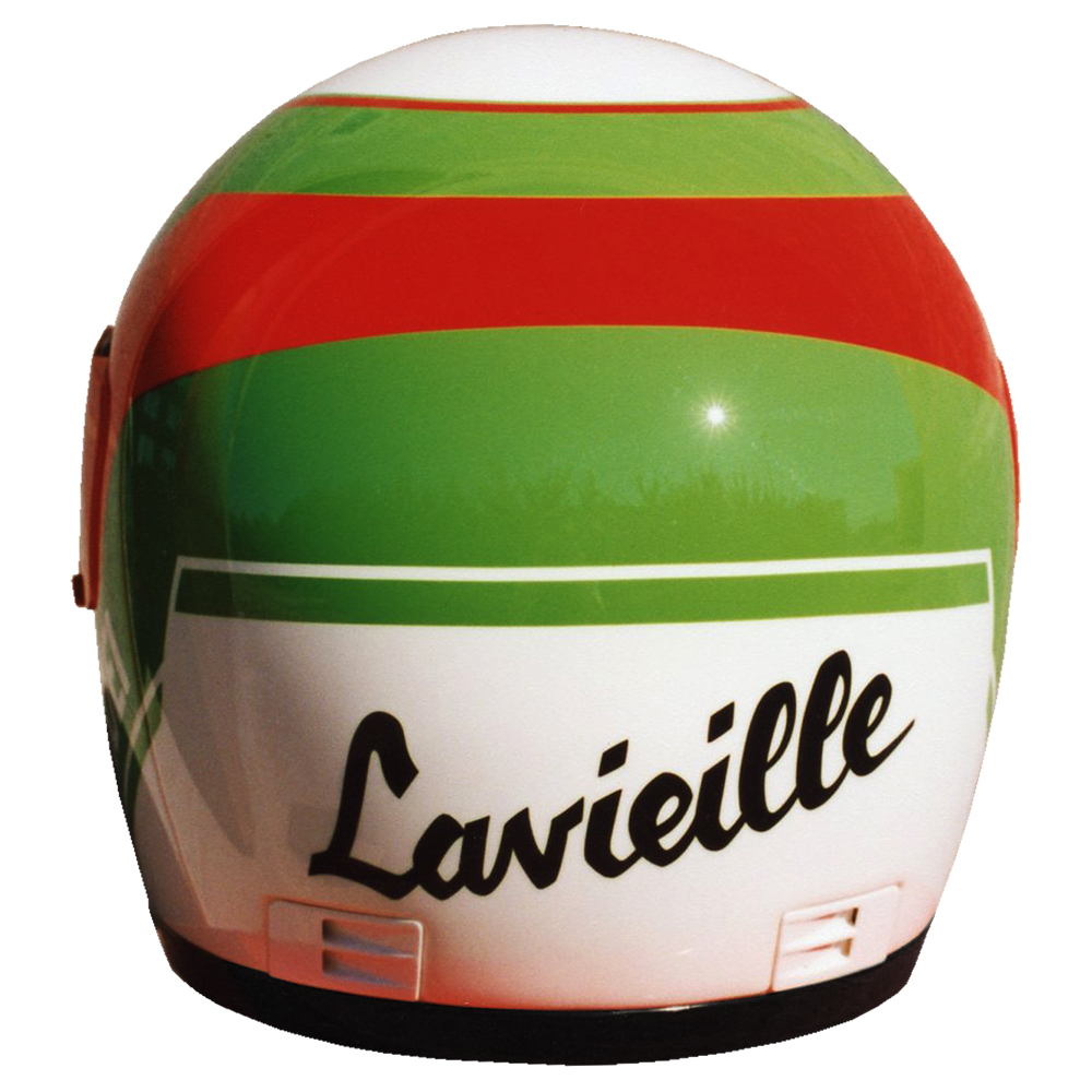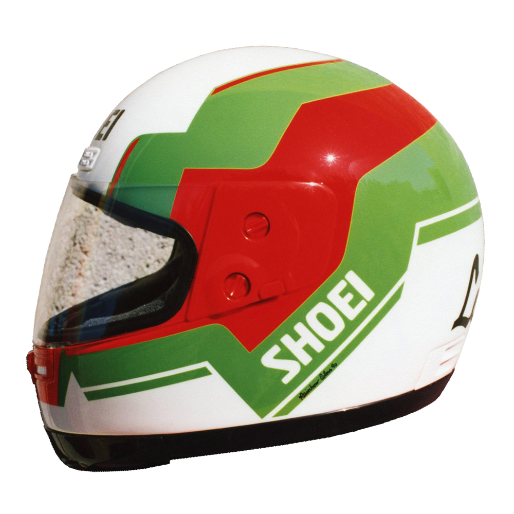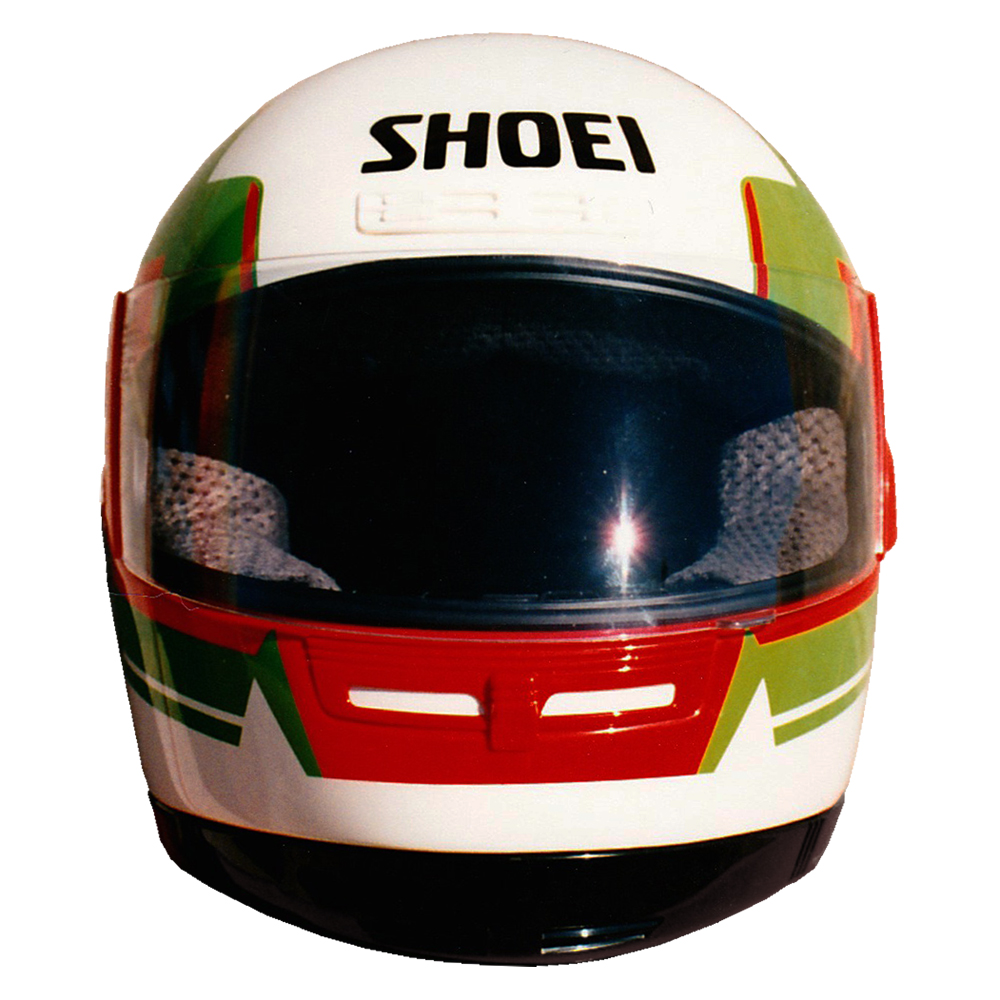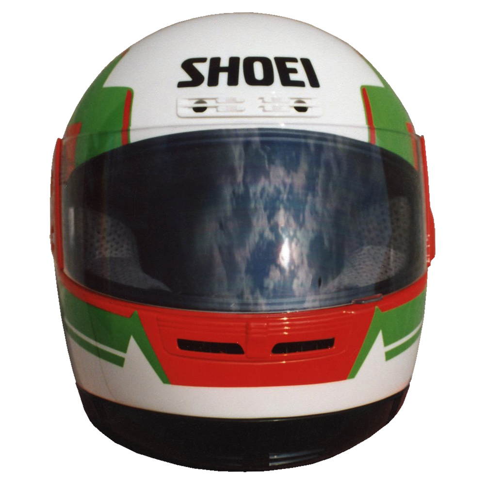 Circuit 1990 Christian LAVIEILLE #1 & #2 Casque Shoei GRV, crée et peint par Christian Roux / Rainbow Colors en 1990 pour Christian Lavieille, Yamaha, Championnat du Monde de Superbike. Précédent Suivant