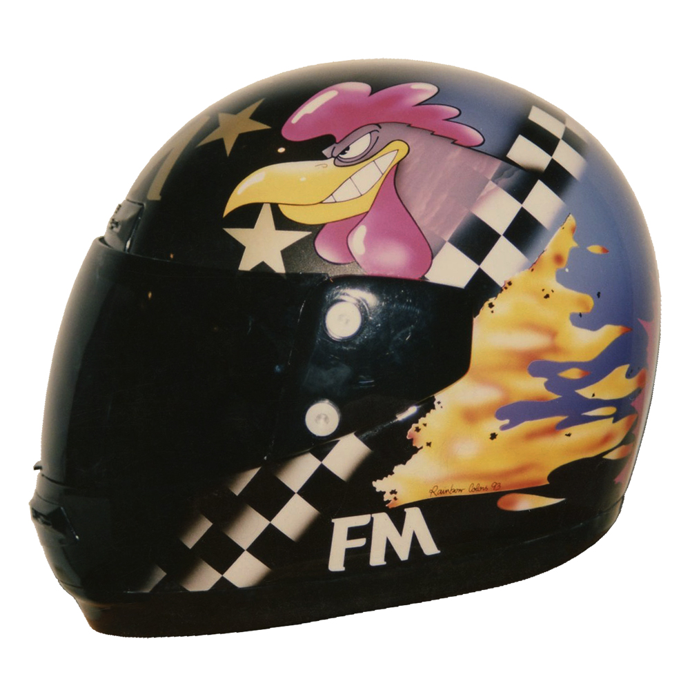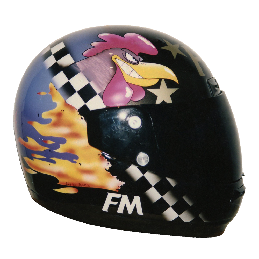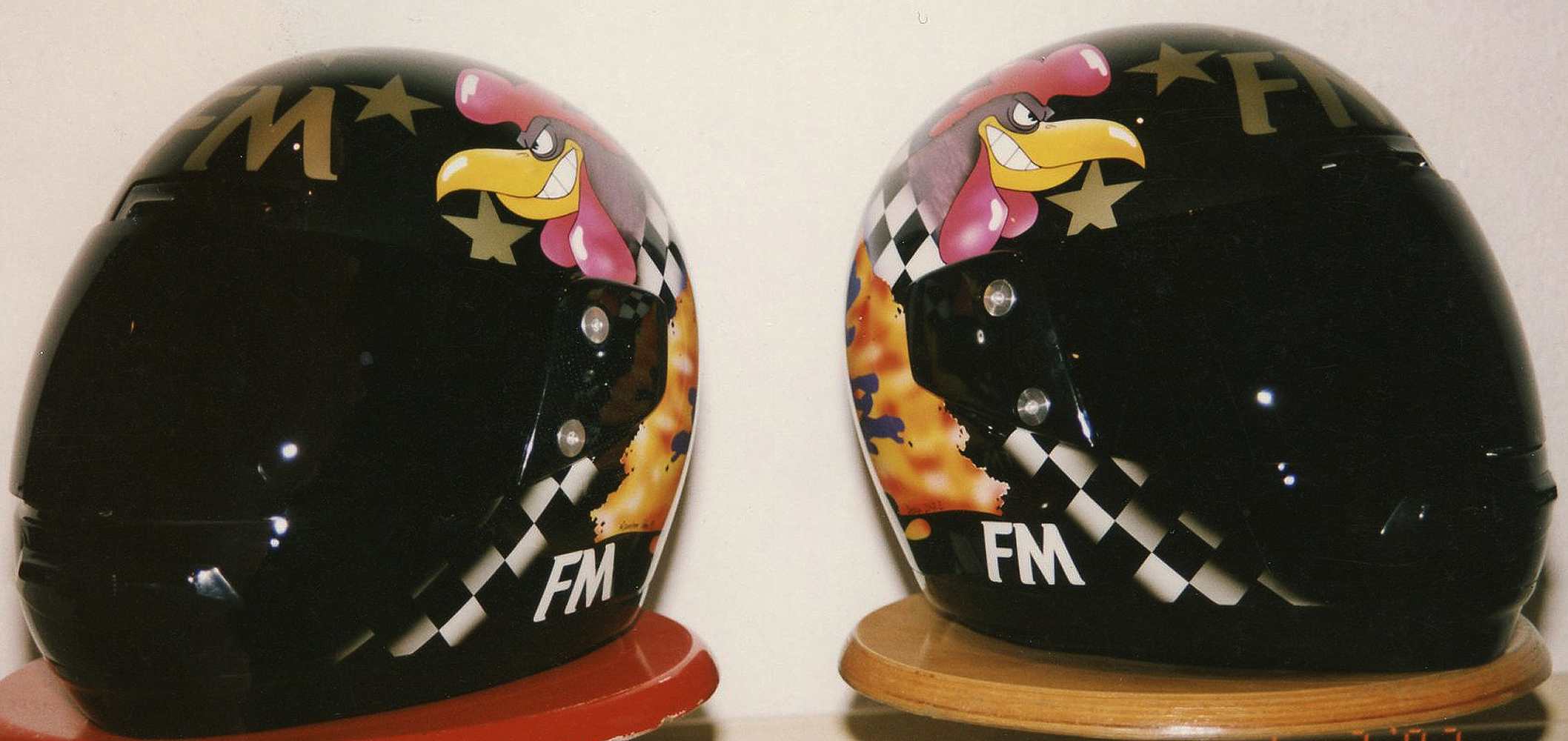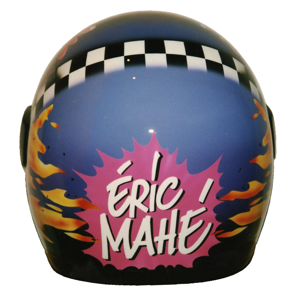 Circuit 1993 Eric MAHÉ #1 & #2 Casque FM Force One, peint par Christian Roux / Rainbow Colors en 1993 pour Eric Mahé, Championnat de France SuperSport 600. Précédent Suivant