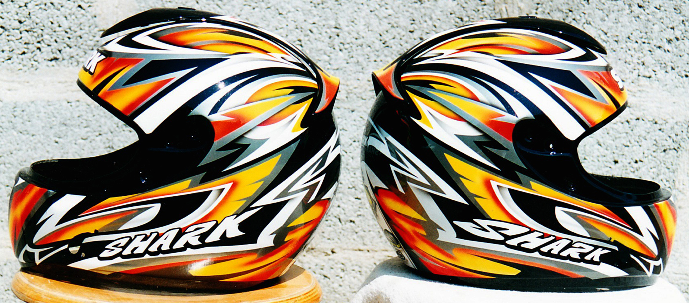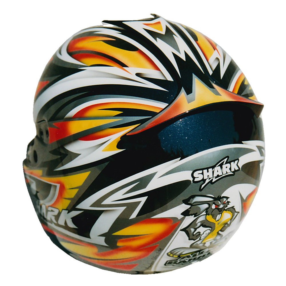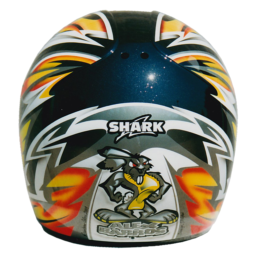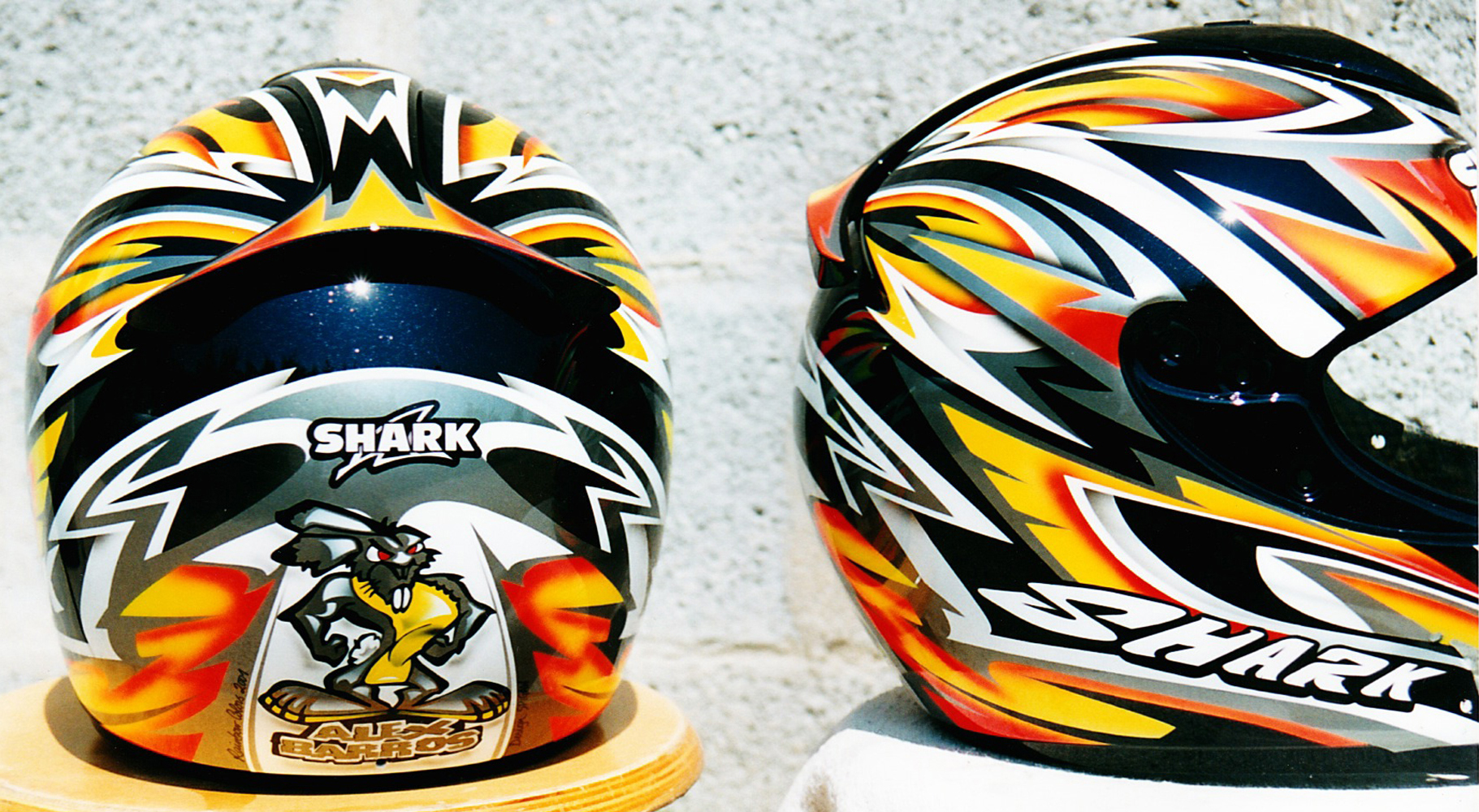 Circuit 2001 Alex BARROS #1 & #2 Casques Shark RSR 2, peints par Christian Roux / Rainbow Colors en 2001 pour Alex Barros, Team Honda Racing West, 4ème du Championnat du Monde 500. Précédent Suivant