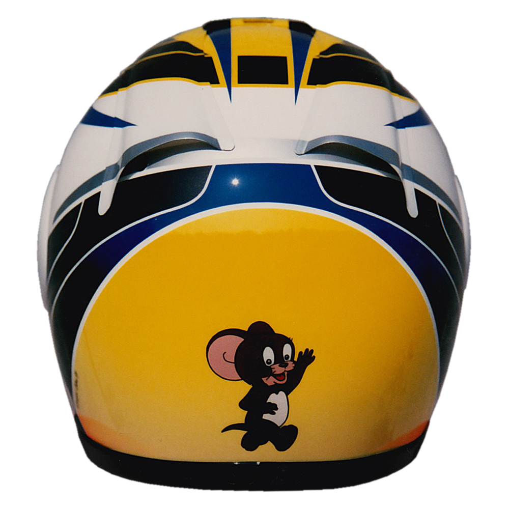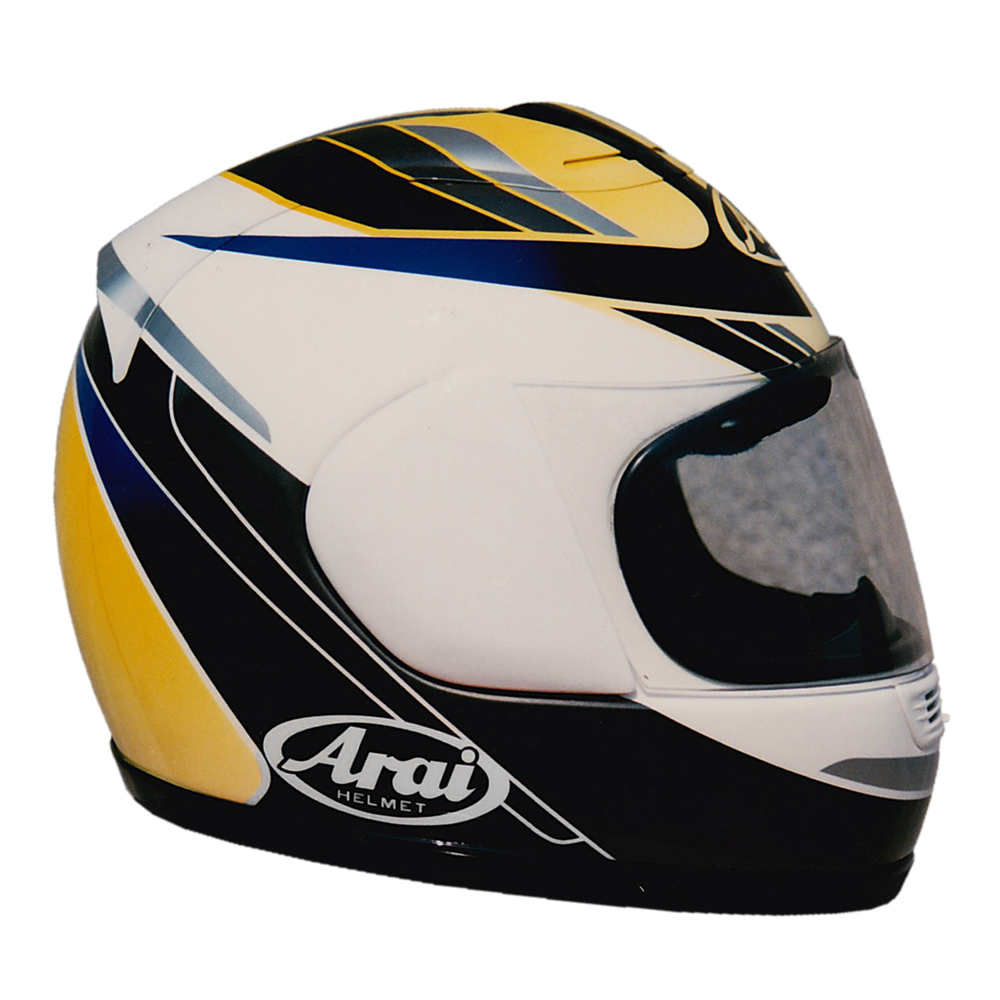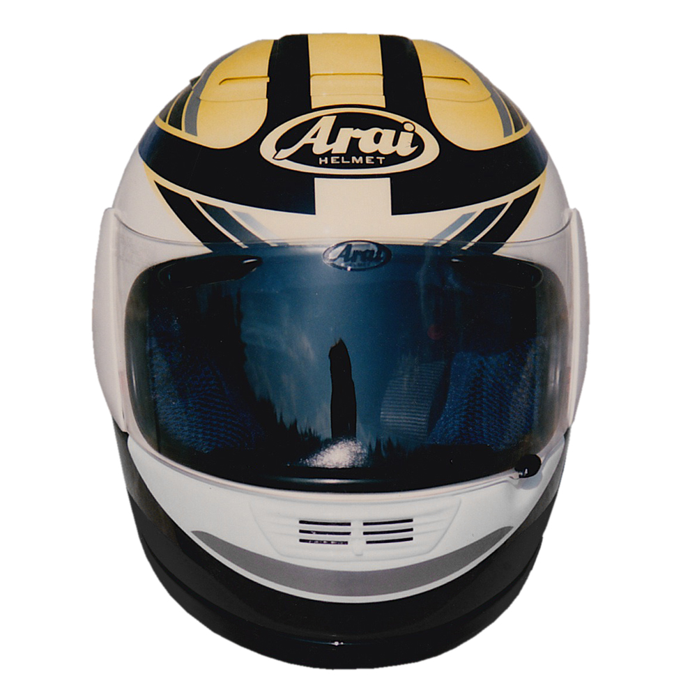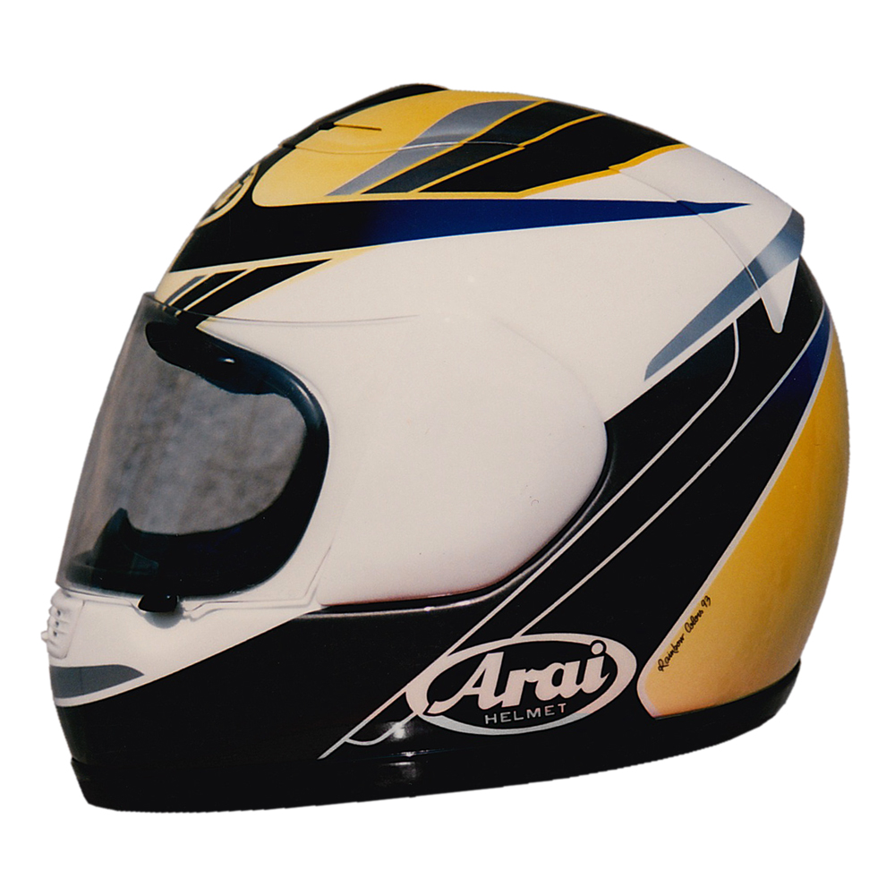 Tourisme 1993 Eric CÉLIS #1 Casque Arai RX 7, peint par Christian Roux / Rainbow Colors en 1993 pour Eric Célis, pilote essayeur pour le magazine Moto Revue. Précédent Suivant