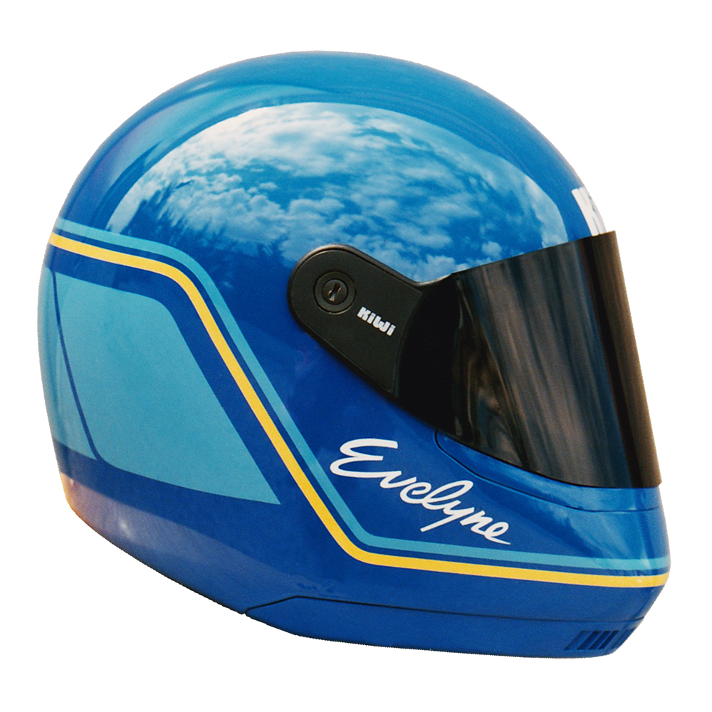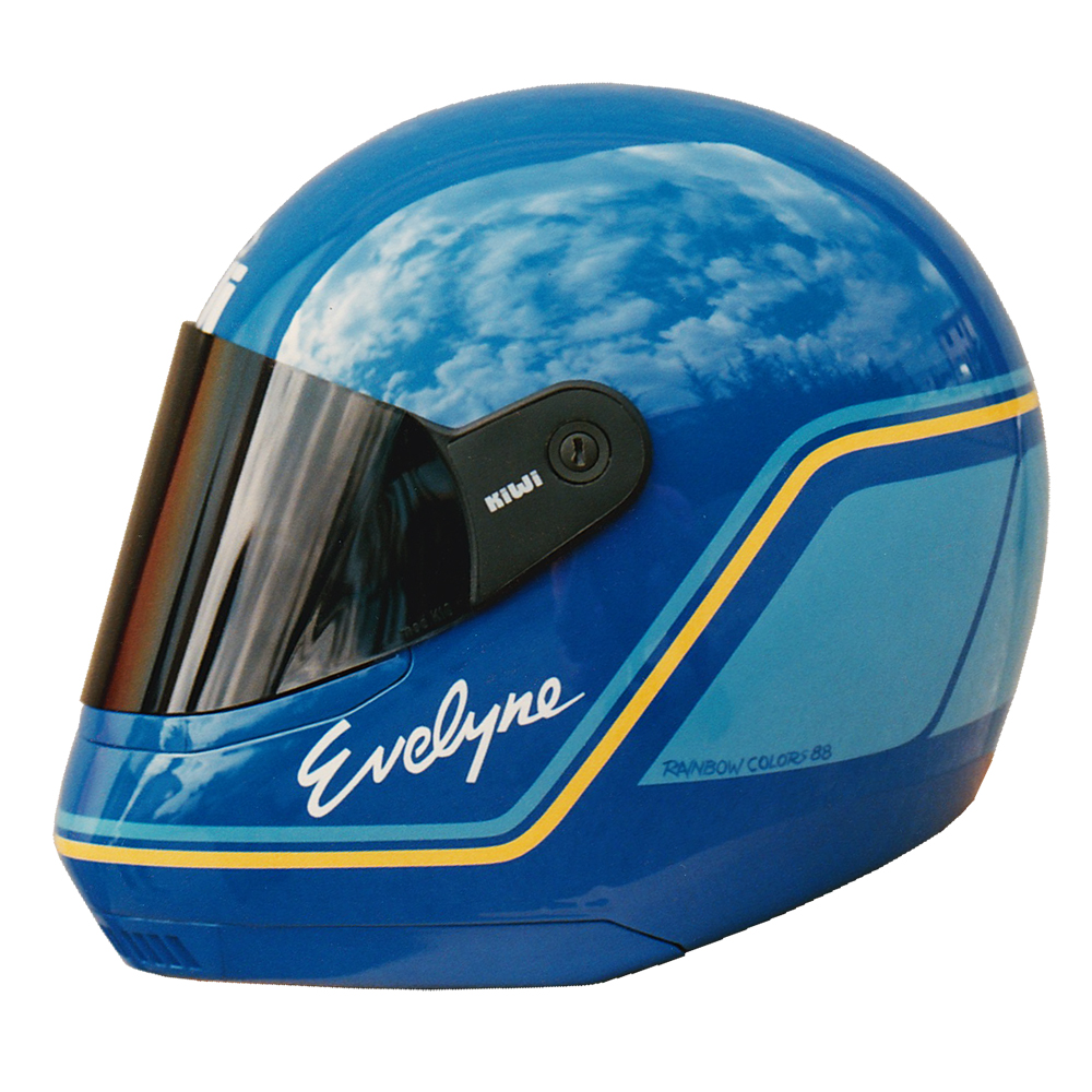 Tourisme 1988 Evelyne BECKER Casque Kiwi K 14, peint par Christian Roux / Rainbow Colors en 1988 pour Evelyne Becker. Précédent Suivant