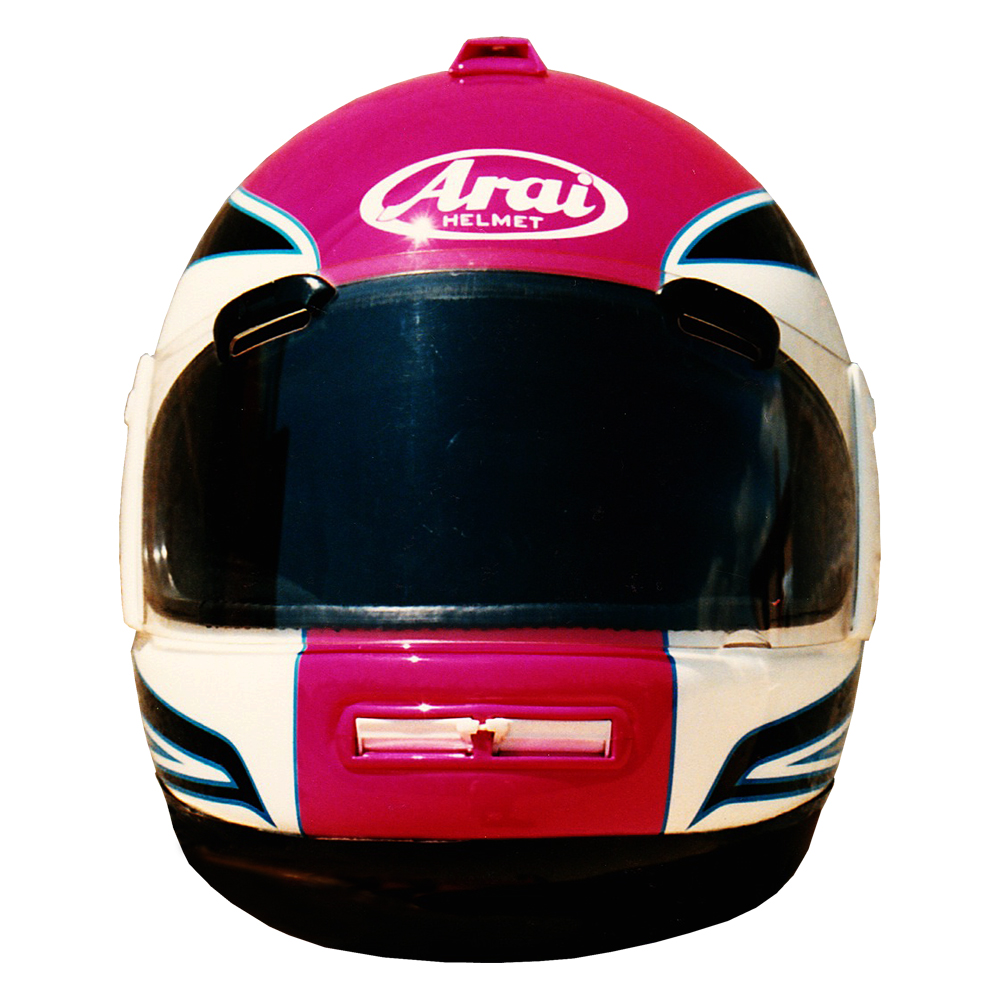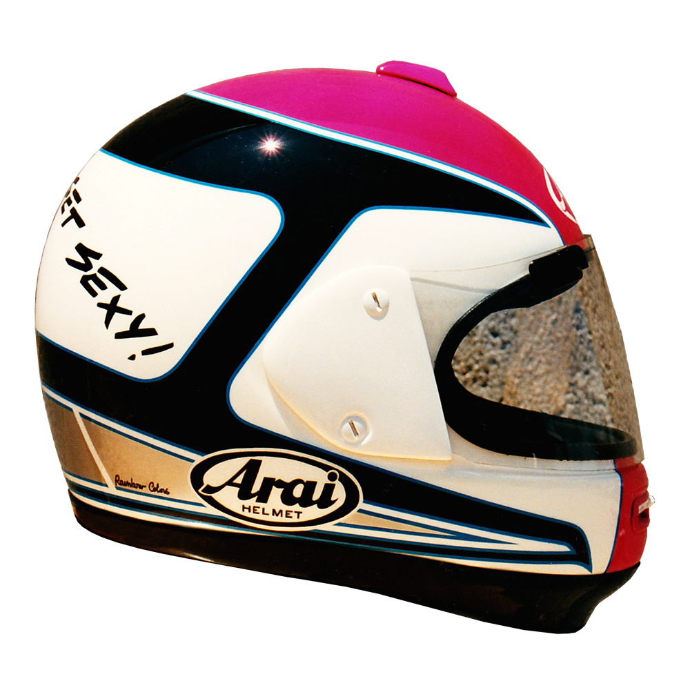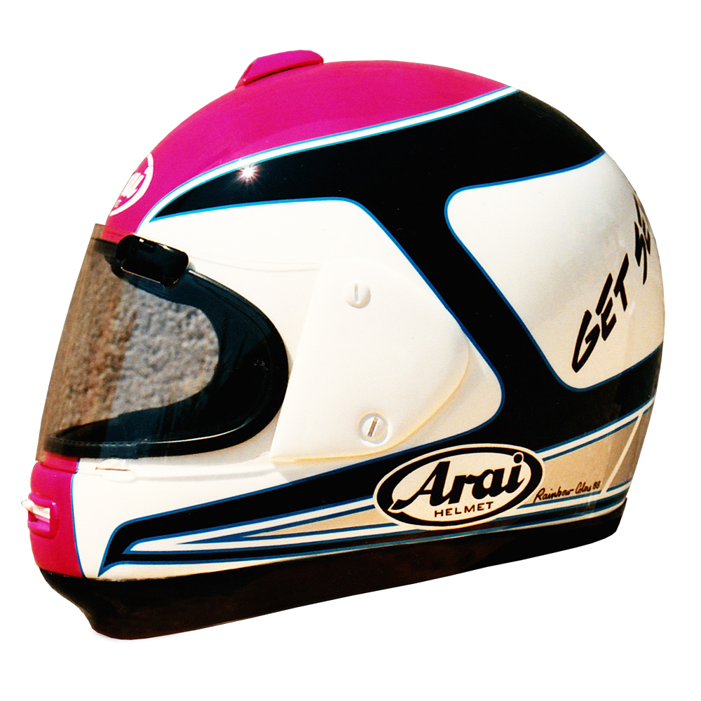 Tourisme 1988 Philippe GORCE Casque Arai Giga, peint par Christian Roux / Rainbow Colors en 1988 pour Philippe Gorce, rédacteur Moto Revue. Précédent Suivant