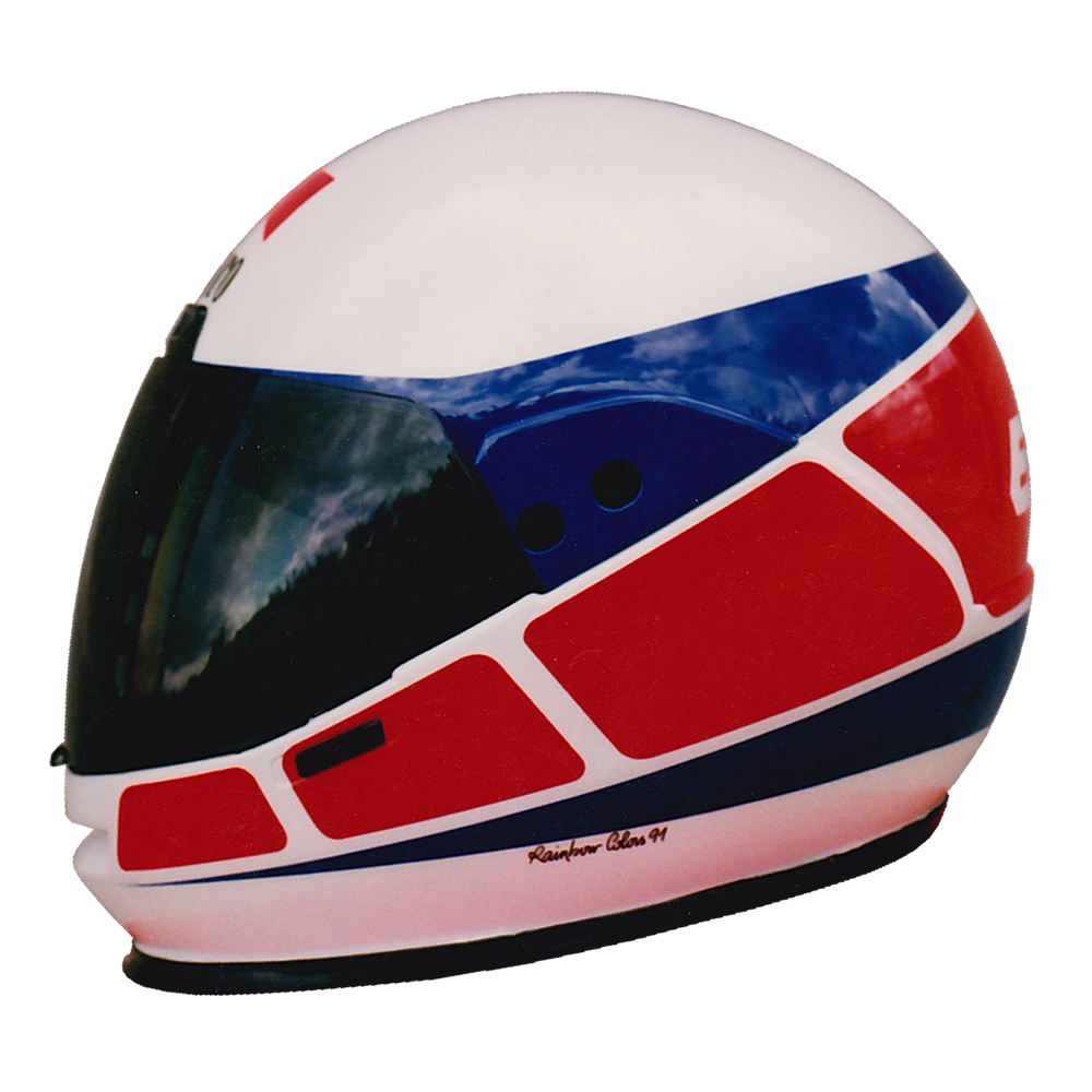 Tourisme 1991 Narcisse CIAMARONE Casque moto, crée et peint par Christian Roux / Rainbow Colors en 1991 pour Narcisse Ciamarone. Précédent Suivant