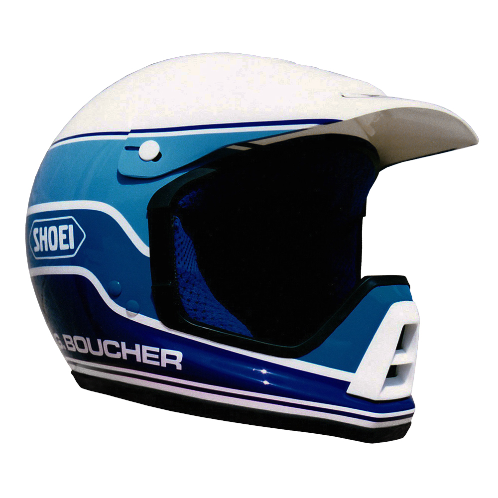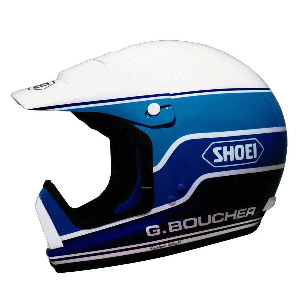 Tout Terrain 1989 Gilles BOUCHER #3 Casque Shoei VX3-A, peint par Christian Roux / Rainbow Colors en 1989 pour Gilles Boucher. Précédent Suivant