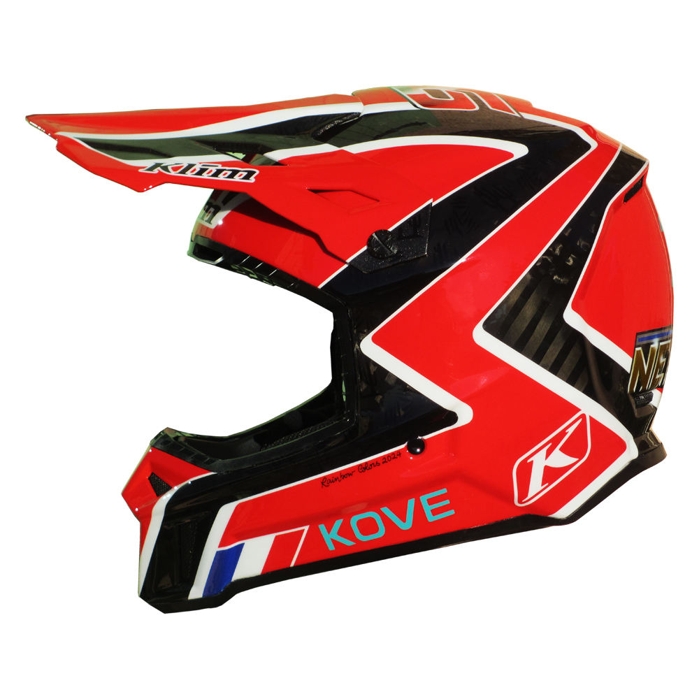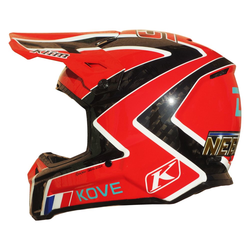 Tout Terrain 2024 Neels THERIC Casque Klim F3 Carbon, crée et peint par Christian Roux / Rainbow Colors en 2024 pour Neels Theric, Team Kove Racing, Vainqueur Taklimakan Rally 2024, Rally Raid Dakar 2025. Suivant