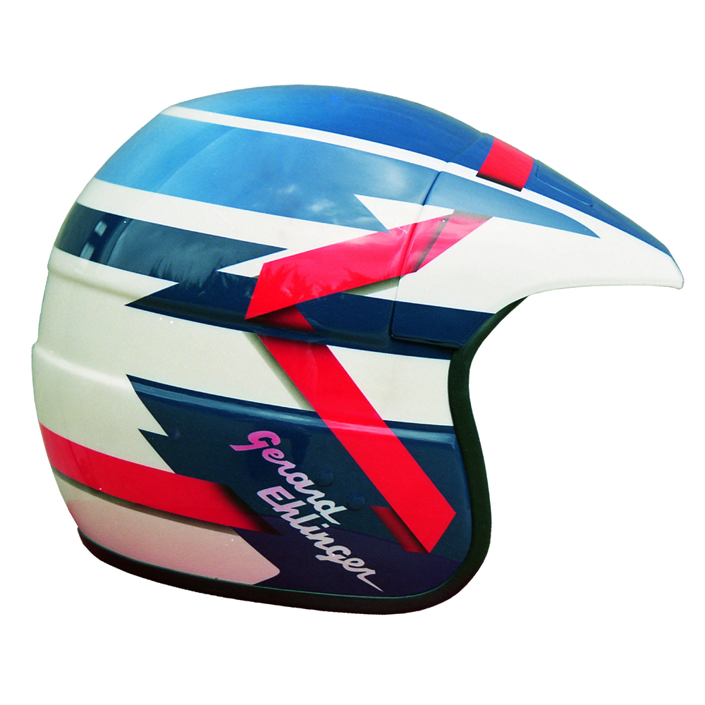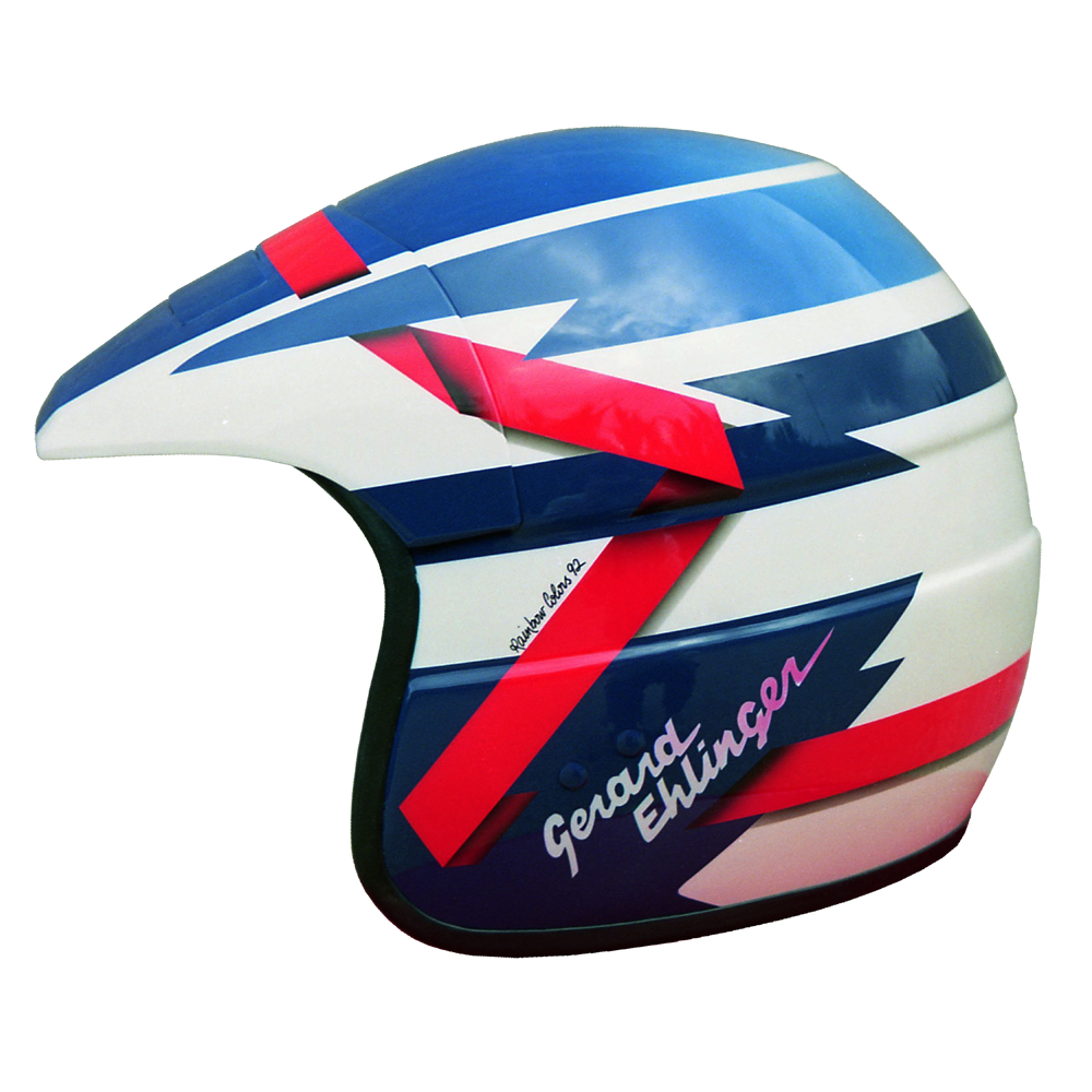Tout Terrain 1992 Gérard EHLINGER Casque JT ALS-1, crée et peint par Christian Roux / Rainbow Colors en 1992 pour Gérard Ehlinger, pilote motocross et enduro, journaliste essayeur Moto Crampons. Précédent Suivant