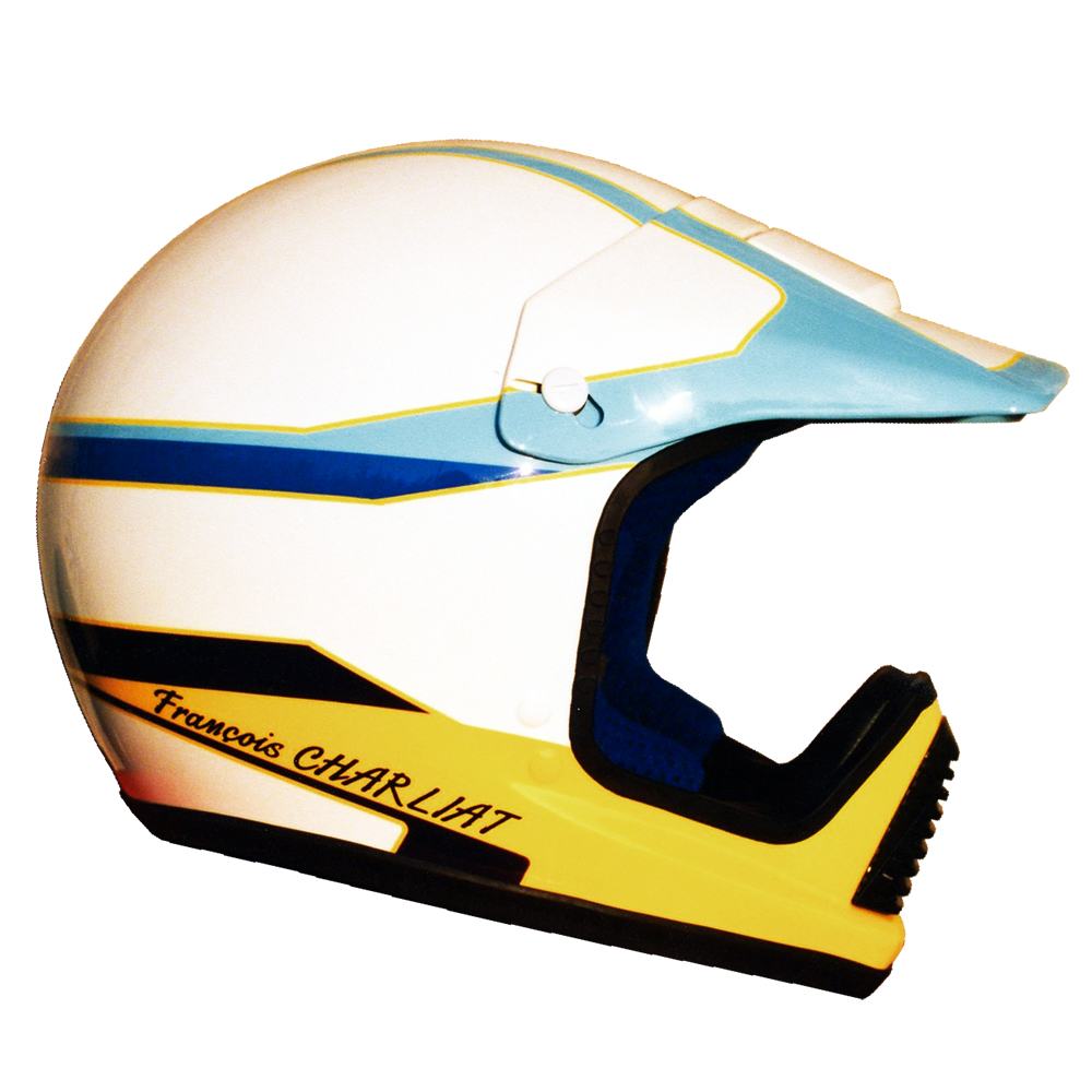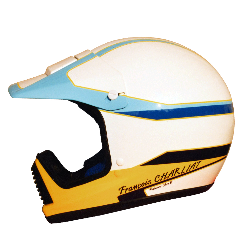 Tout Terrain 1989 François CHARLIAT Casque Shoei VX 3 A, crée et peint par Christian Roux / Rainbow Colors en 1989 pour François Charliat, Honda France. Précédent Suivant
