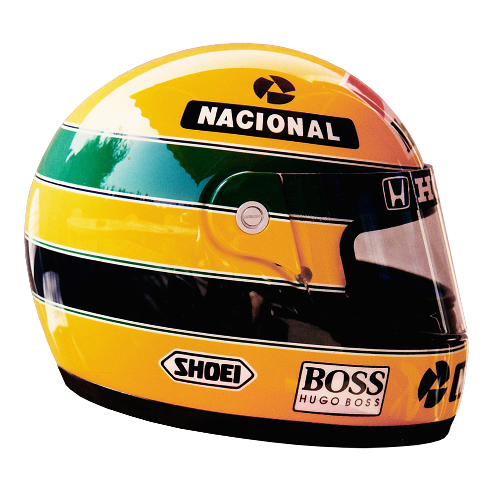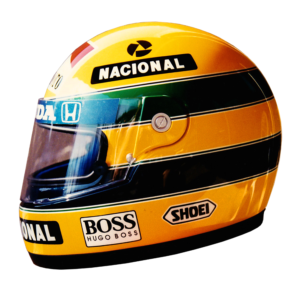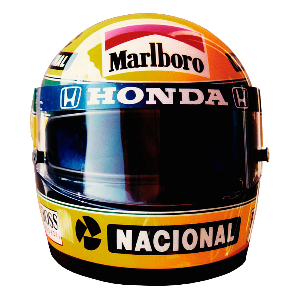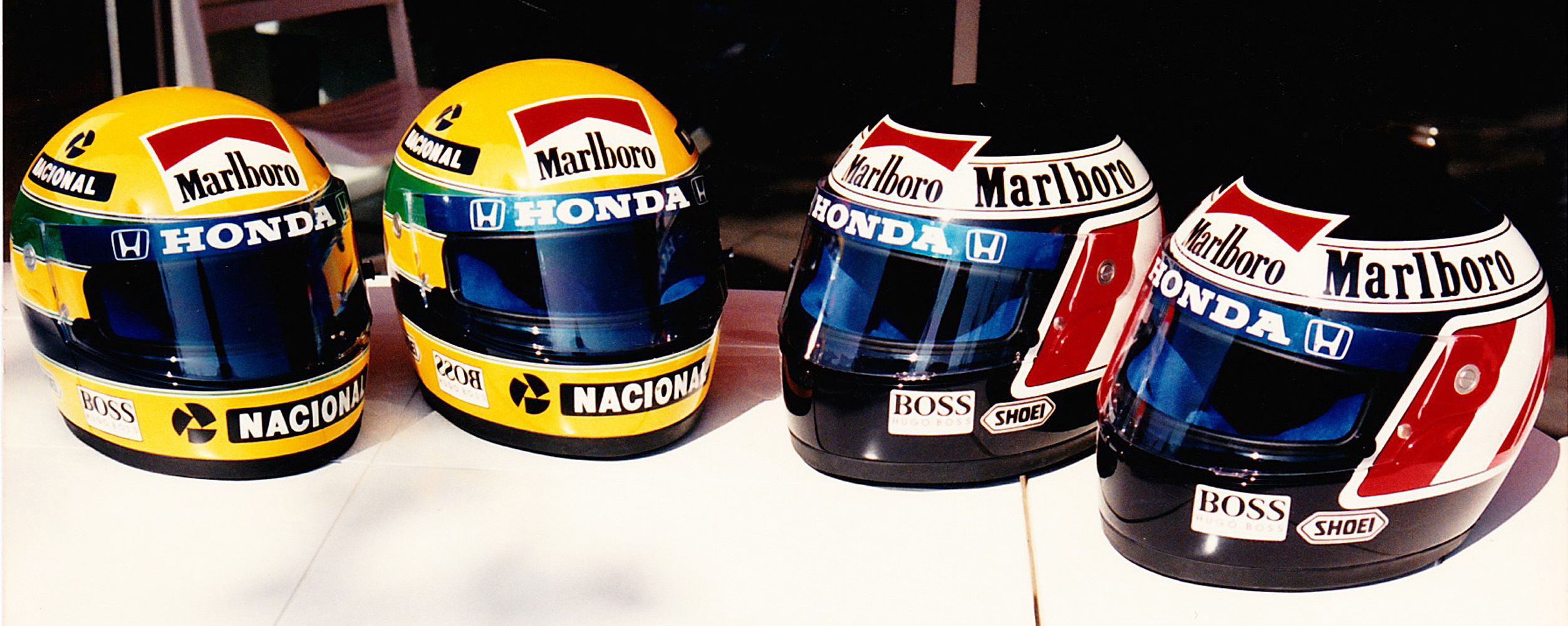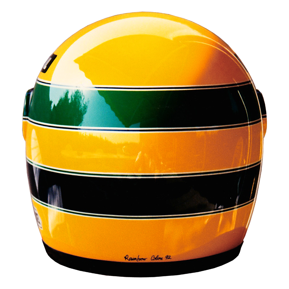 Promotion Publicité 1992 MARLBORO Promotion Ayrton SENNA Casques Shoei GRV 4, peints par Christian Roux / Rainbow Colors en 1992, commande de Philip Morris de répliques du casque d' Ayrton Senna pour la promotion de la marque Marlboro. Précédent Suivant