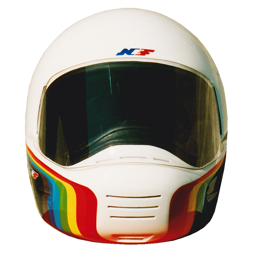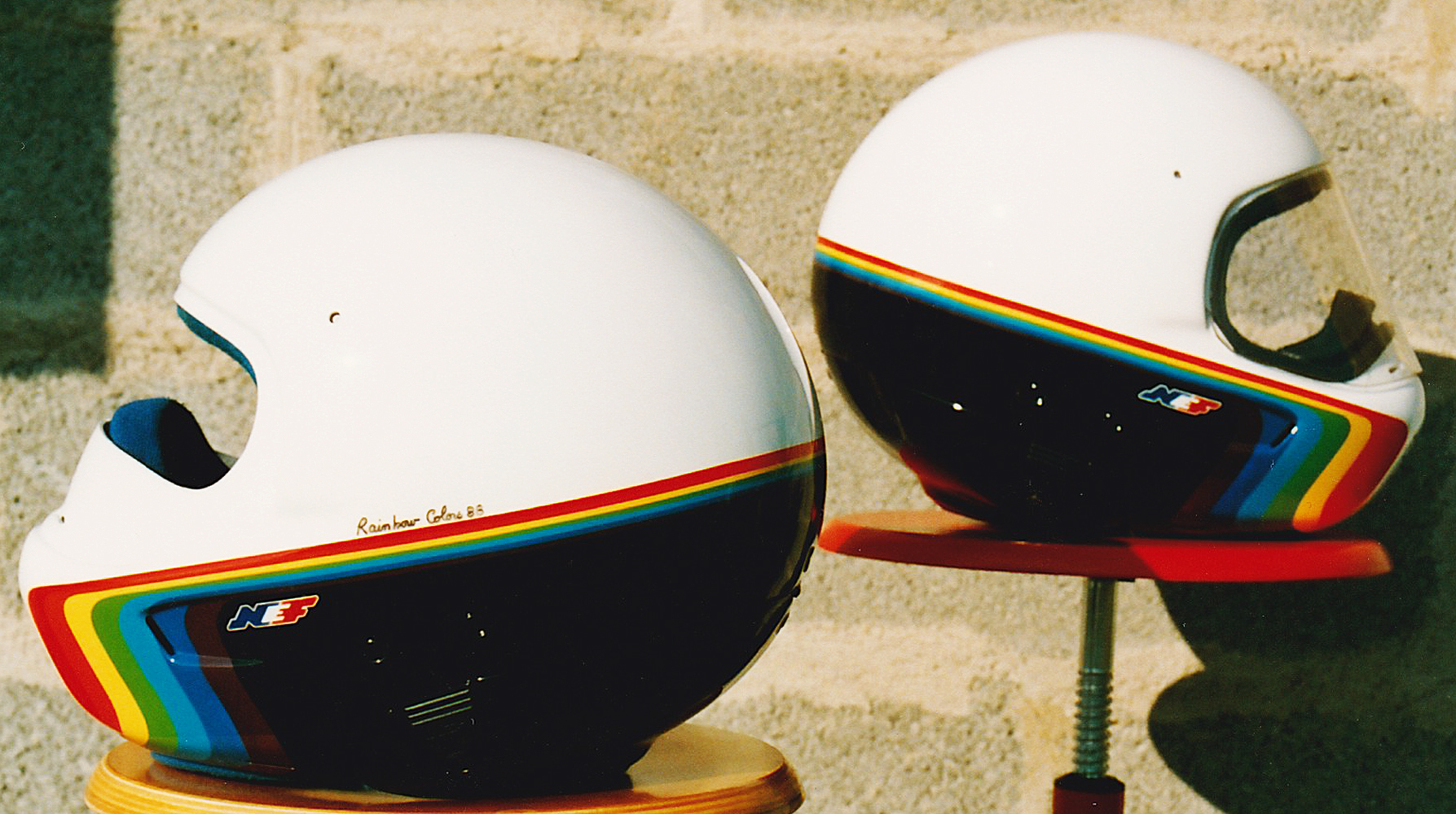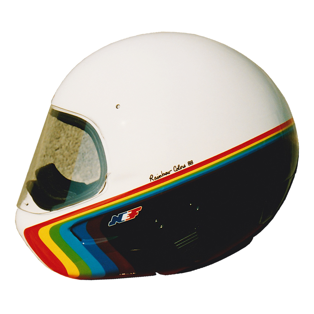 Promotion Publicité 1988 NEFSUD RAINBOW Casques NefSud, crées et peints par Christian Roux / Rainbow Colors en 1988 pour Jacques Samalens, projet distribution NefSud. Précédent Suivant