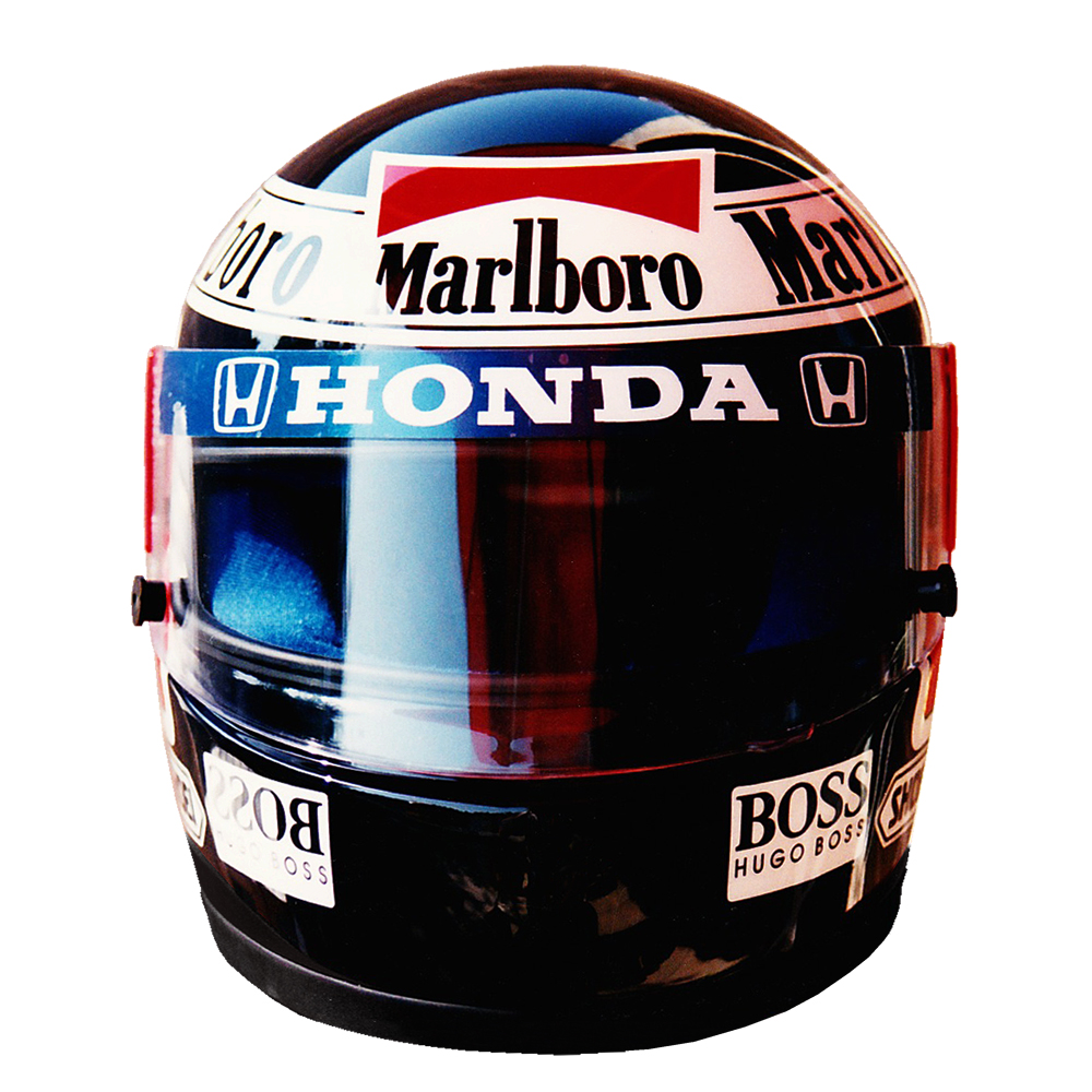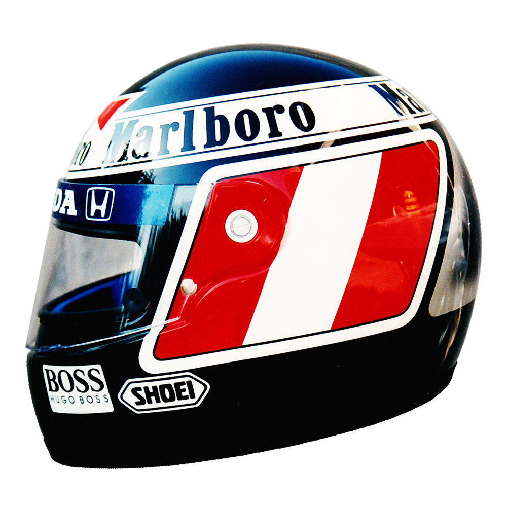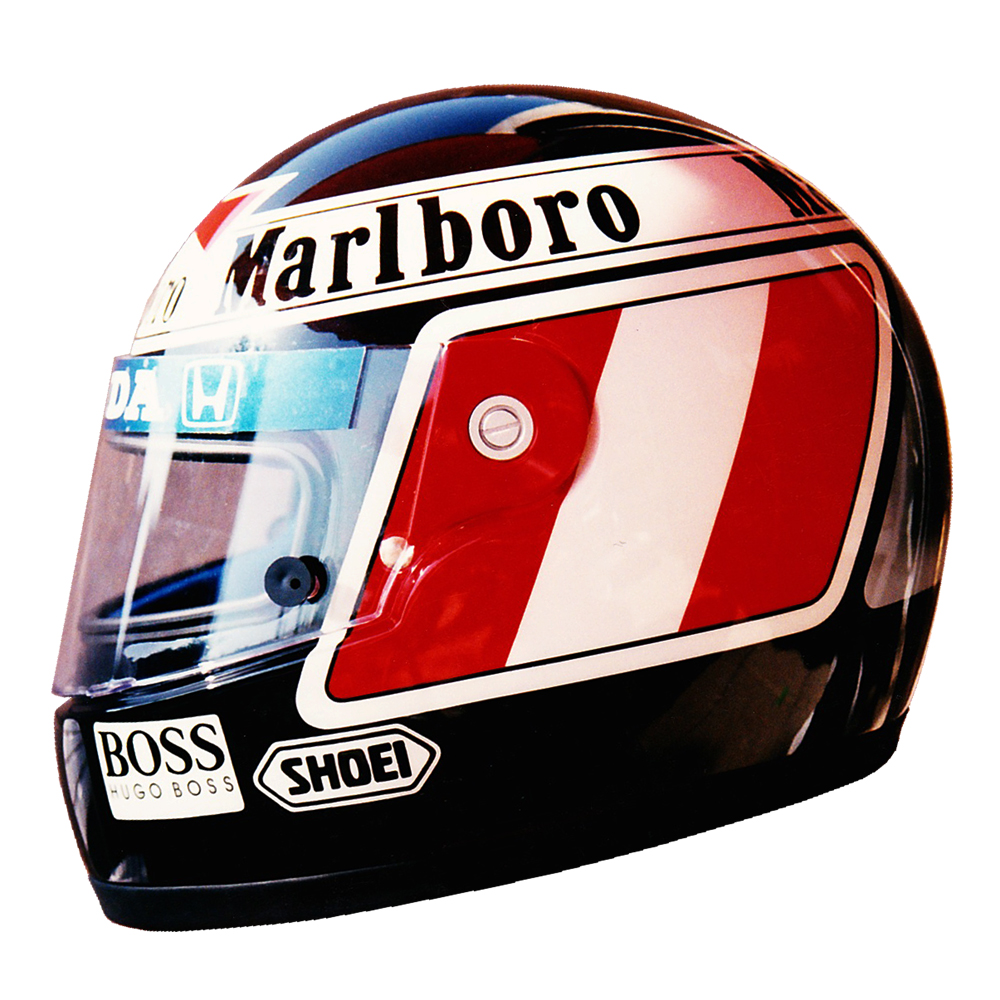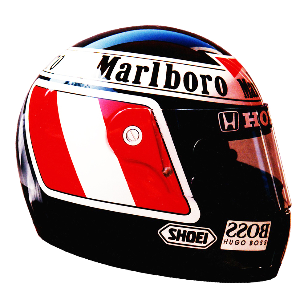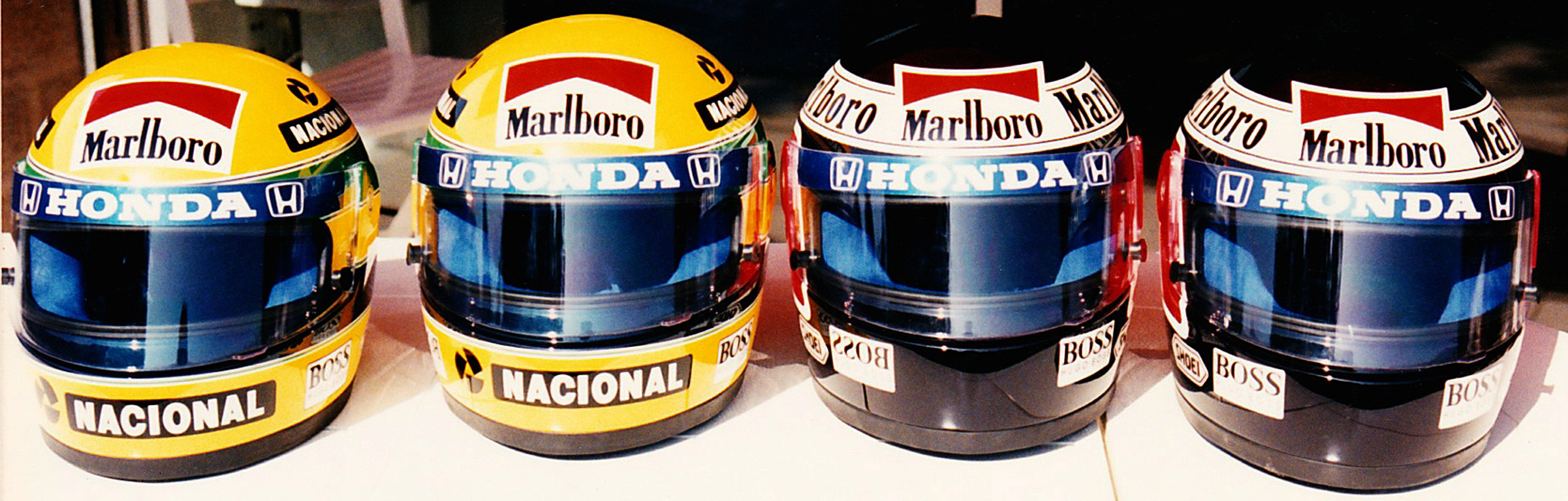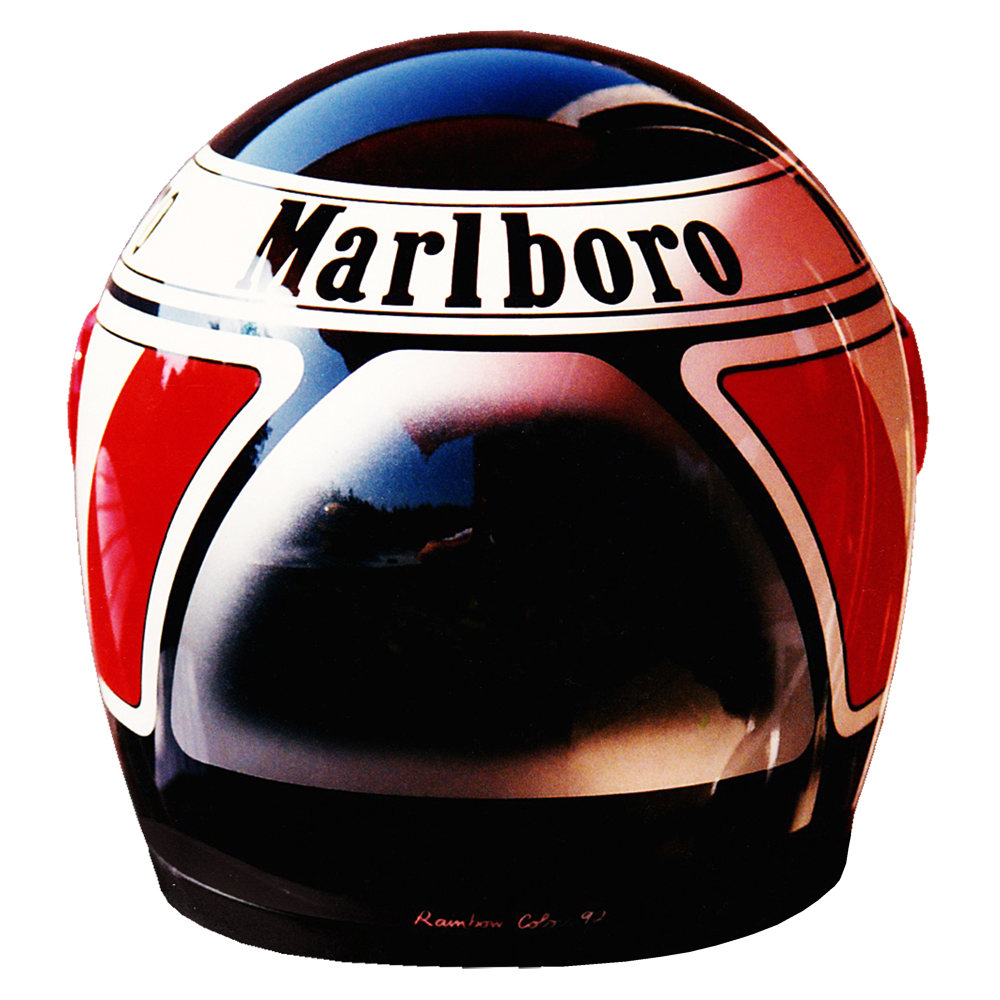 Promotion Publicité 1992 MARLBORO Promotion Gerhard BERGER Casques Shoei GRV 4, peints par Christian Roux / Rainbow Colors en 1992, commande de Philip Morris de répliques du casque de Gerhard Berger pour la promotion de la marque Marlboro. Précédent Suivant