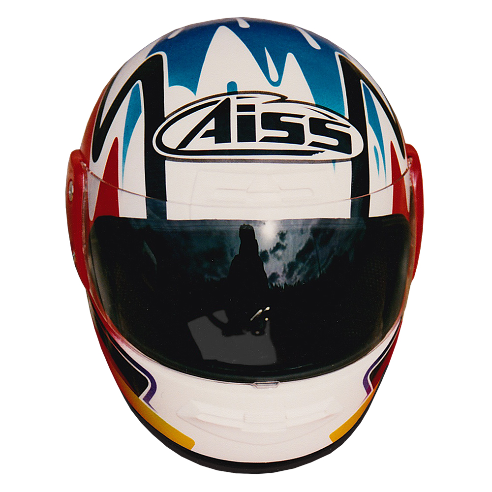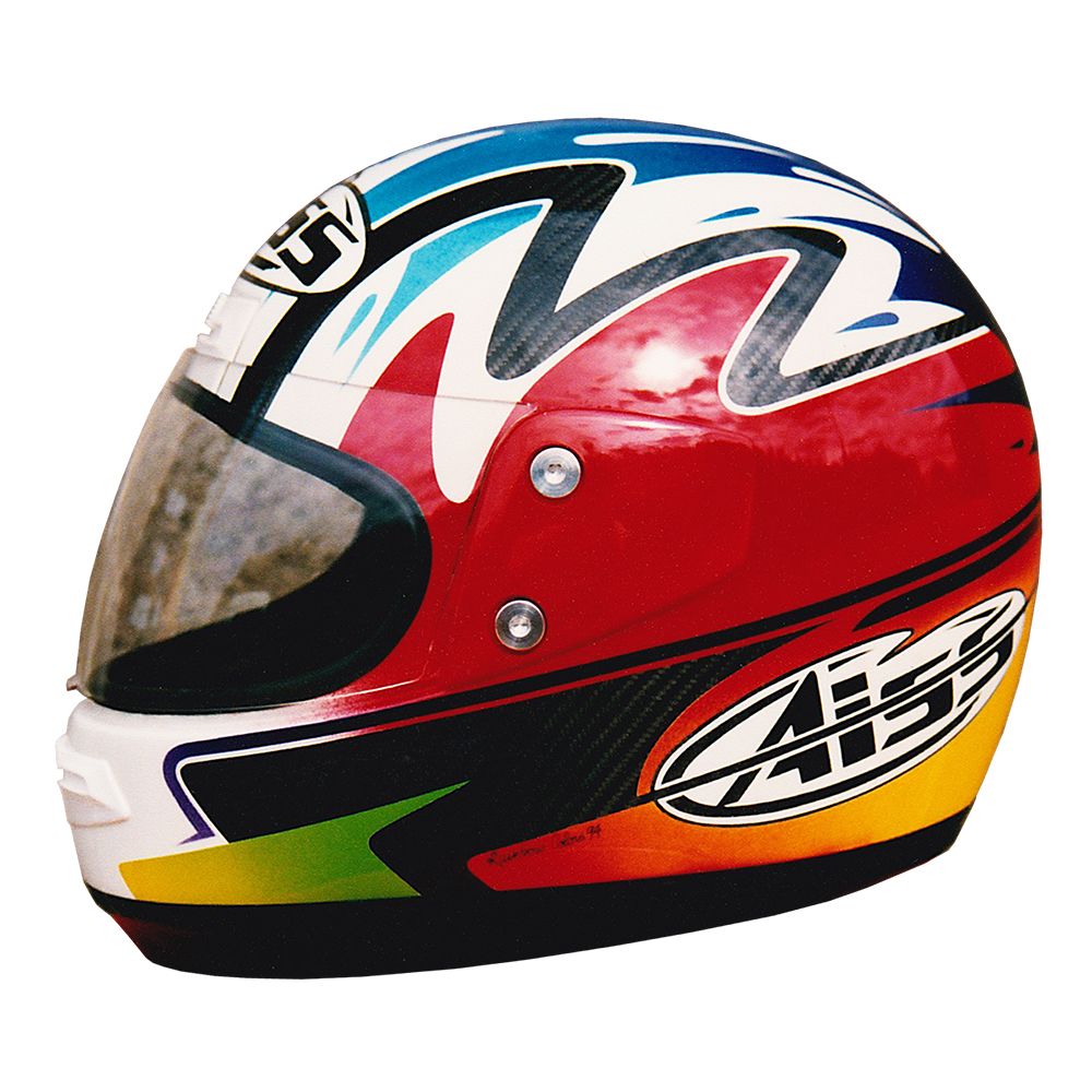 Prototype Série 1994 AISS Carbone Casque AISS Carbone, peint par Christian Roux / Rainbow Colors en 1994 pour la marque Aiss. Précédent Suivant