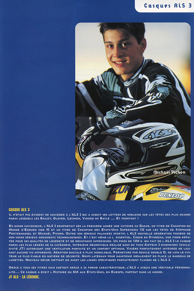 Prototype Série 1996 JT ALS3 Blanc Casque JT ALS3, peint par Christian Roux / Rainbow Colors en 1996 pour la marque JT, design Xavier Marigo. Précédent Suivant